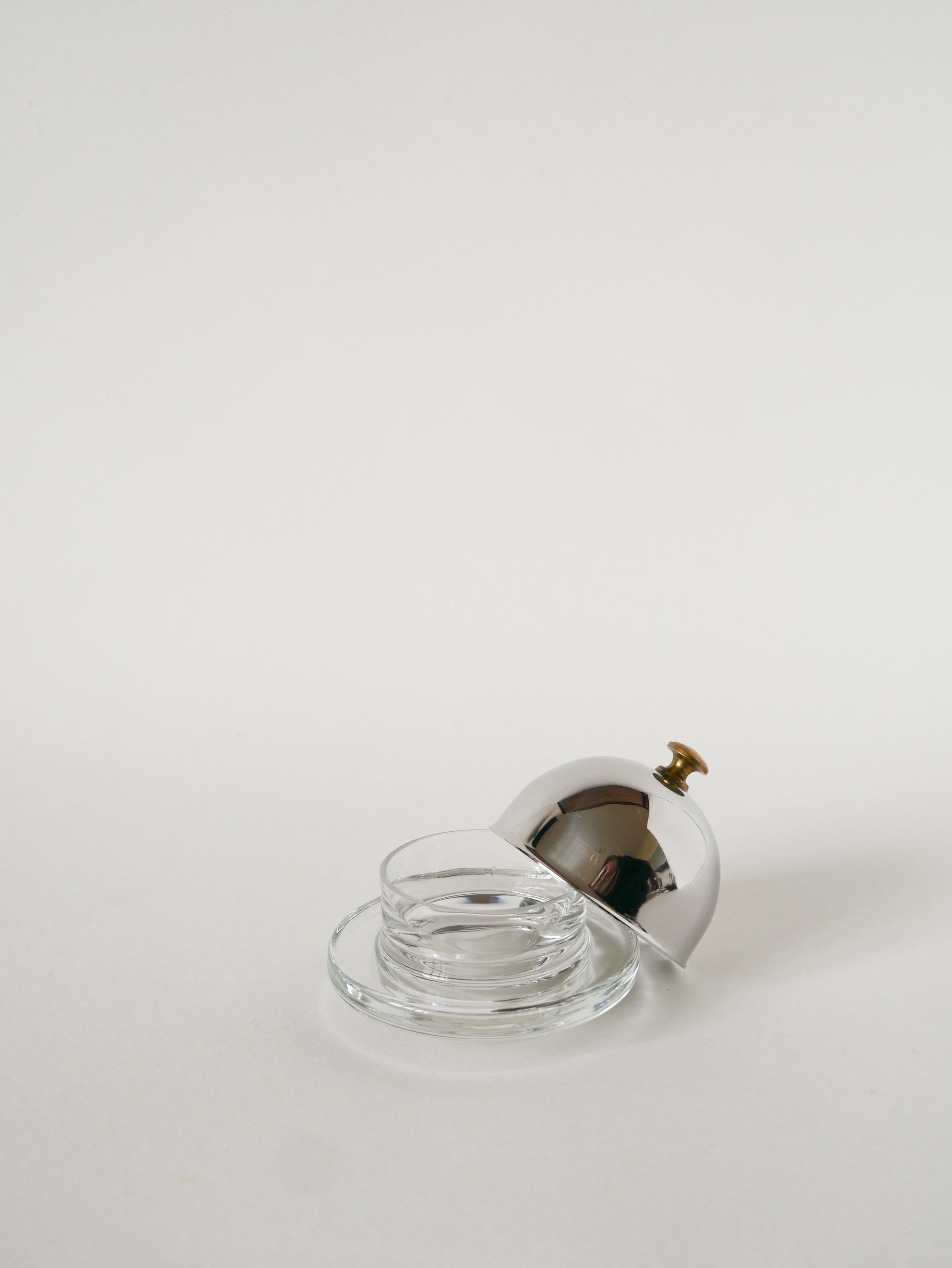 Superbe beurrier en métal argenté, laiton et verre, 1950. En très bon état, de rares traces du temps. Envoi rapide et soigné. Possibilité d'envois groupés - plus économique et plus écologique ! Dimensions : 8 X 10 cm.