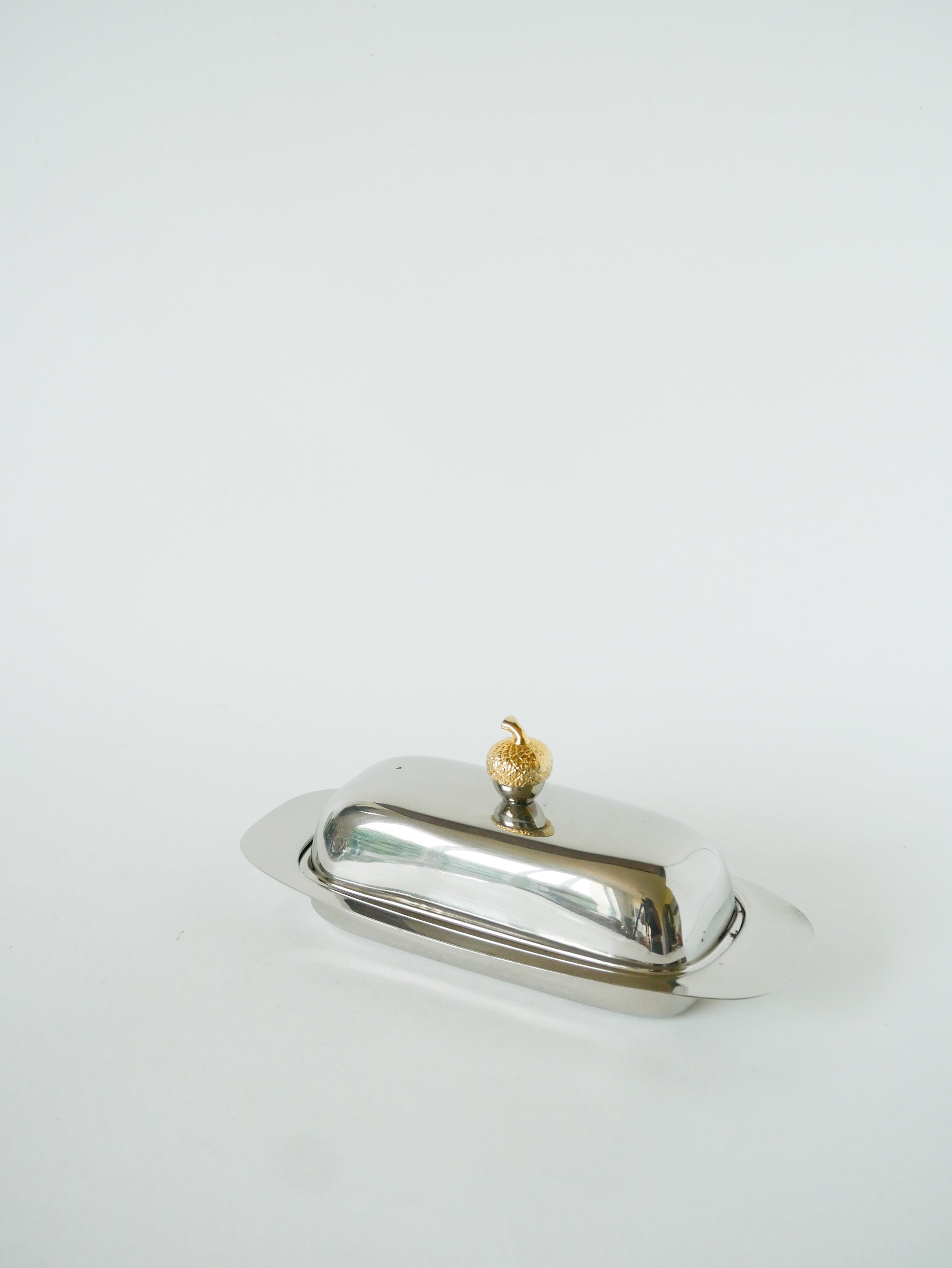 Superbe beurrier en métal argenté, laiton et verre, 1960. En très bon état, de rares traces du temps. Envoi rapide et soigné. Possibilité d'envois groupés - plus économique et plus écologique ! Dimensions : 24 X 9 X 11 cm.