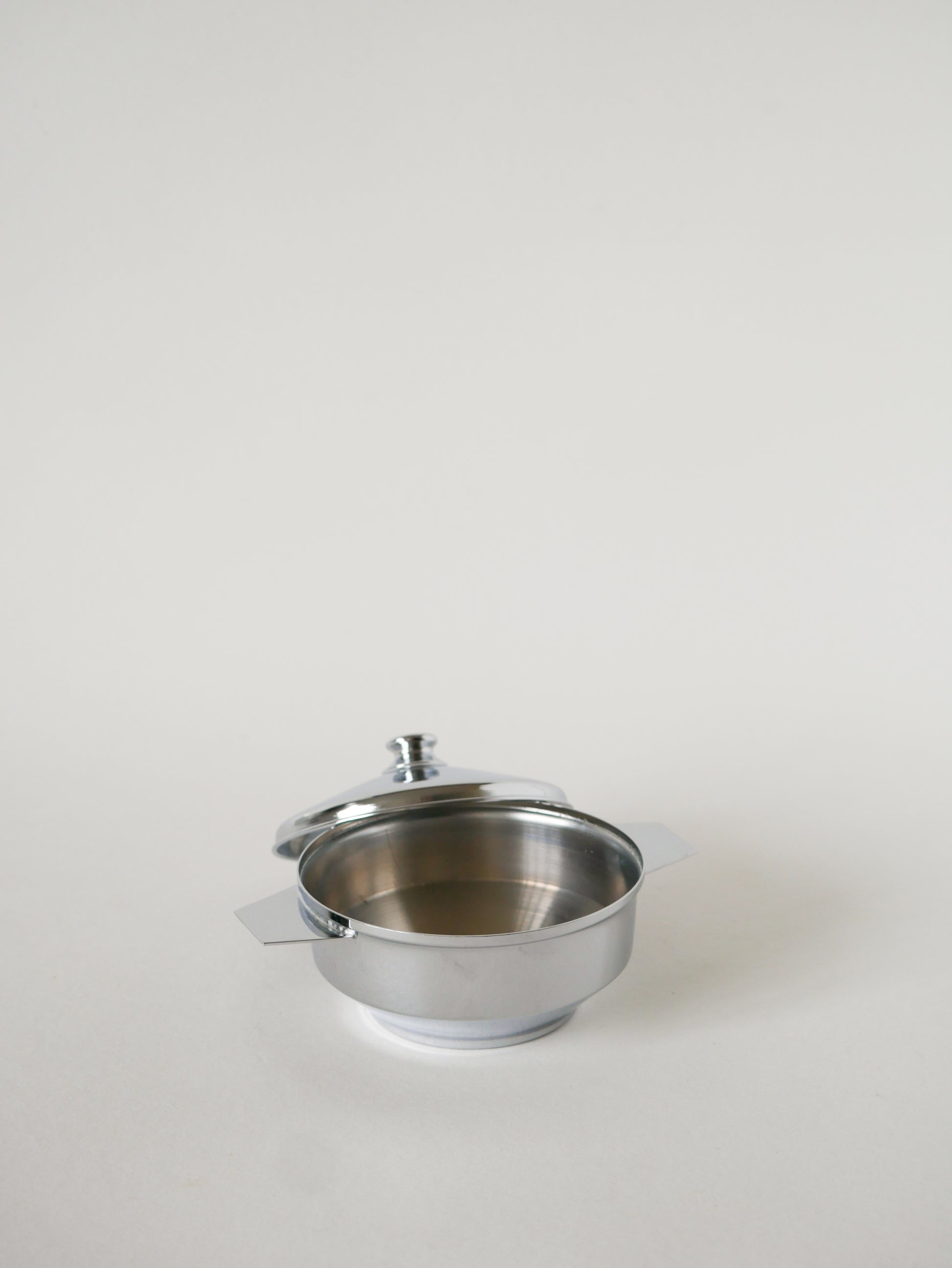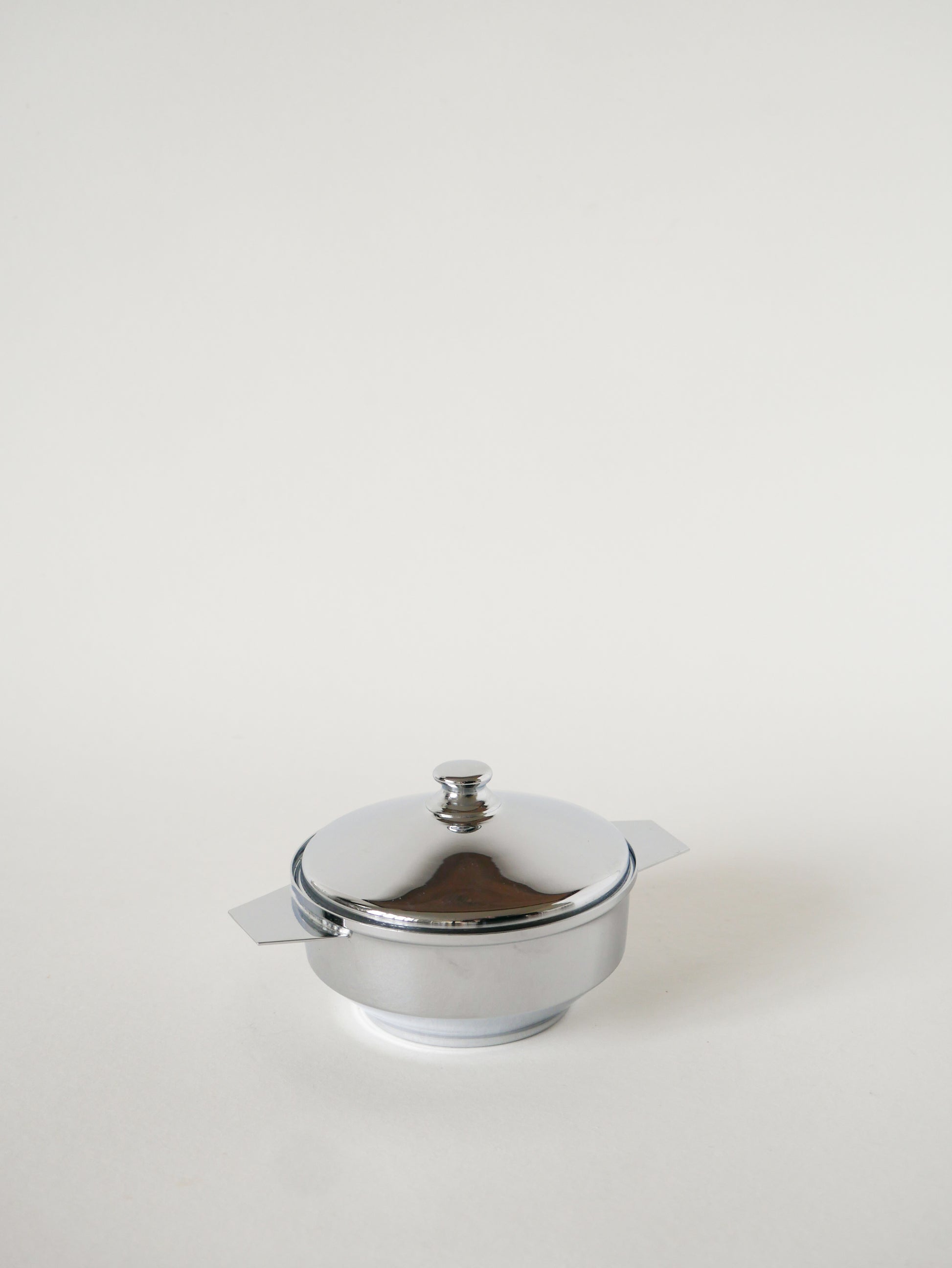 Joli boîte sucrier en inox, Art Déco, 1950. En très bon état, de rares traces du temps. Envoi rapide et soigné. Possibilité d'envois groupés - plus économique et plus écologique ! Dimensions : 15 X 10 cm.