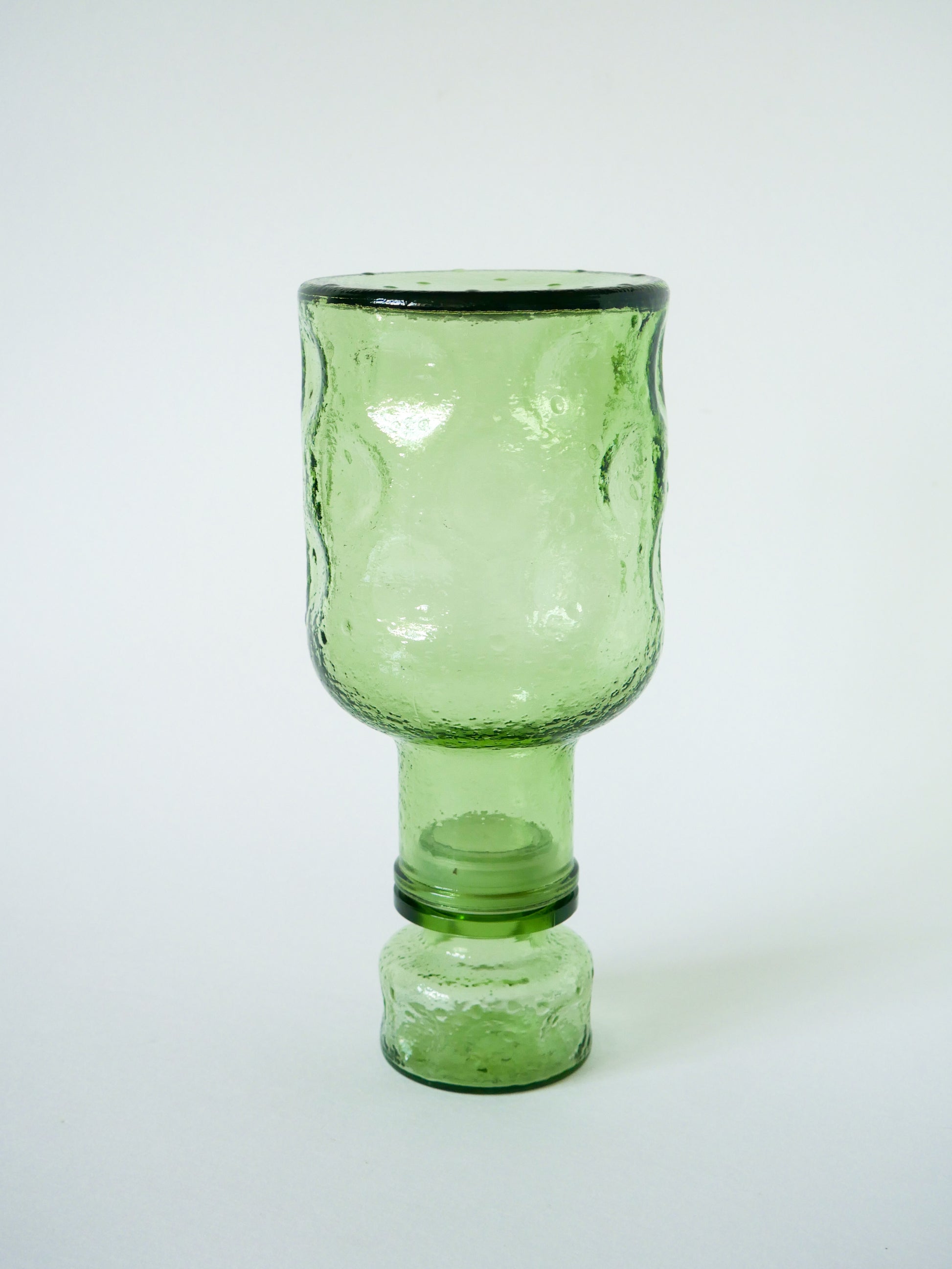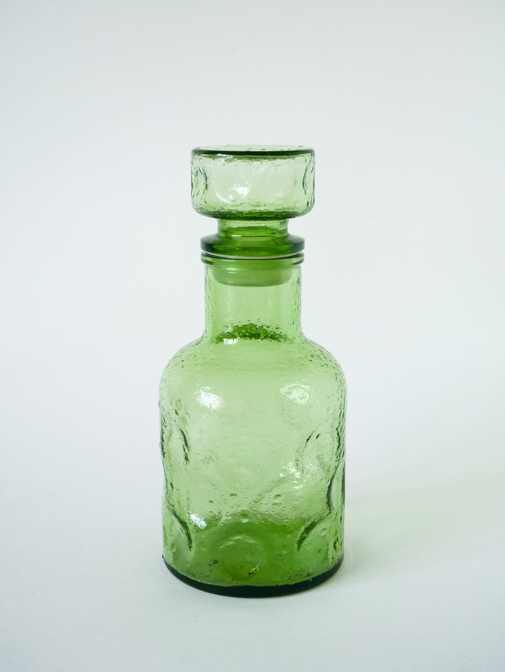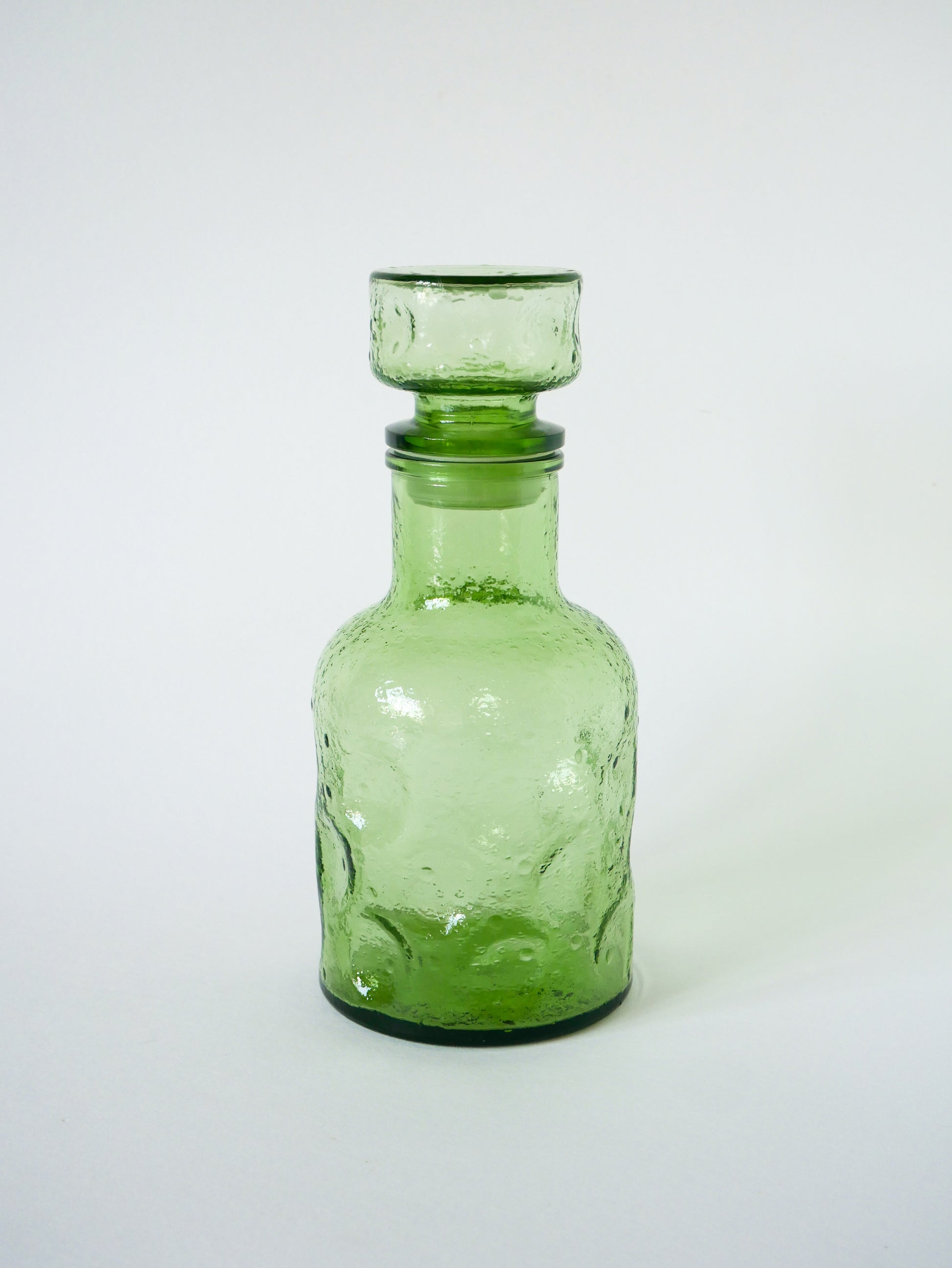 Superbe carafe en verre bullé vert, 1970. En excellent état. 3 disponibles. Envoi rapide et soigné. Possibilité d'envois groupés - plus économique et plus écologique ! Dimensions : 24 X 10.5 cm.