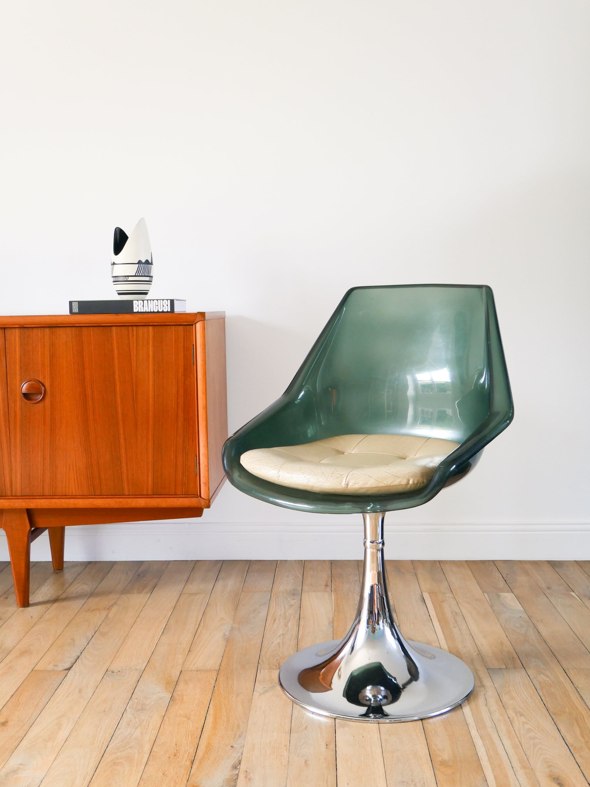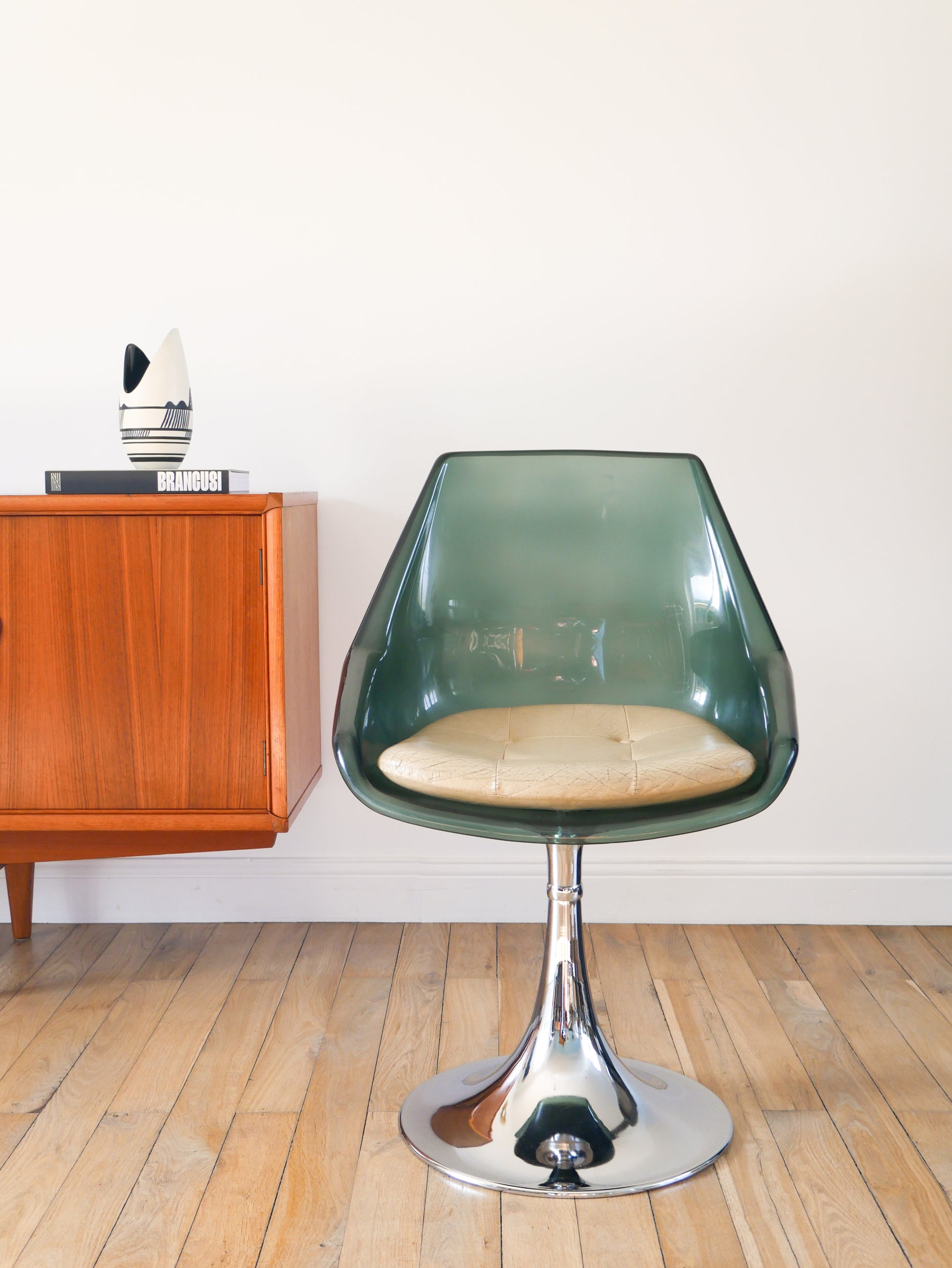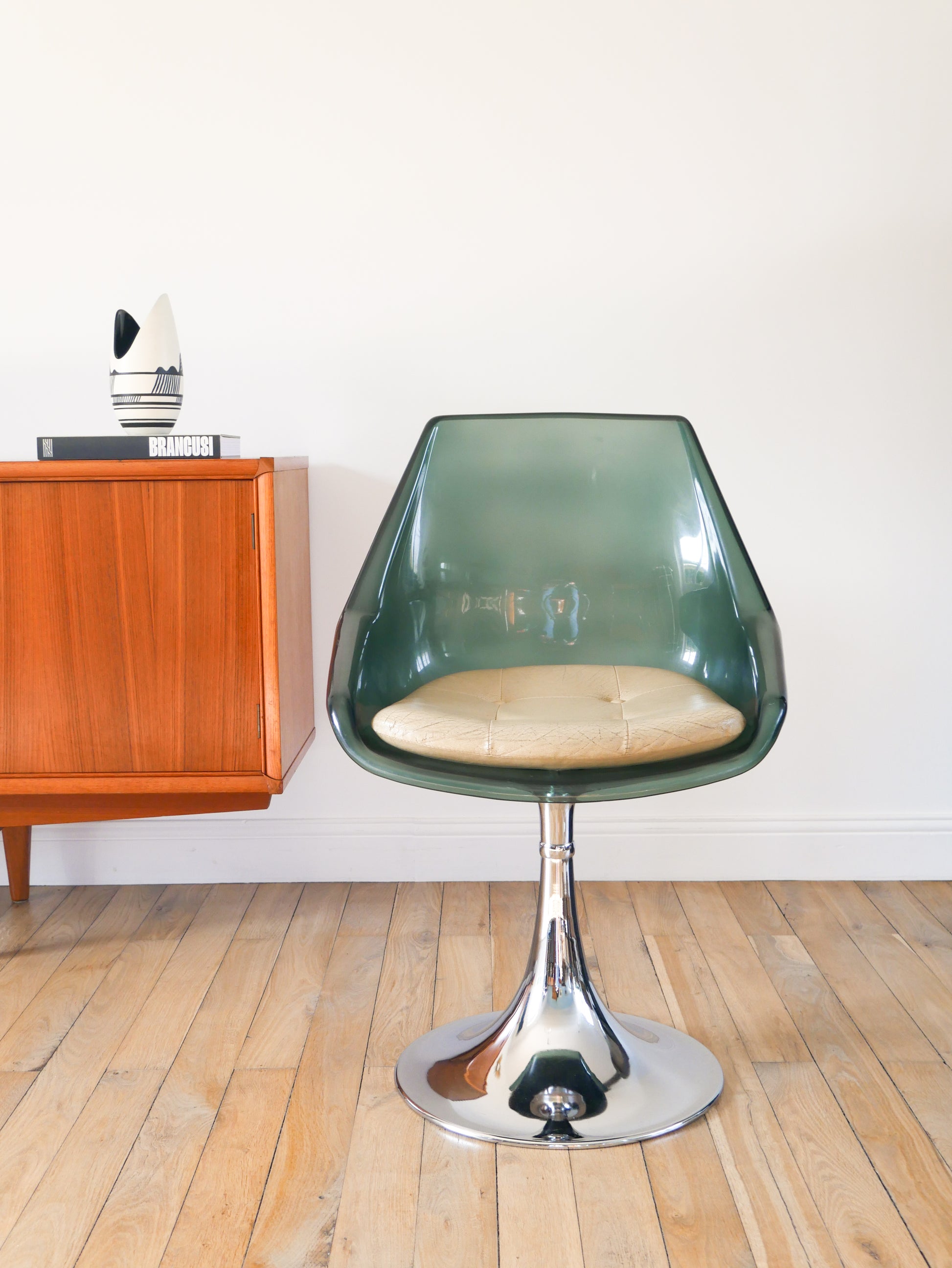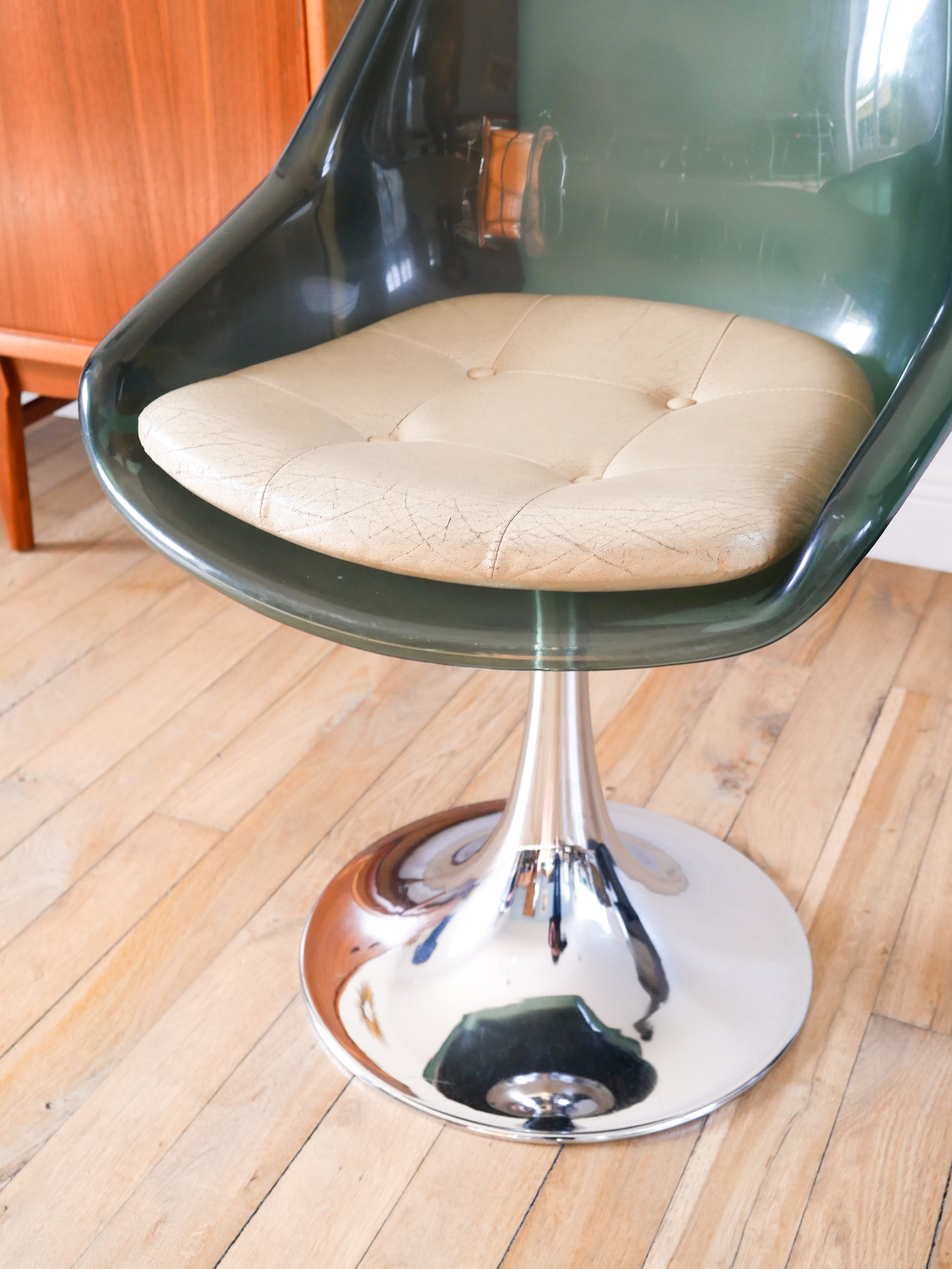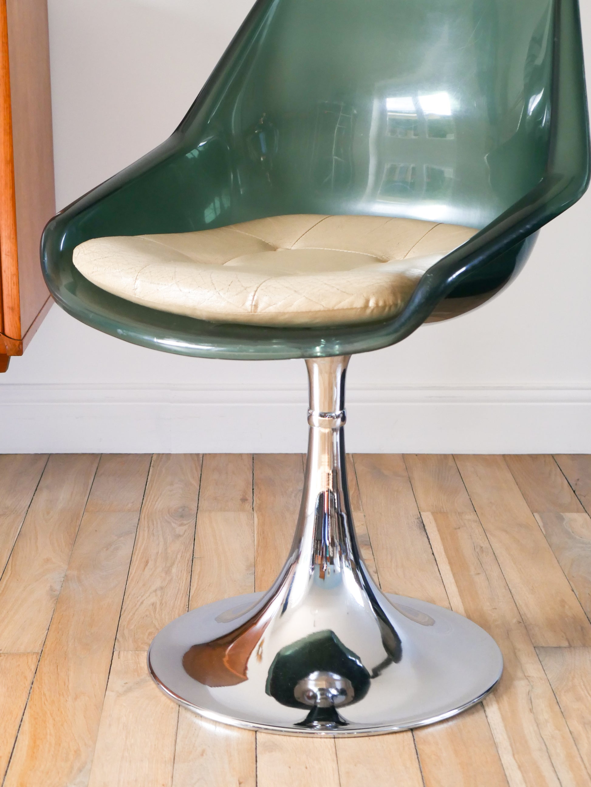 Chaise pivotante à pieds tulipe en chrome et plexi, Bleutée, galette en skaï Beige, Roche Bobois, 1970