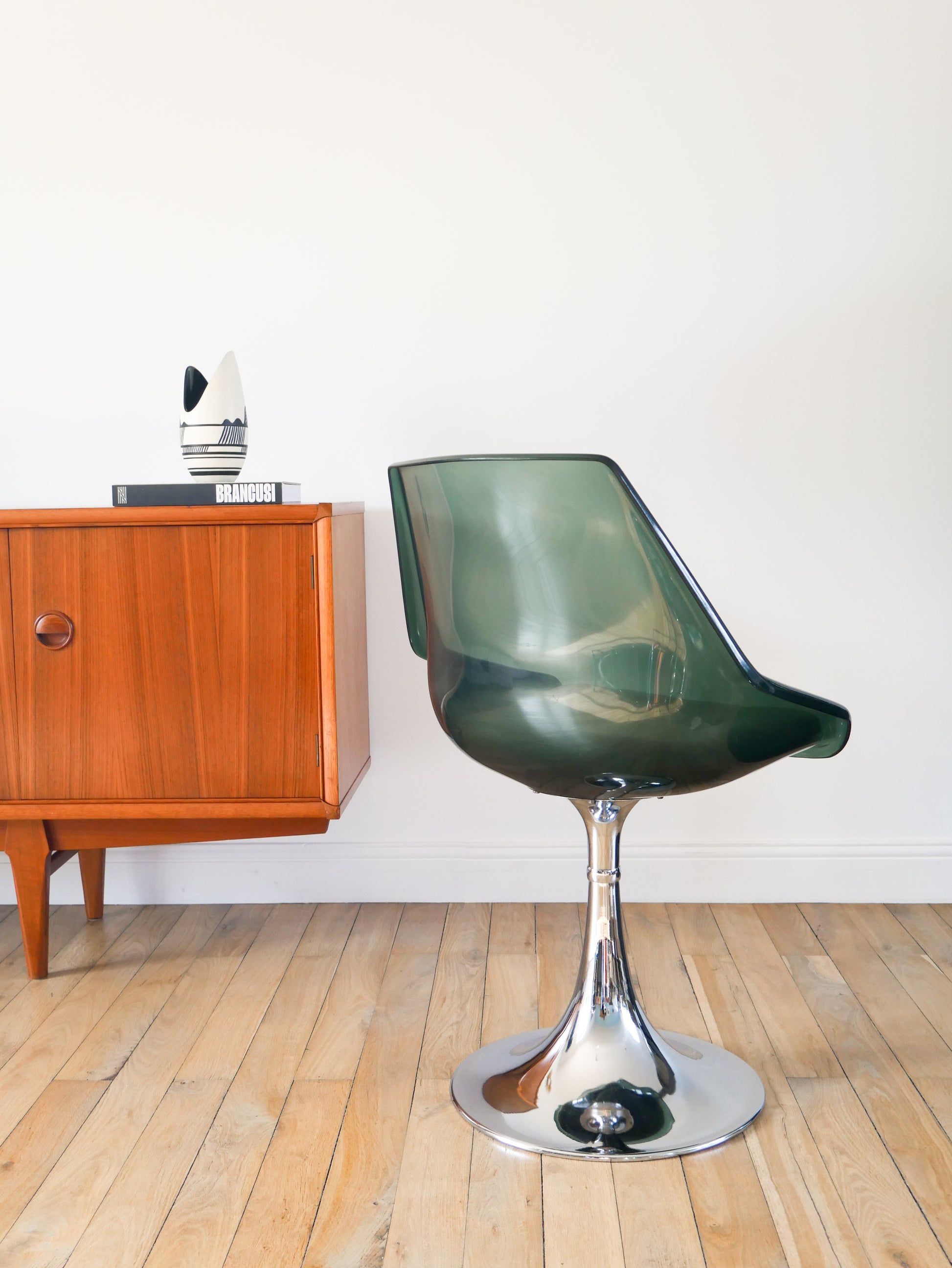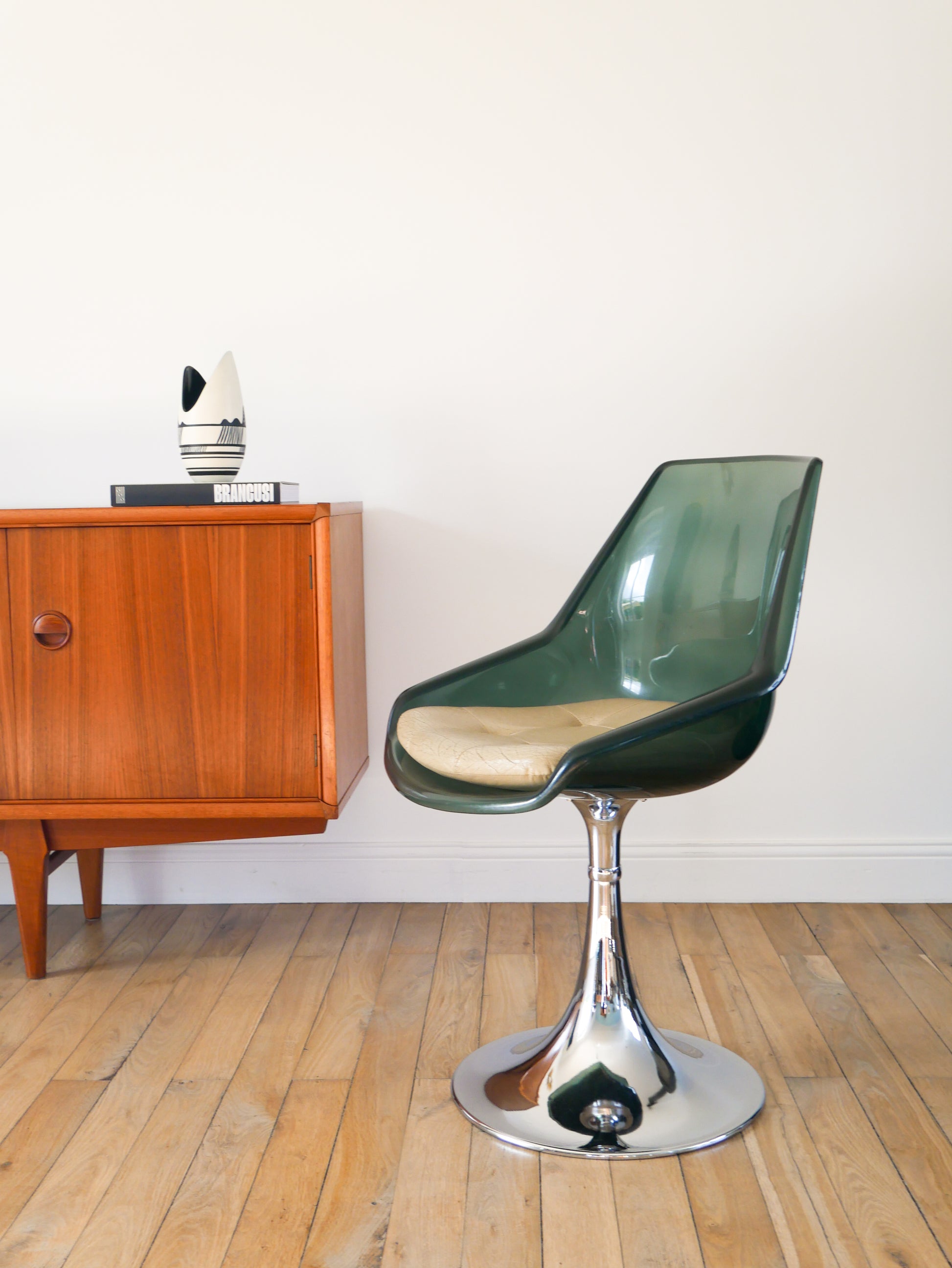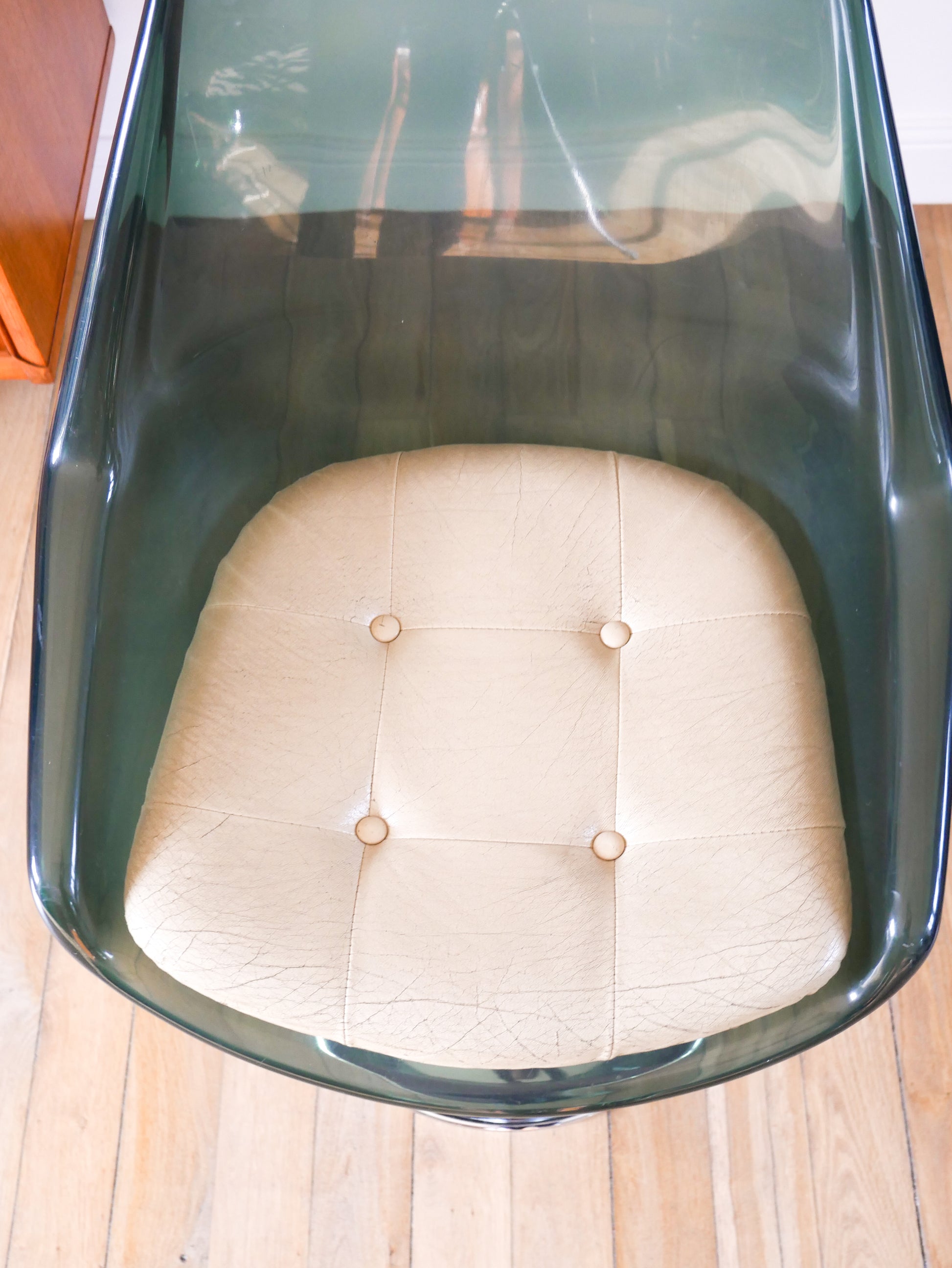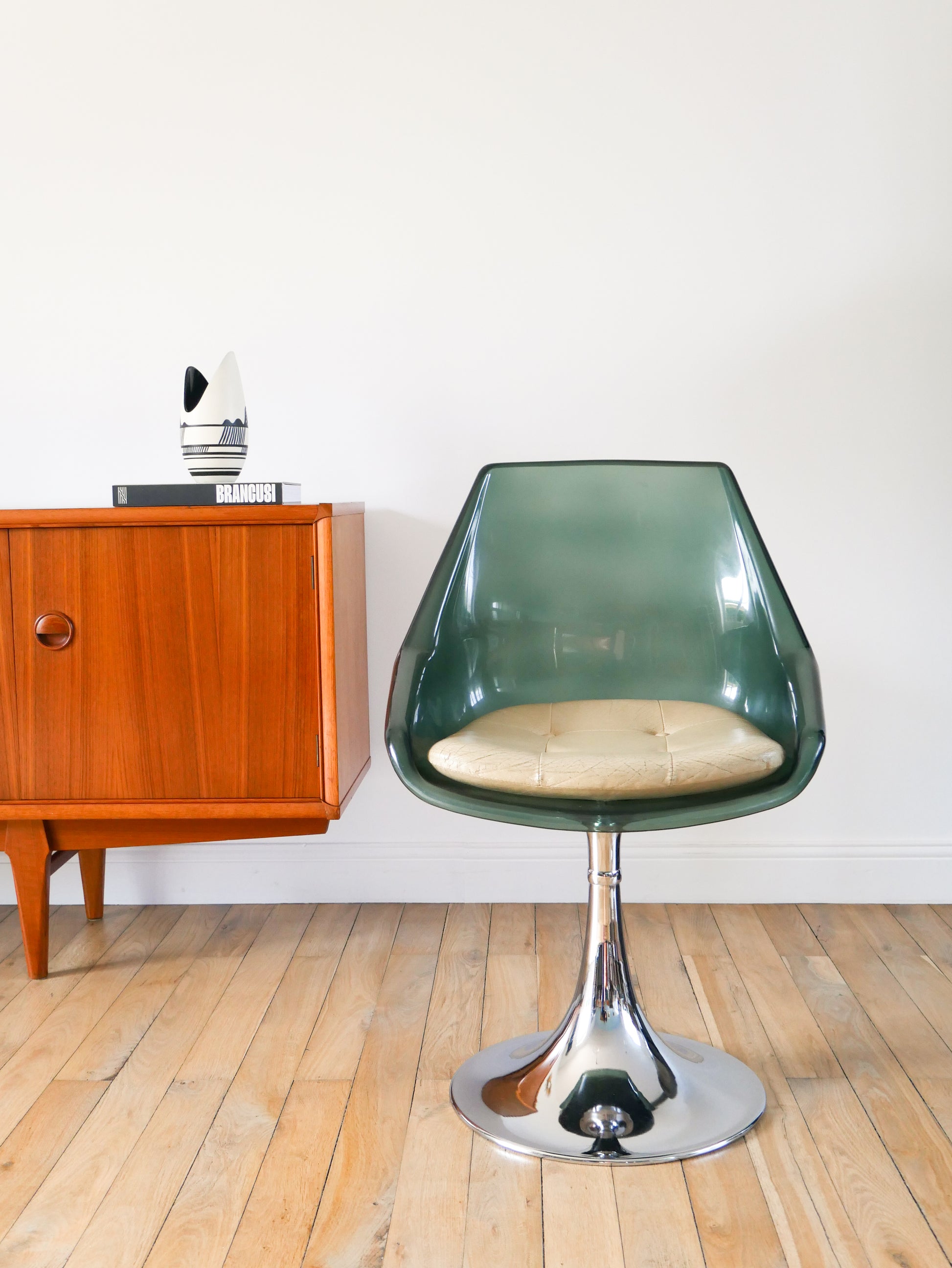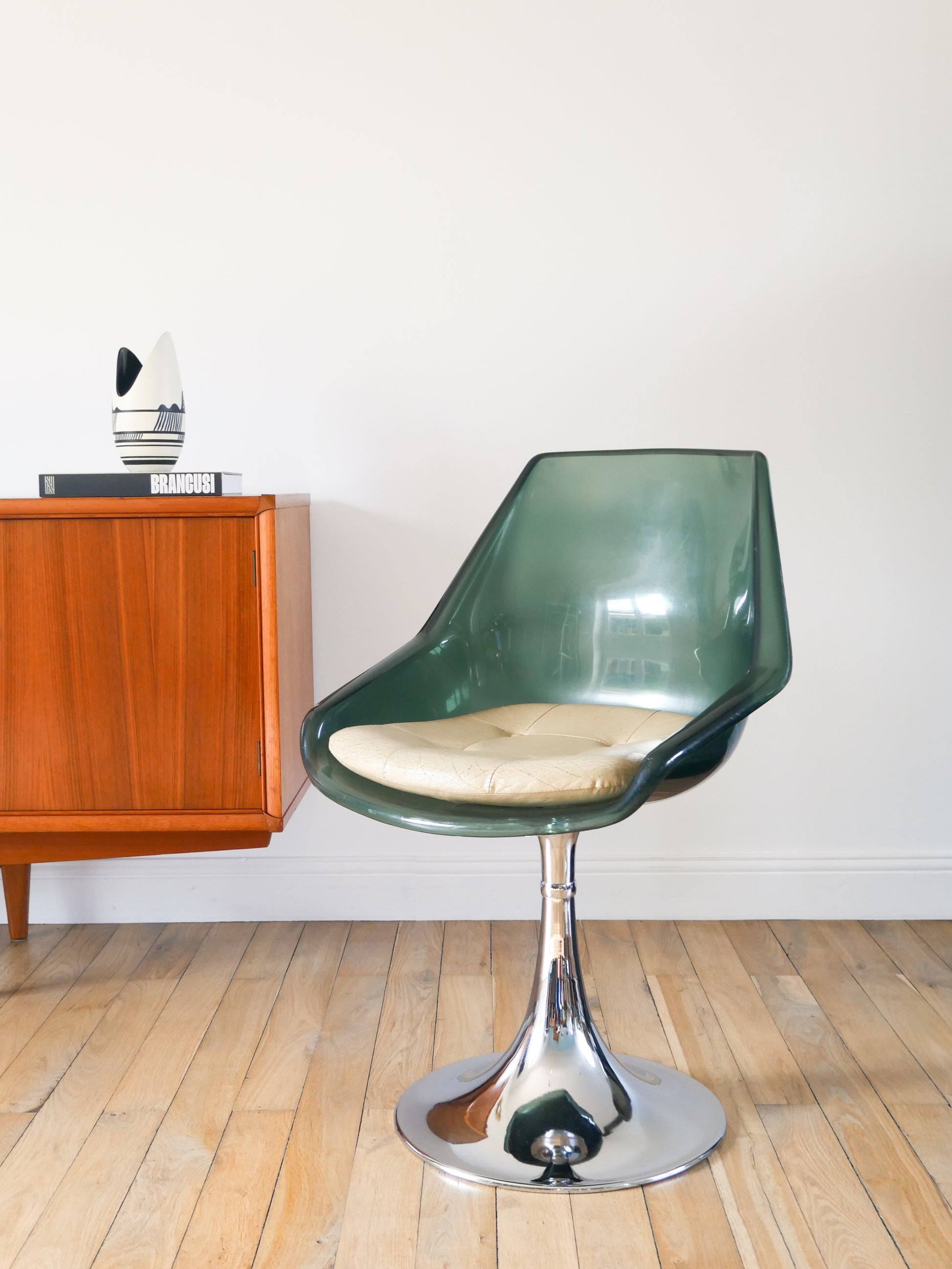 Chaise pivotante à pieds tulipe en chrome et plexi, Bleutée, galette en skaï Beige, Roche Bobois, 1970