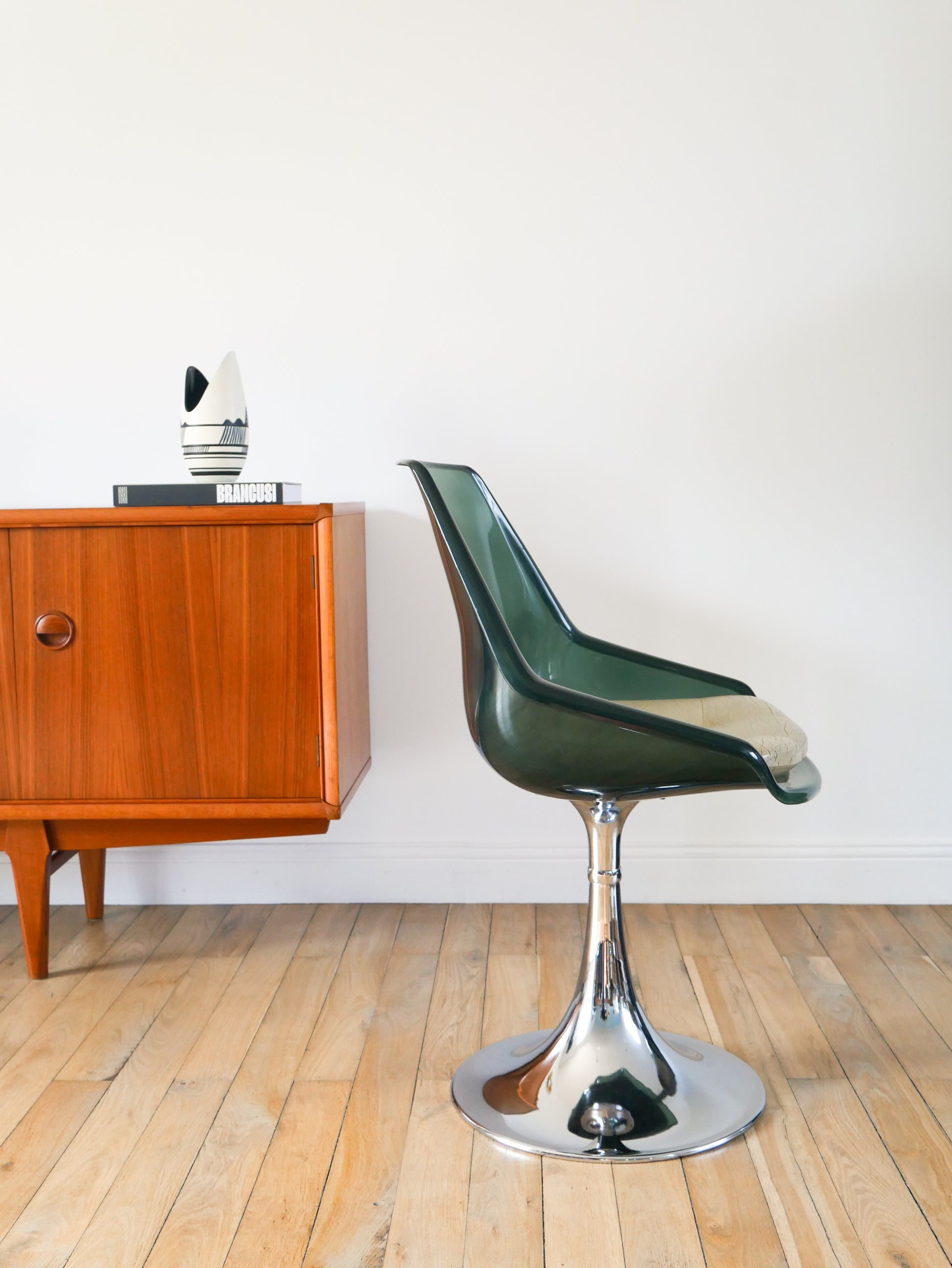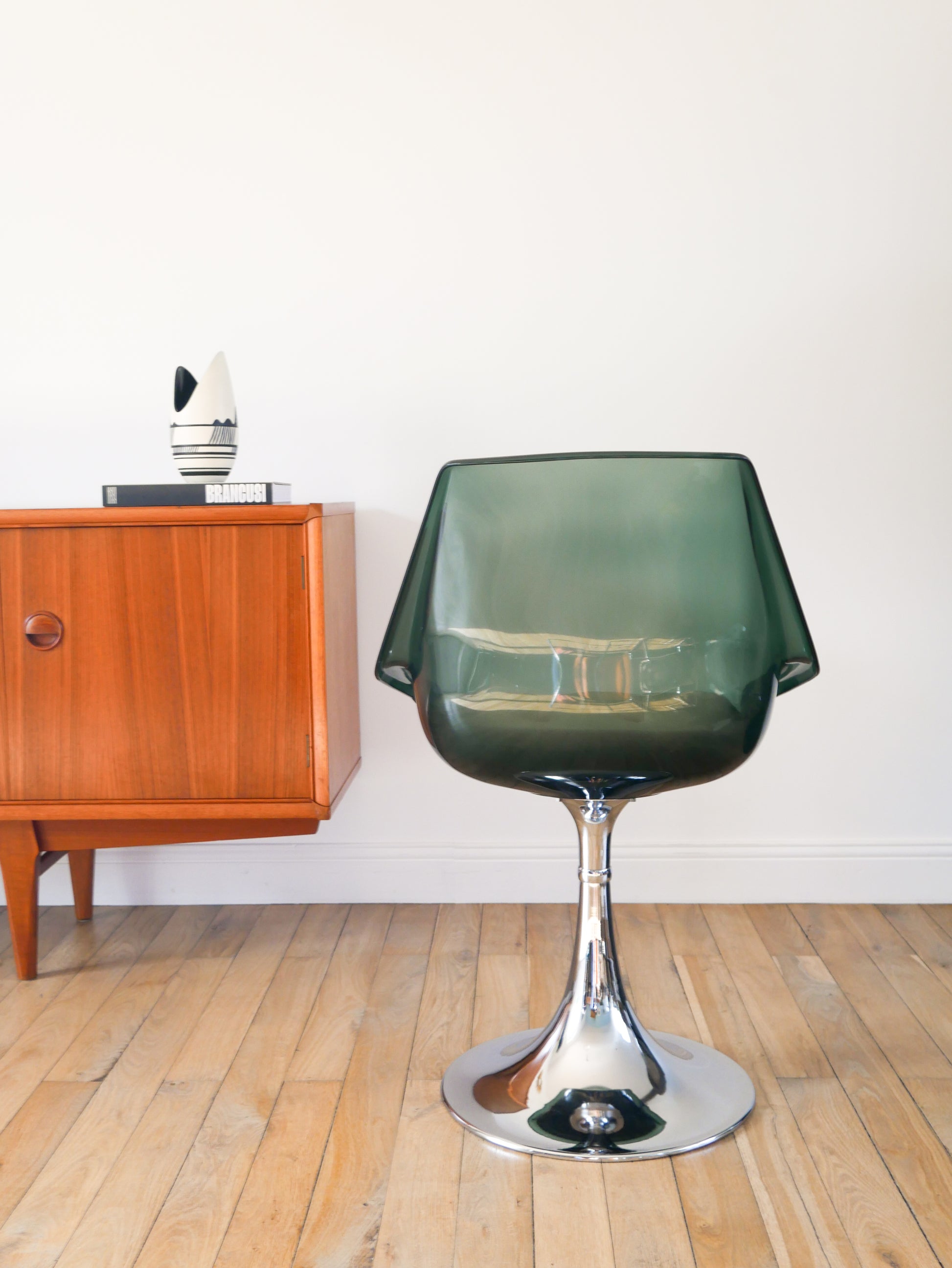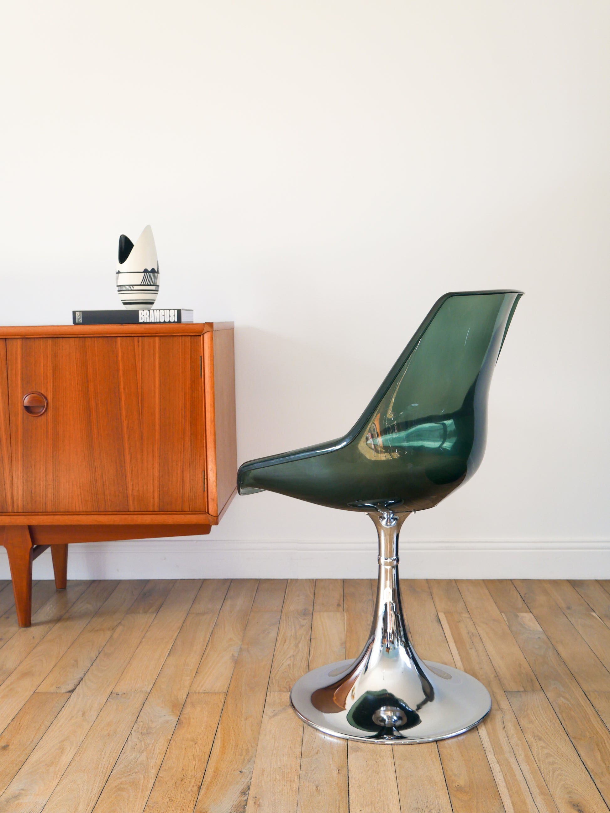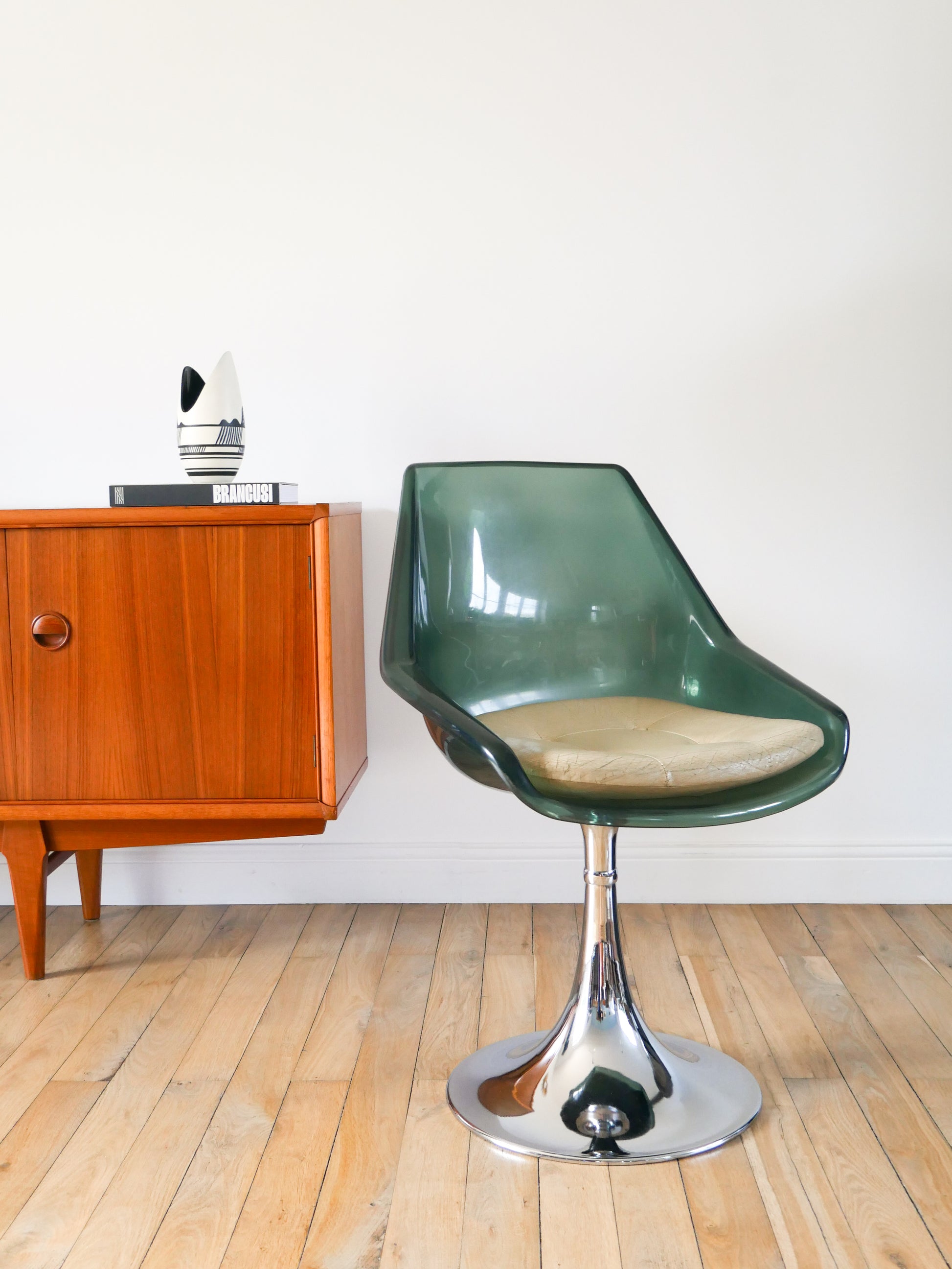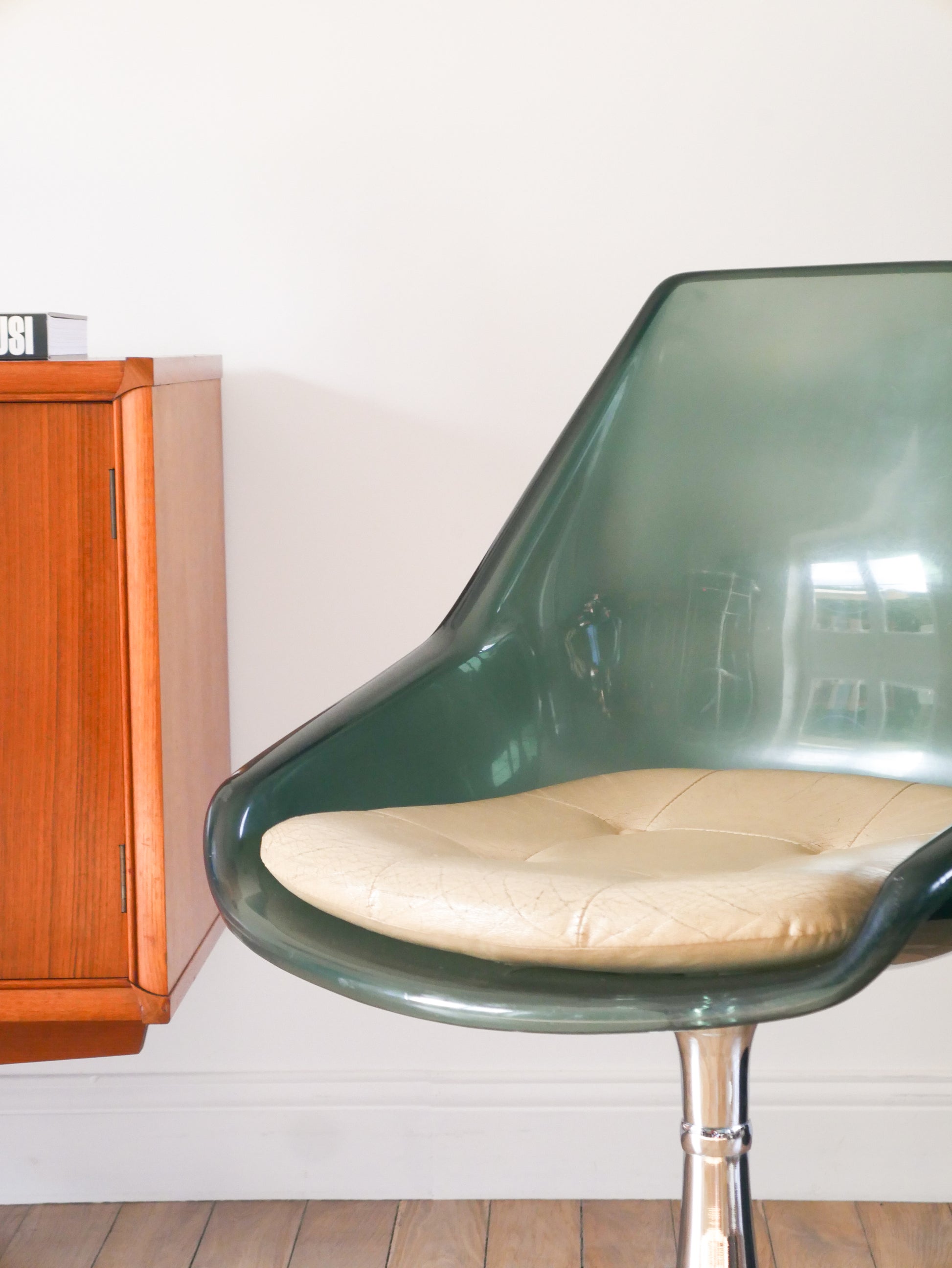 Chaise pivotante à pieds tulipe en chrome et plexi, Bleutée, galette en skaï Beige, Roche Bobois, 1970