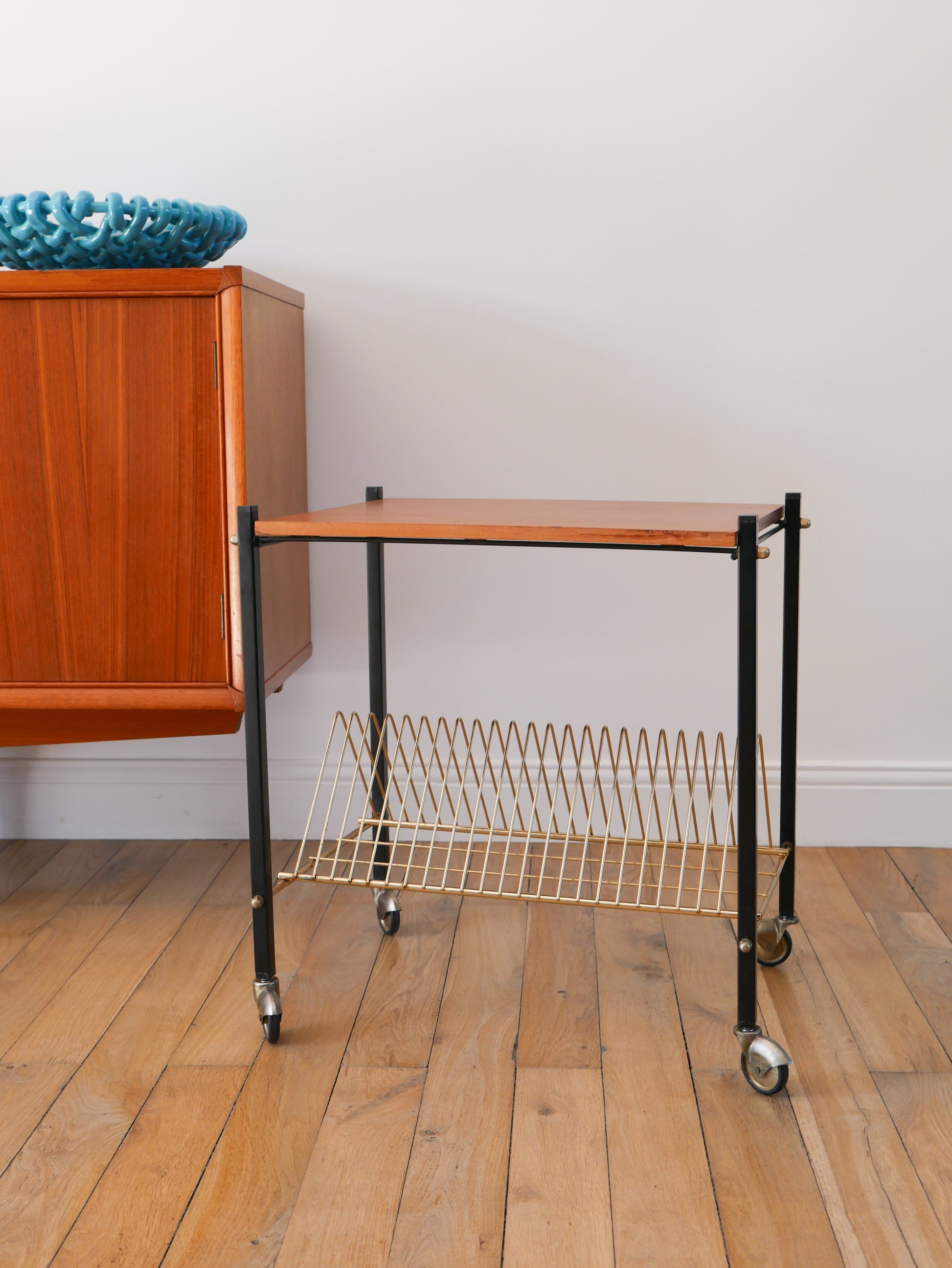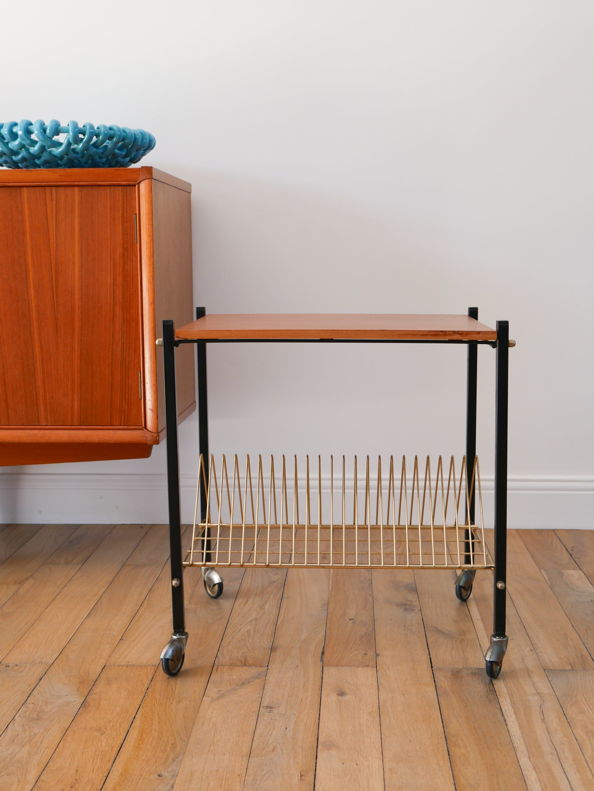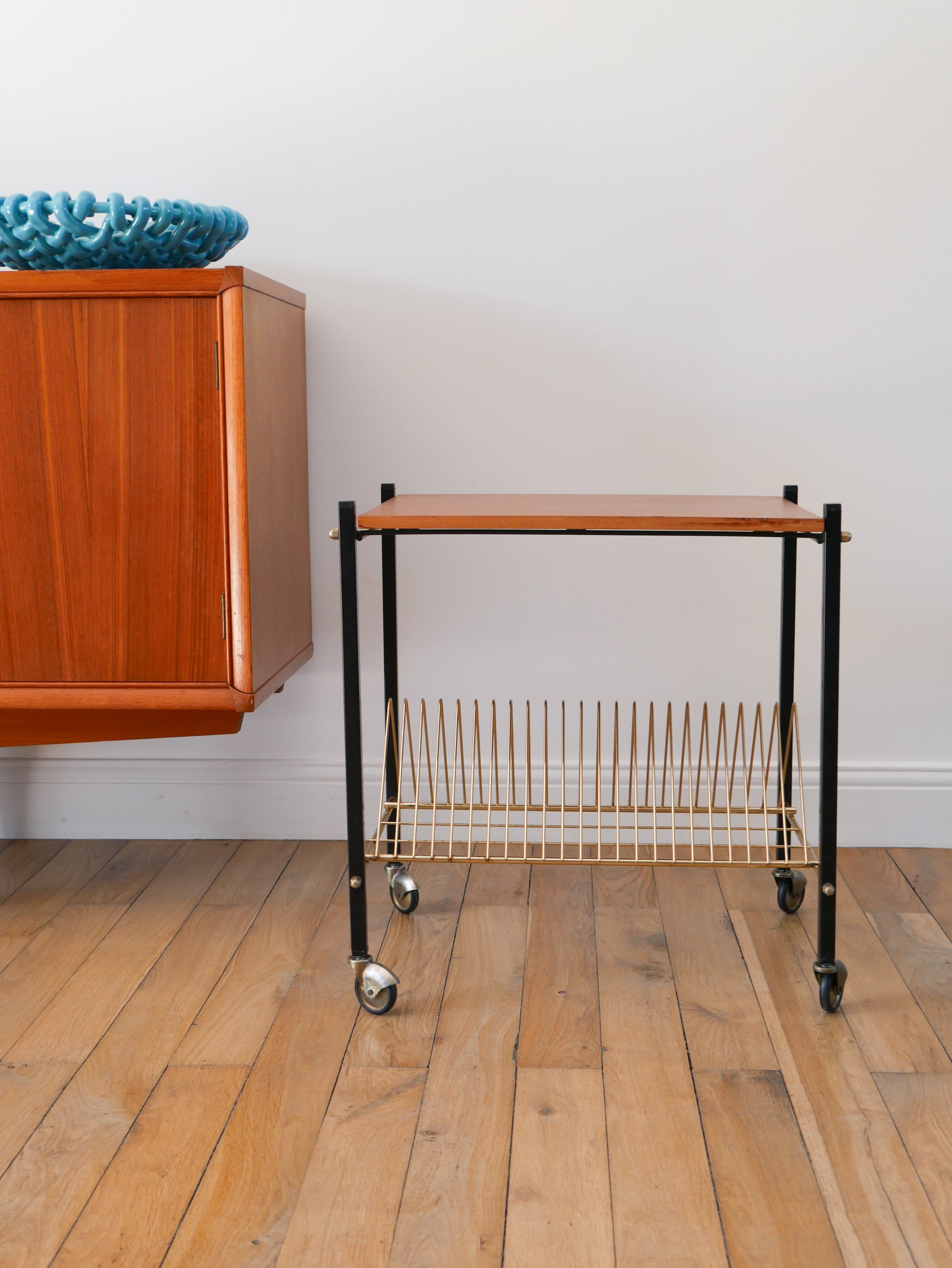 Superbe desserte roulante range-vinyle, en teck et fer noir, Style Moderniste, 1970. En très bon état, de rares traces du temps. Envoi rapide et soigné. Possibilité d'envois groupés - plus économique et plus écologique ! Dimensions : H41 X L51 X P36 cm.