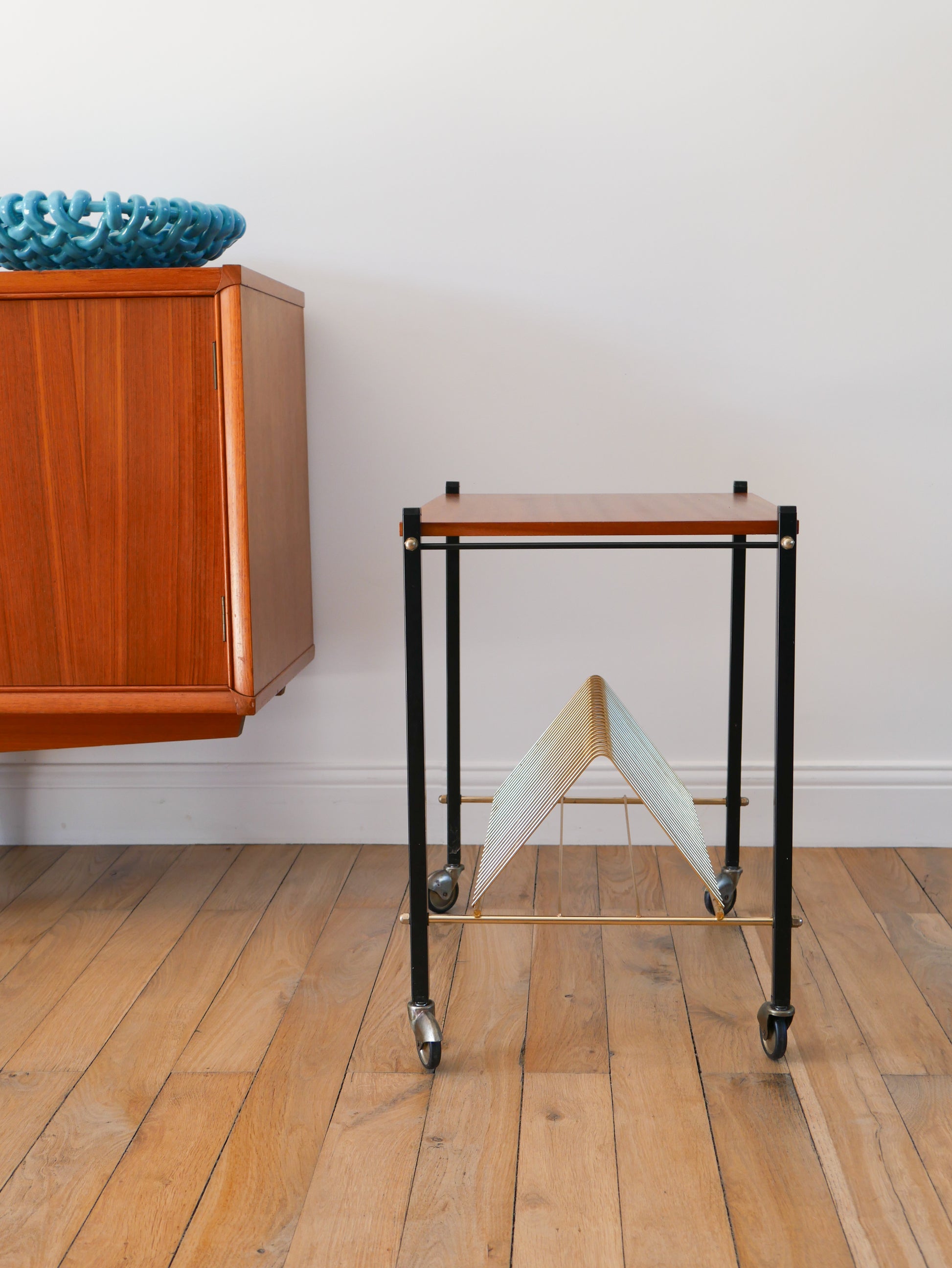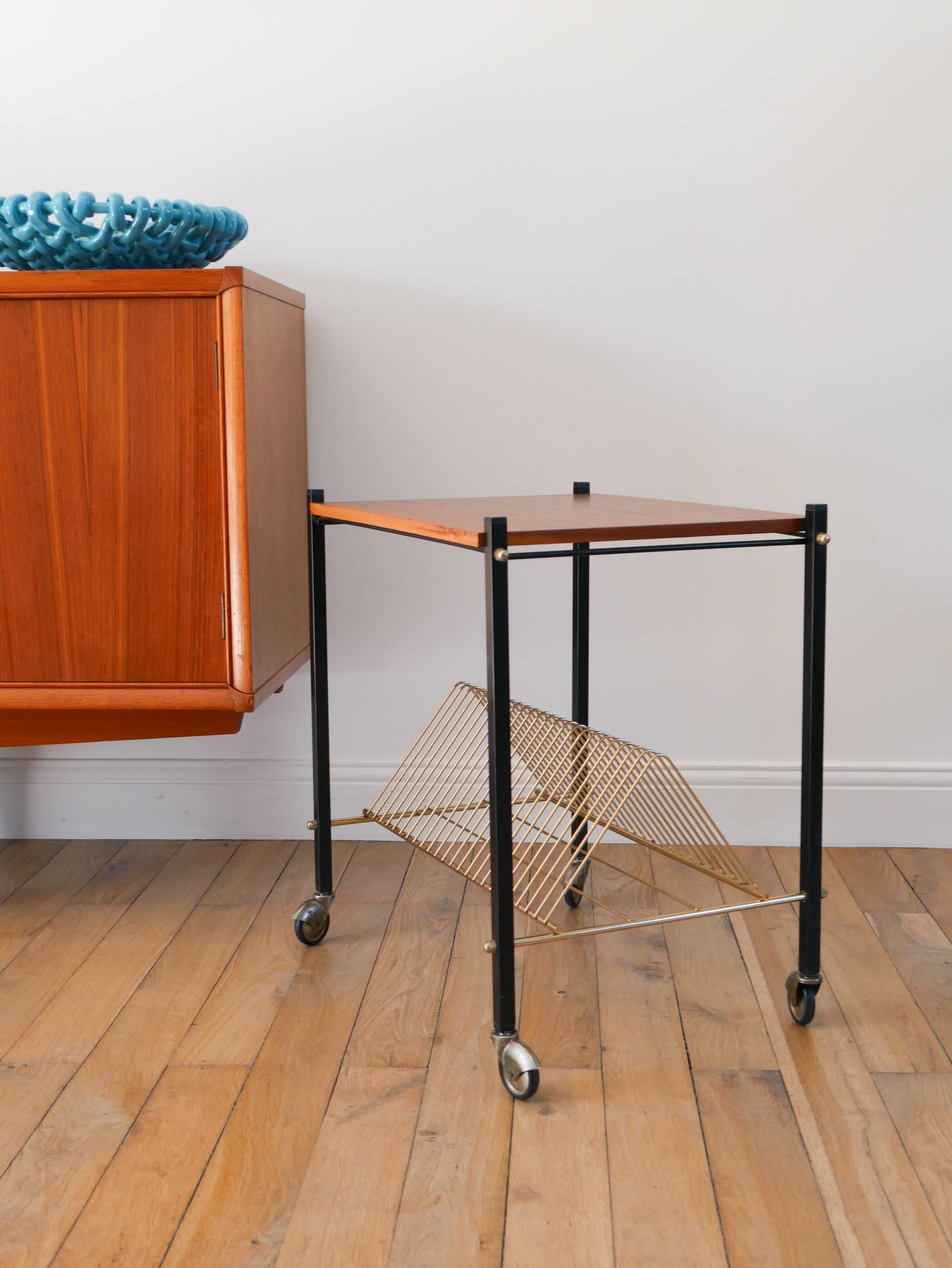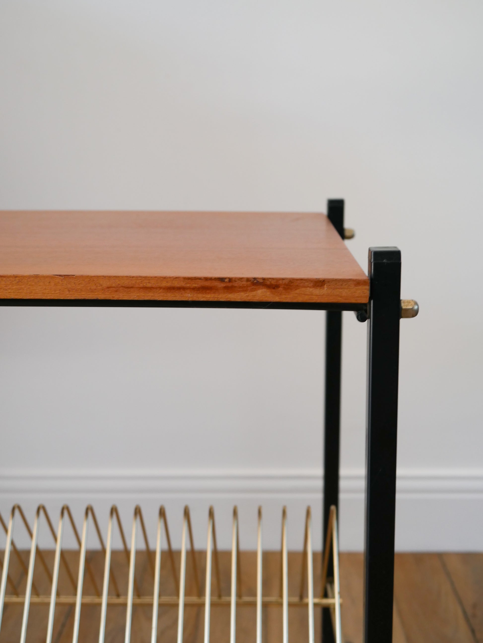Desserte roulante range-vinyle, en teck et fer noir, Style Moderniste, 1970