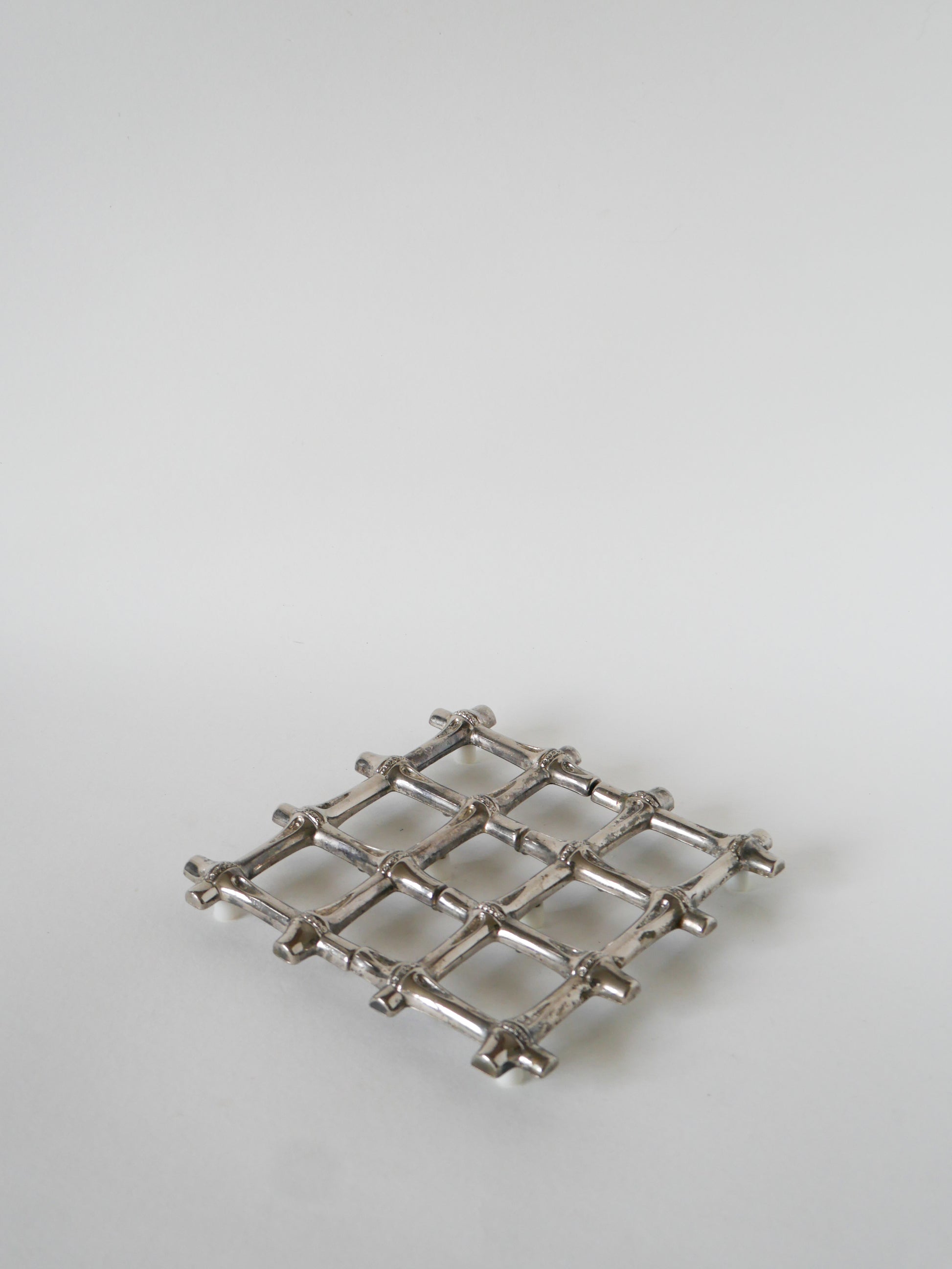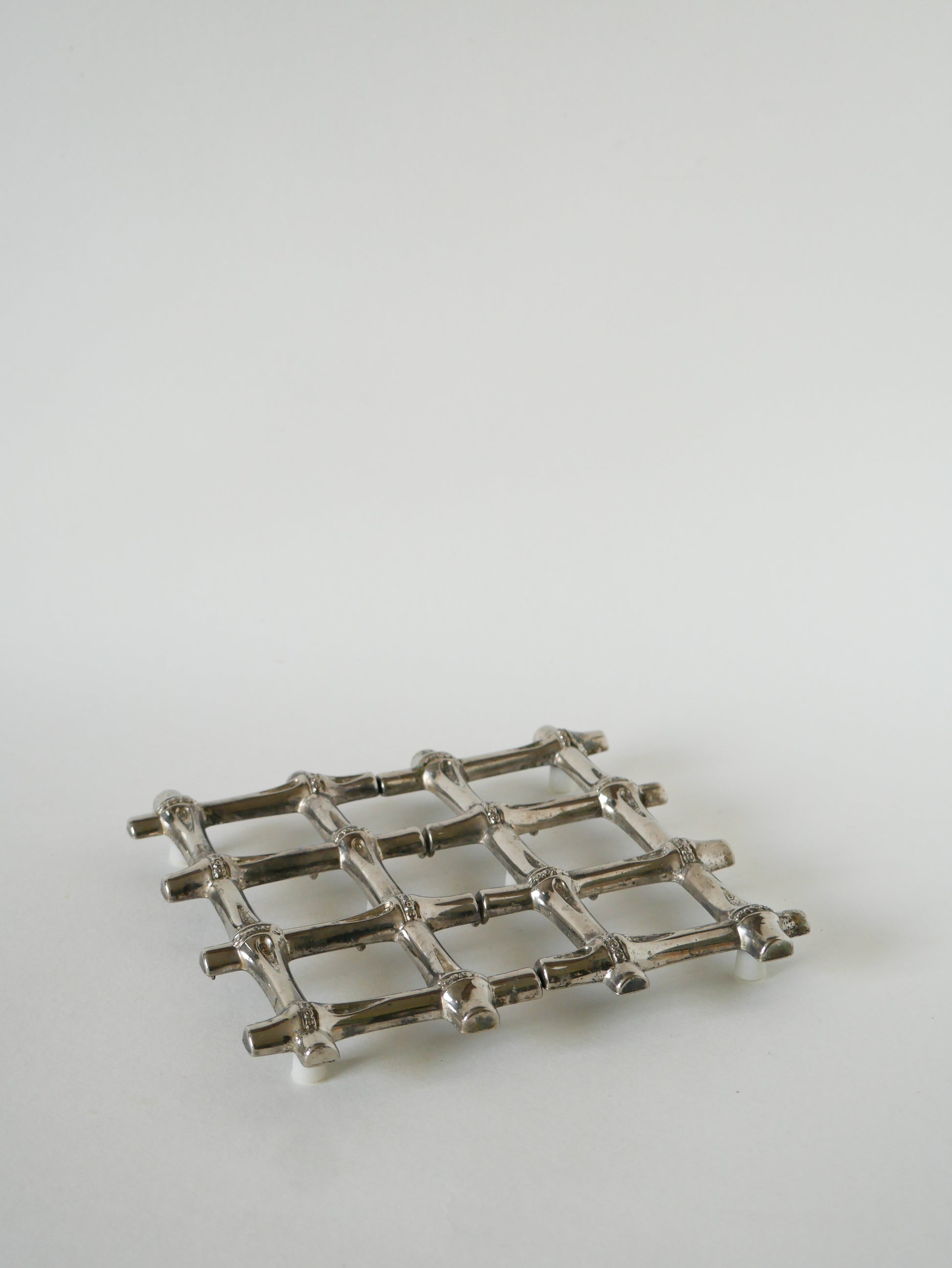 Superbe dessous de plat effet bambou, en métal argenté, 1970. En très bon état, de rares traces du temps. 2 lots disponibles. Envoi rapide et soigné. Possibilité d'envois groupés - plus économique et plus écologique ! Dimensions : 18.5 cm.