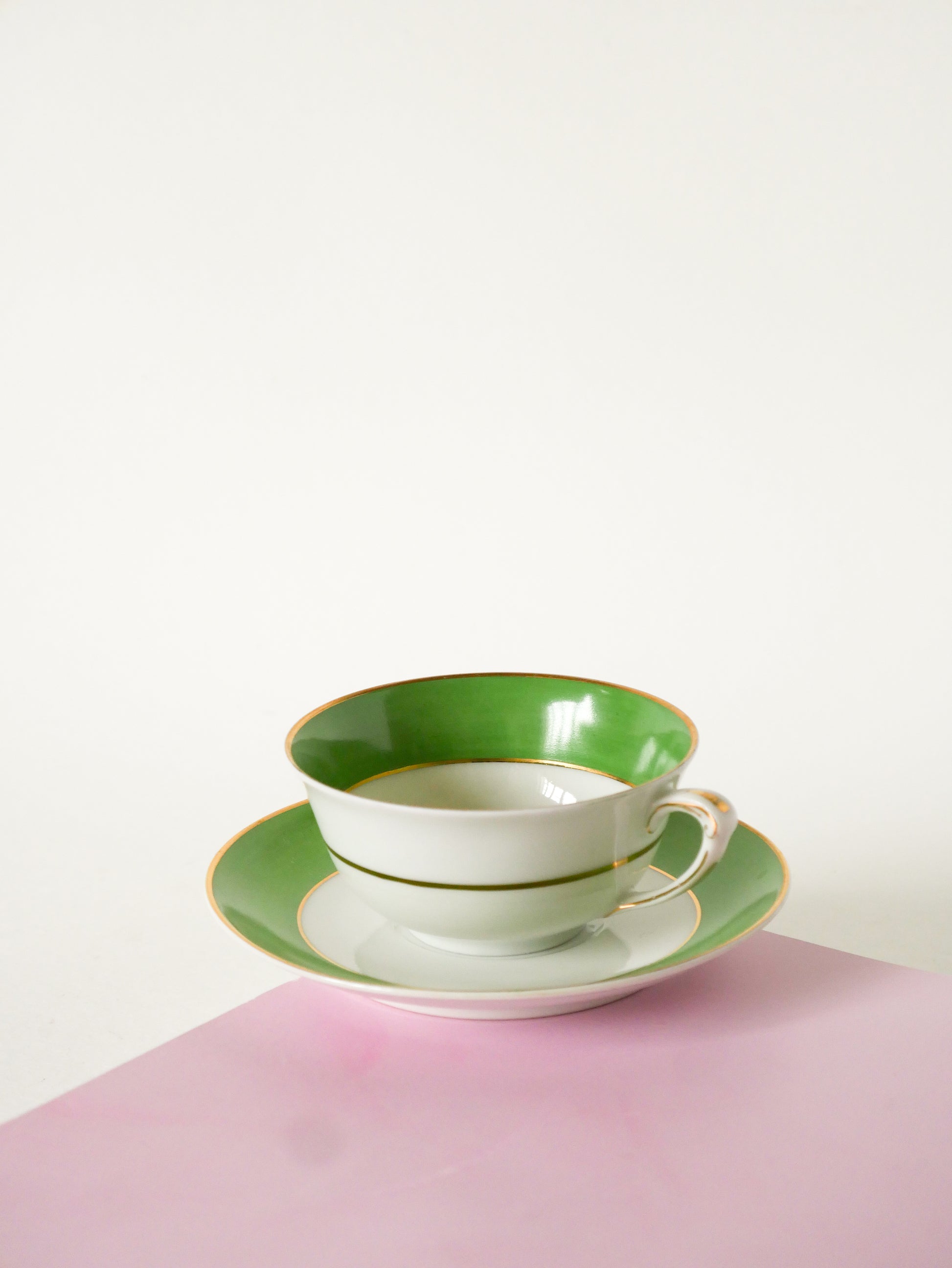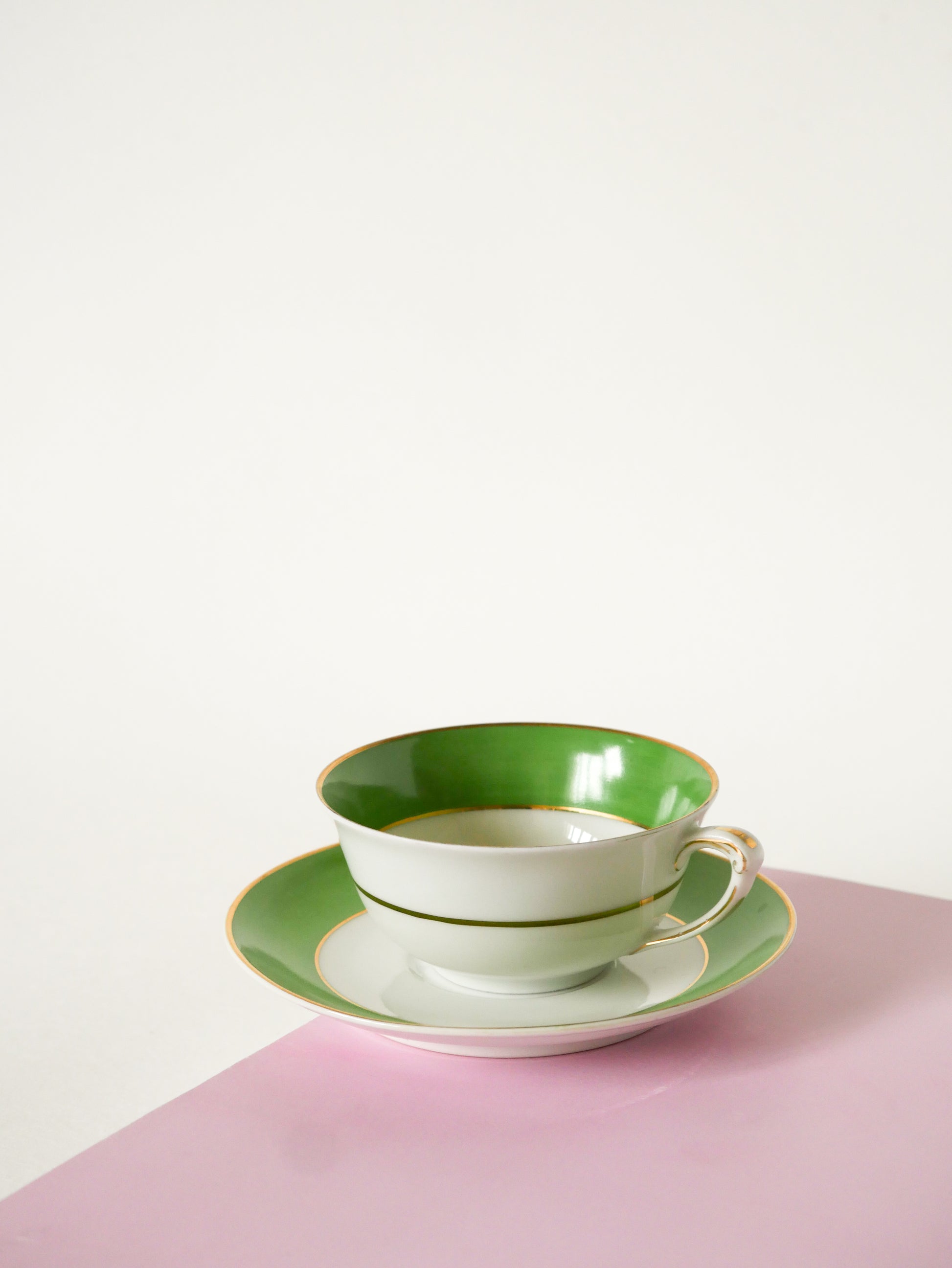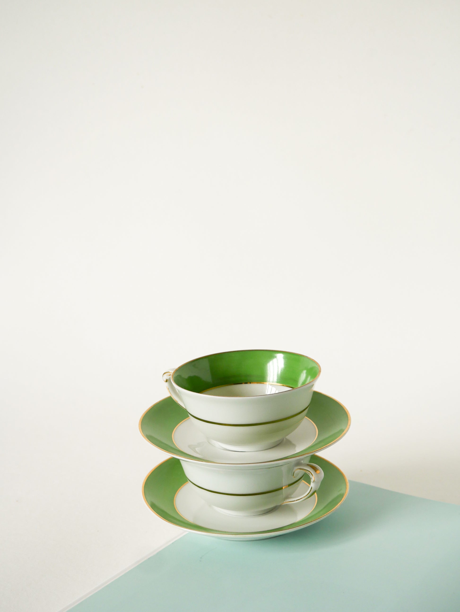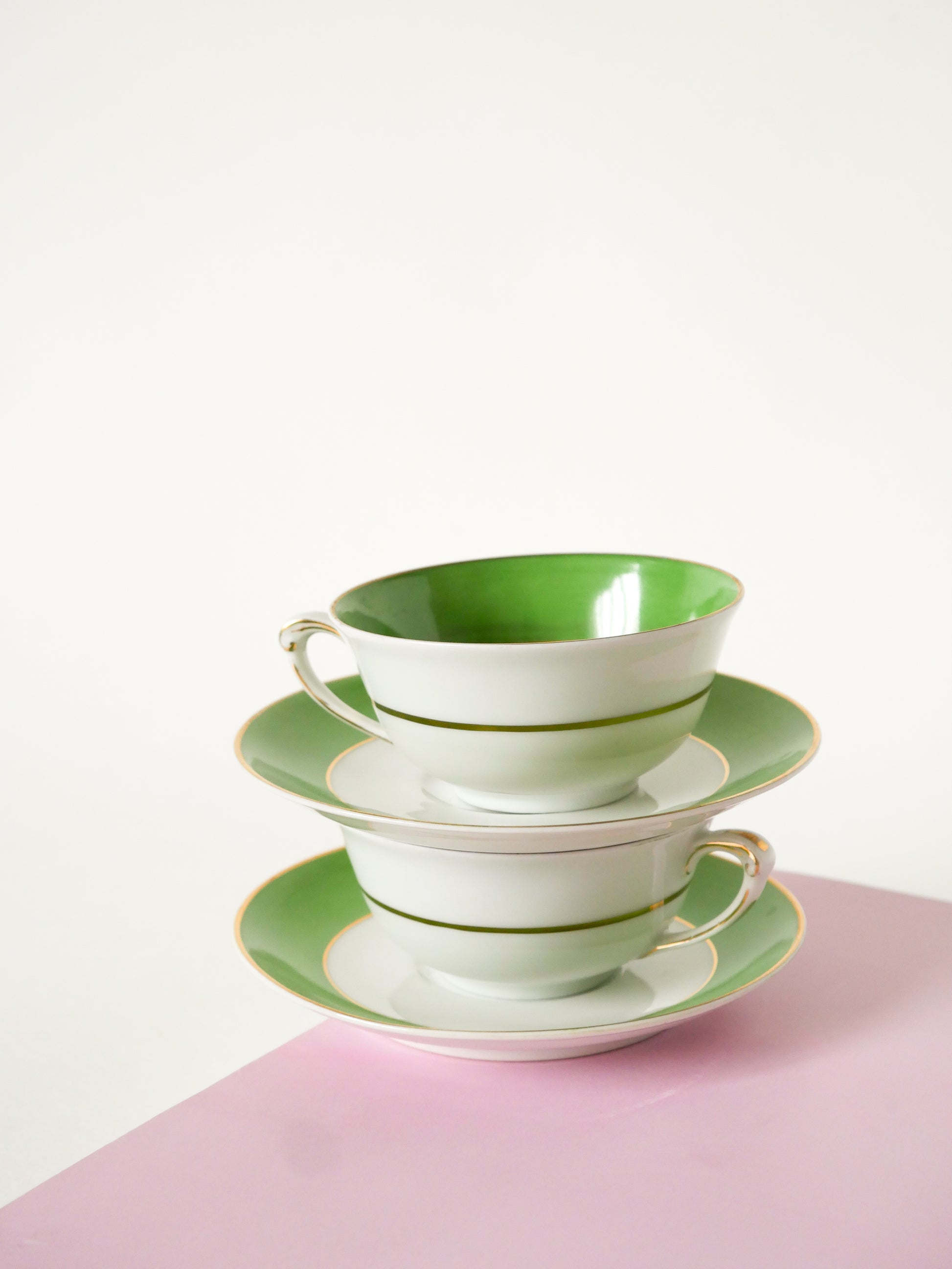 Superbe duo de tasses à café colorées GDA Limoges, Vert, Made in France, 1950. En excellent état. Envoi rapide et soigné. Possibilité d'envois groupés - plus économique et plus écologique ! Dimensions : Tasses : 9 X 4.5 ; soucoupes : 12.5 cm.