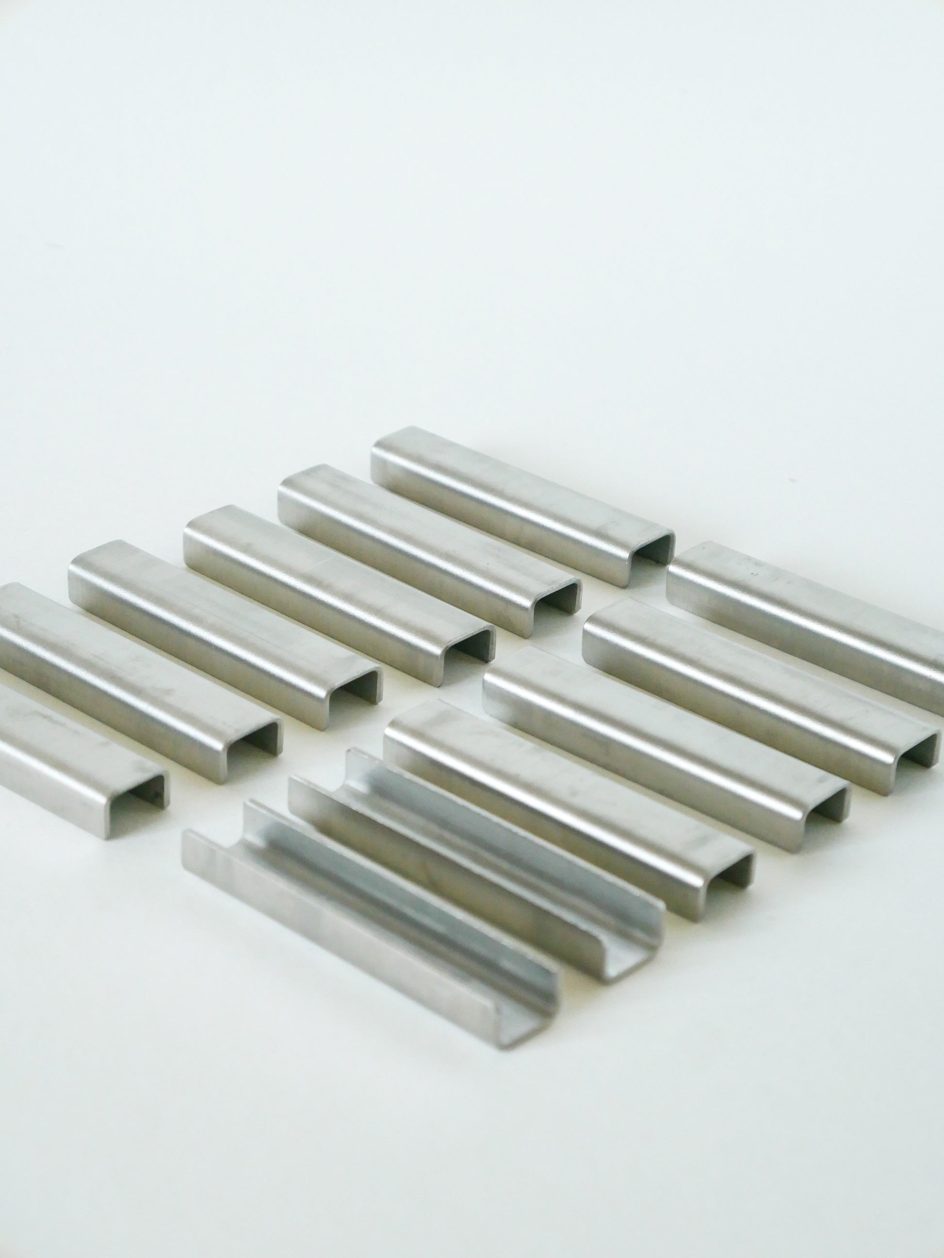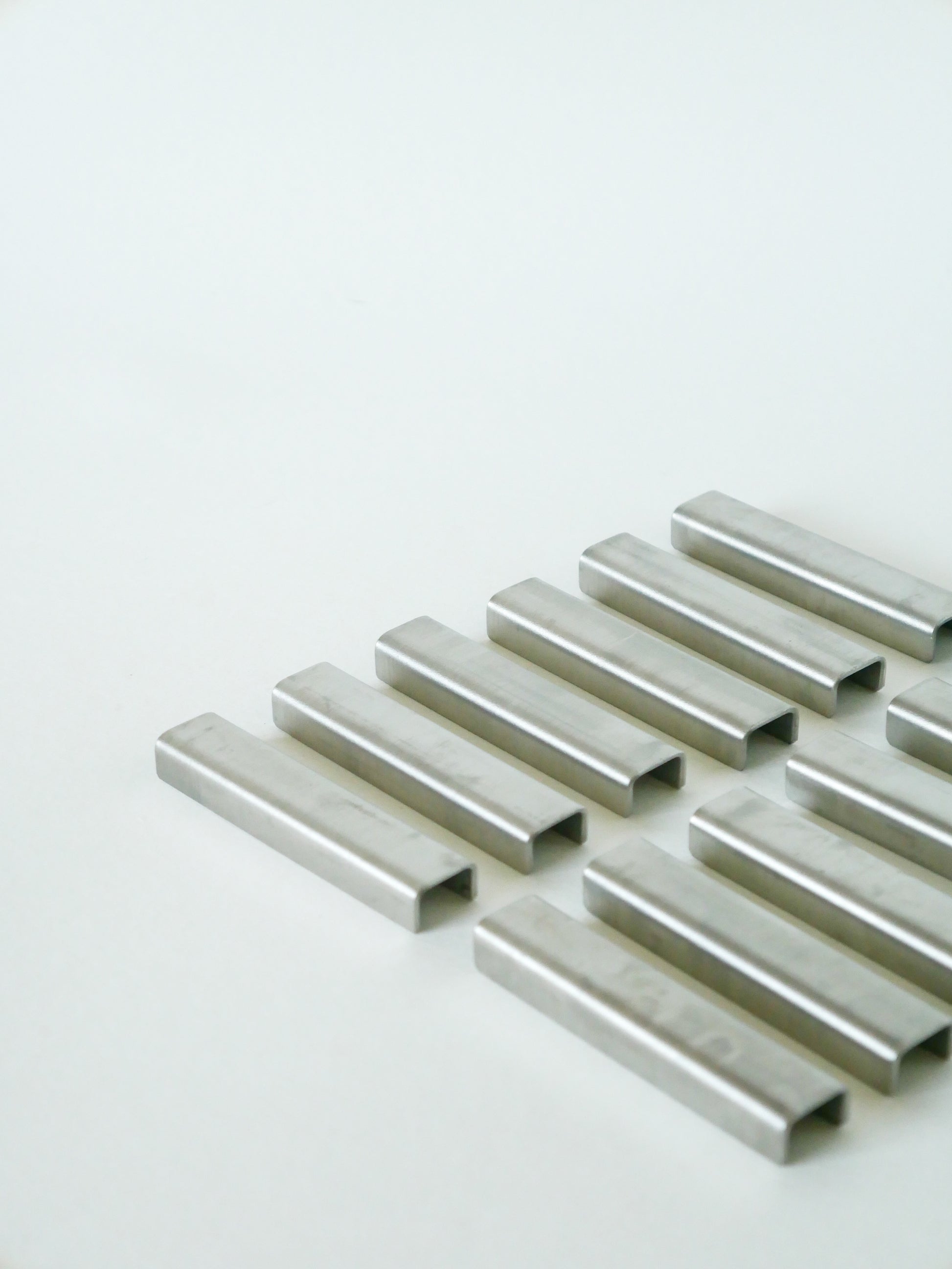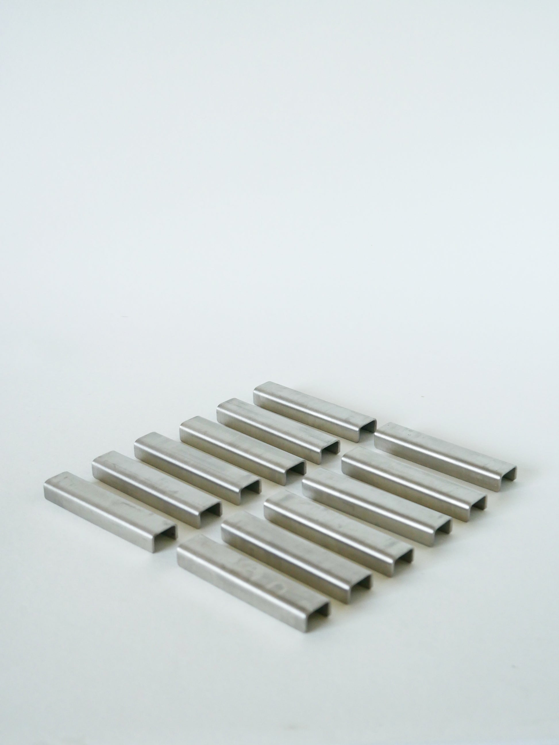 Superbe ensemble de 12 porte-couteaux en alu brossé, Design, 1970. En très bon état, de rares traces du temps. Envoi rapide et soigné. Possibilité d'envois groupés - plus économique et plus écologique ! Dimensions : 8 cm.