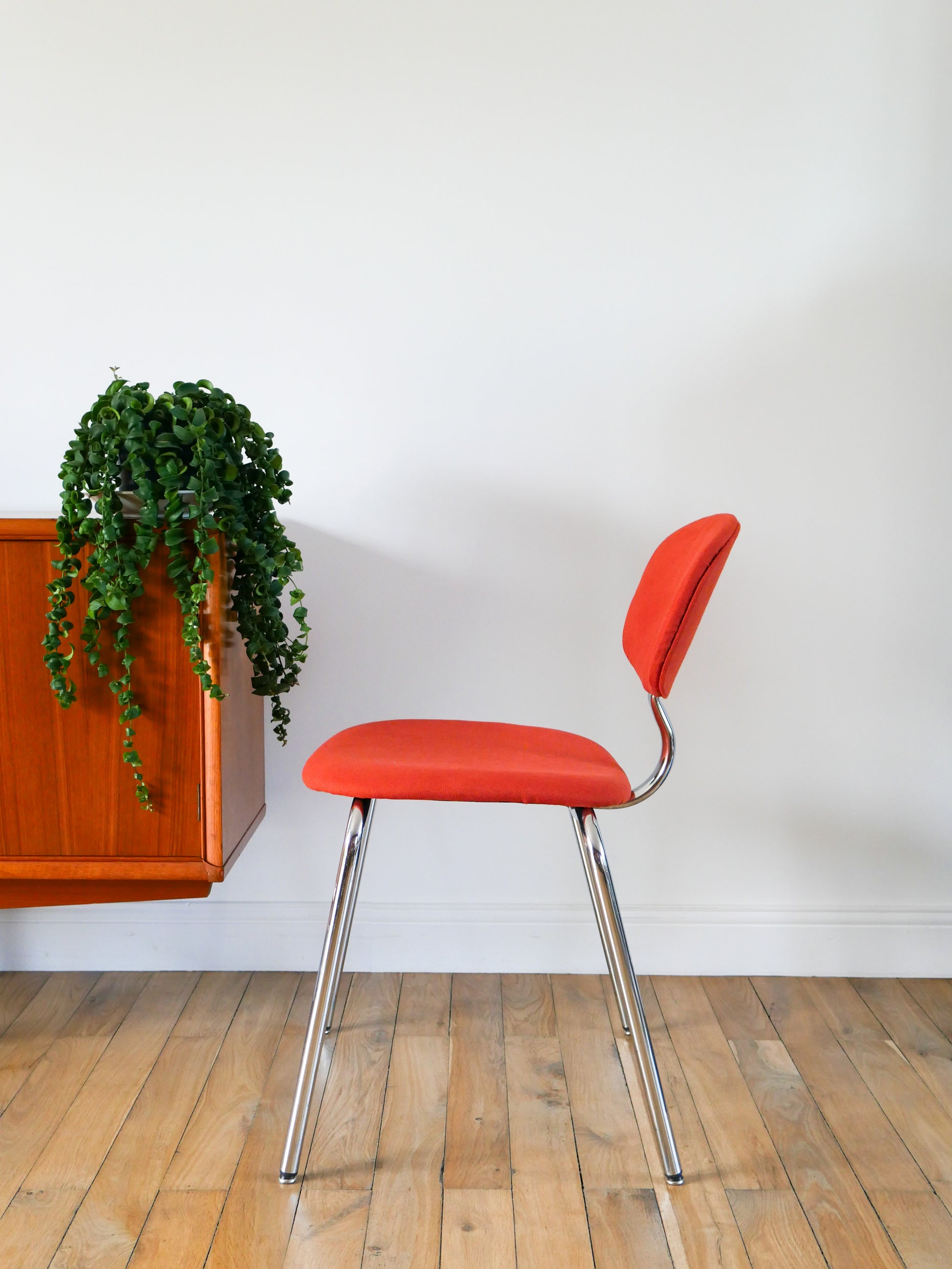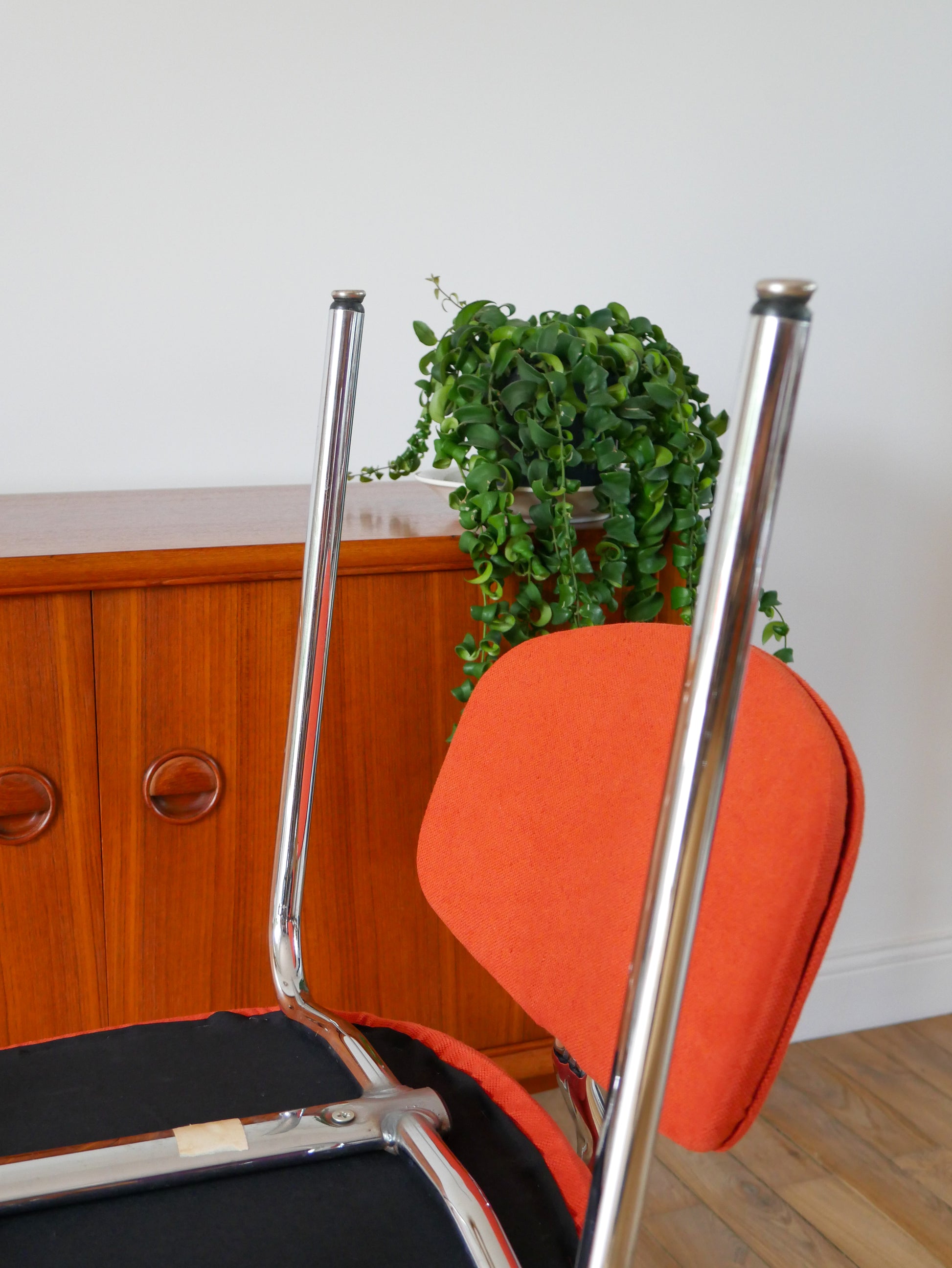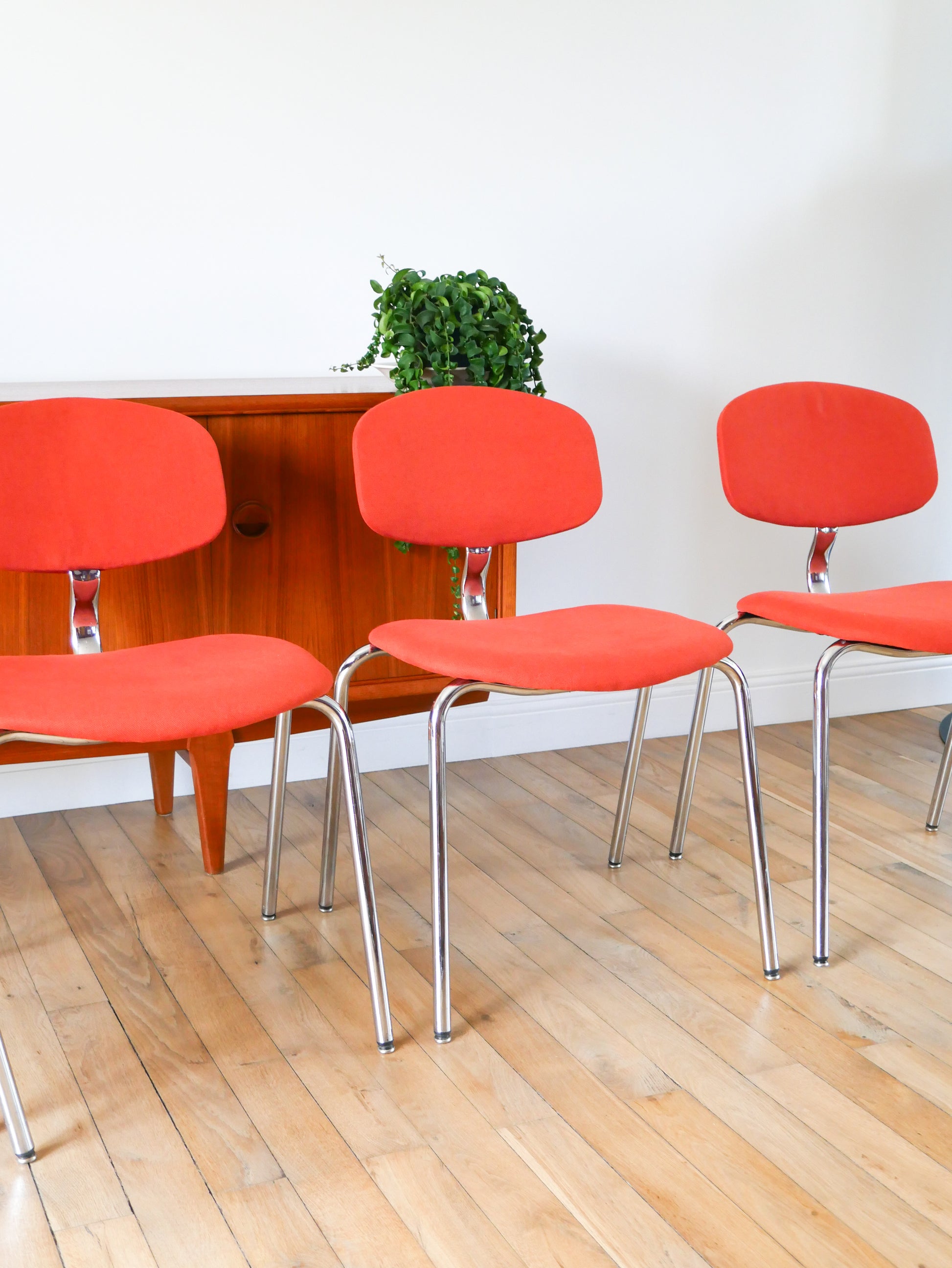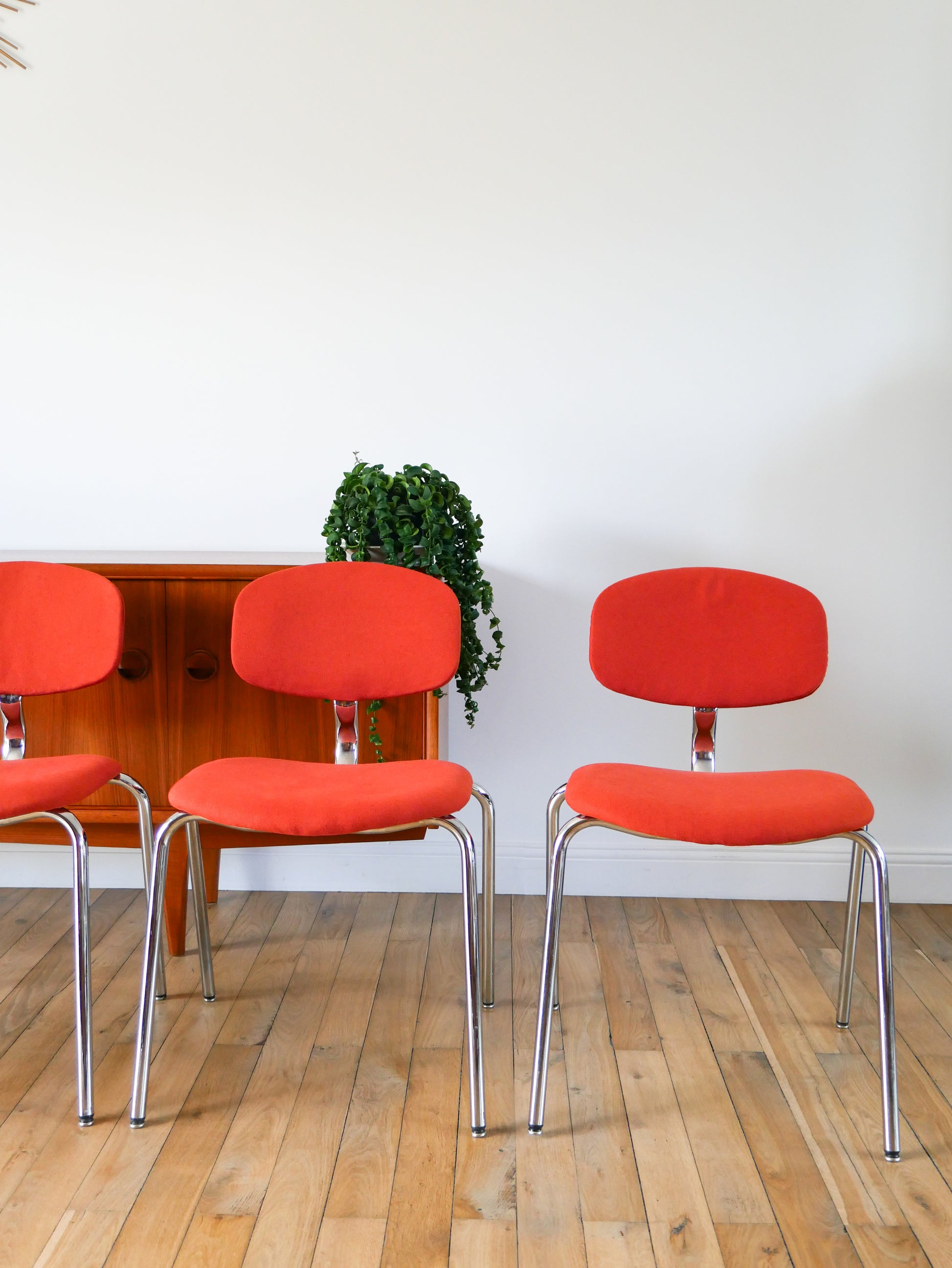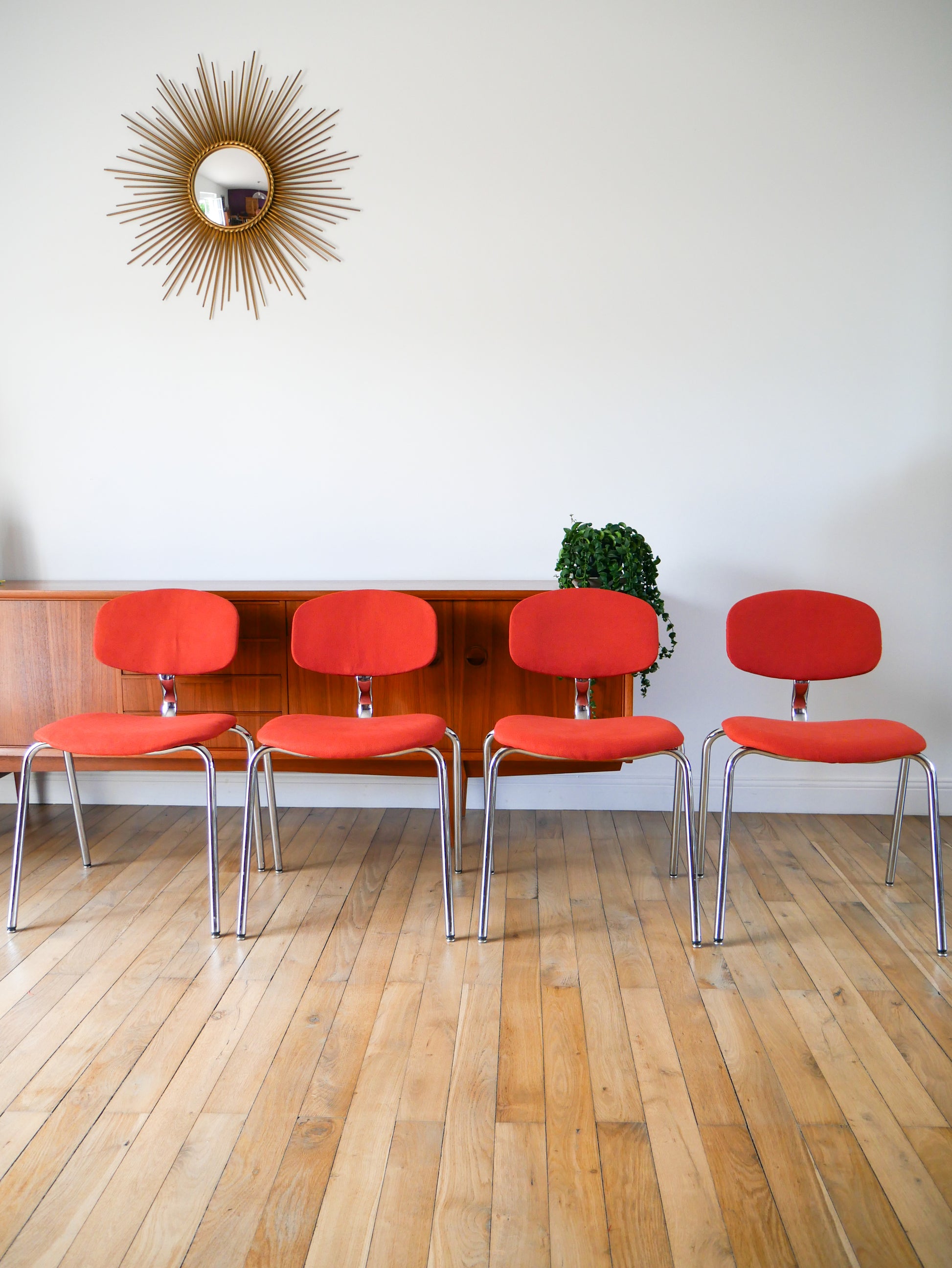 Superbe ensemble de 4 chaises Strafor par Pierre Paulin, retapissées Orange, 1970. En excellent état. Envoi rapide et soigné. Possibilité d'envois groupés - plus économique et plus écologique ! Dimensions : 78 X 46 X 42 cm ; hauteur d'assise : 46 cm.