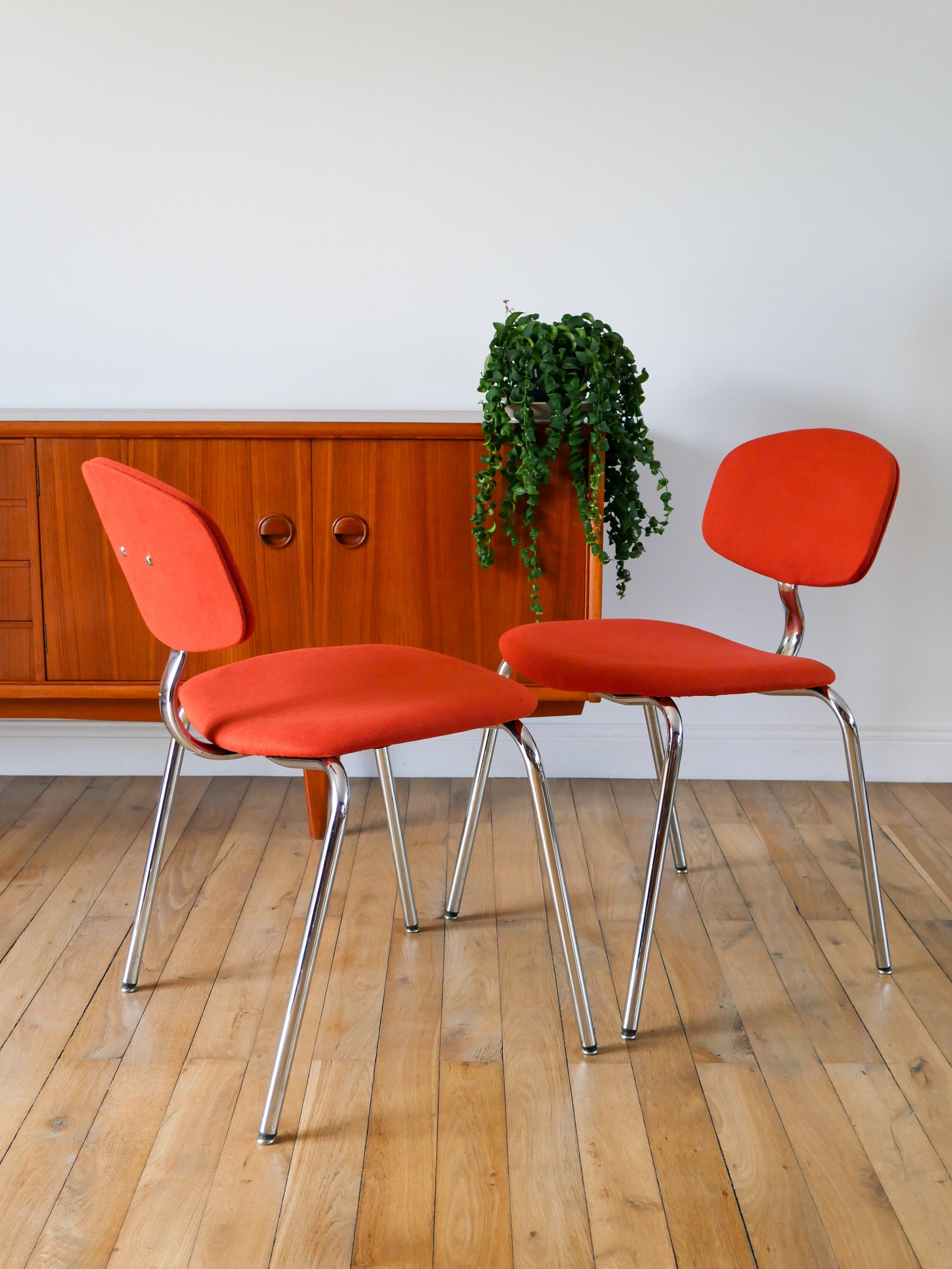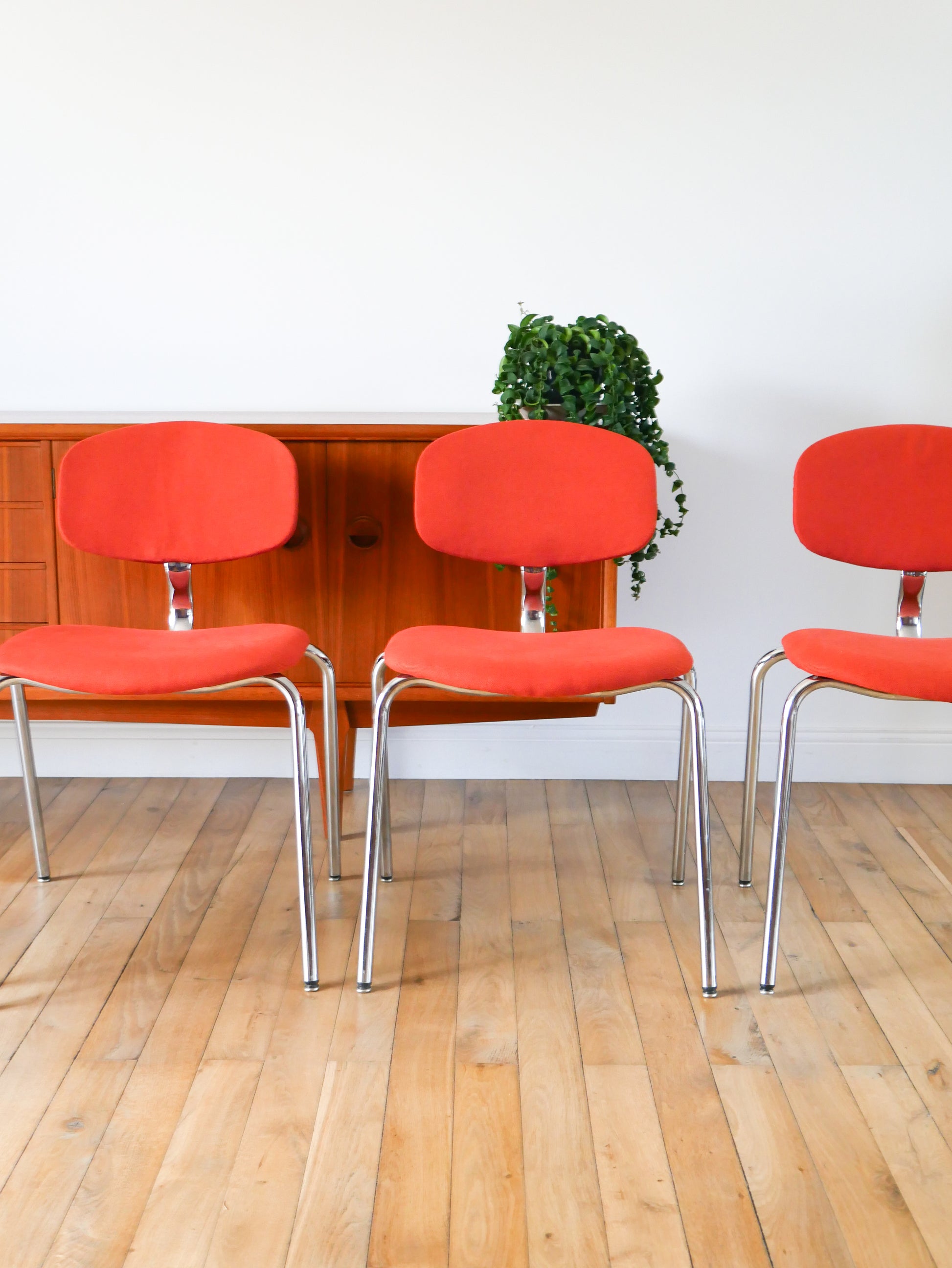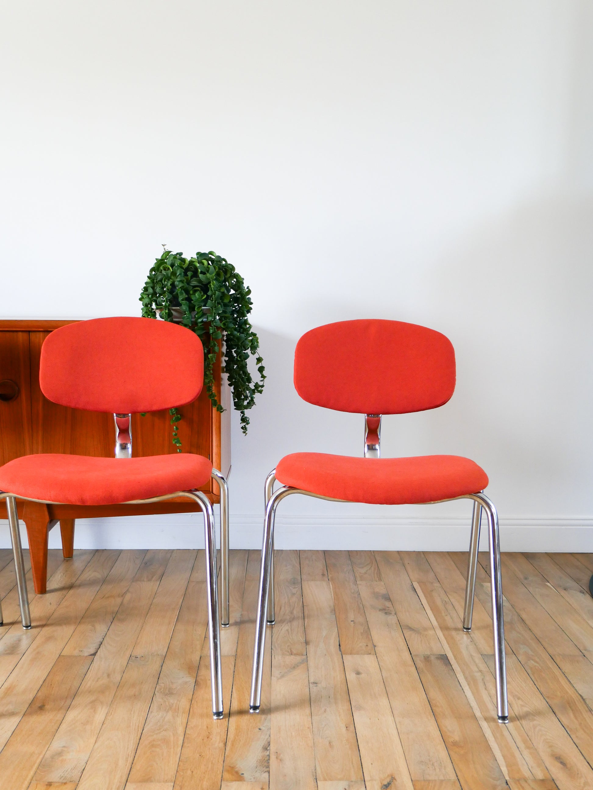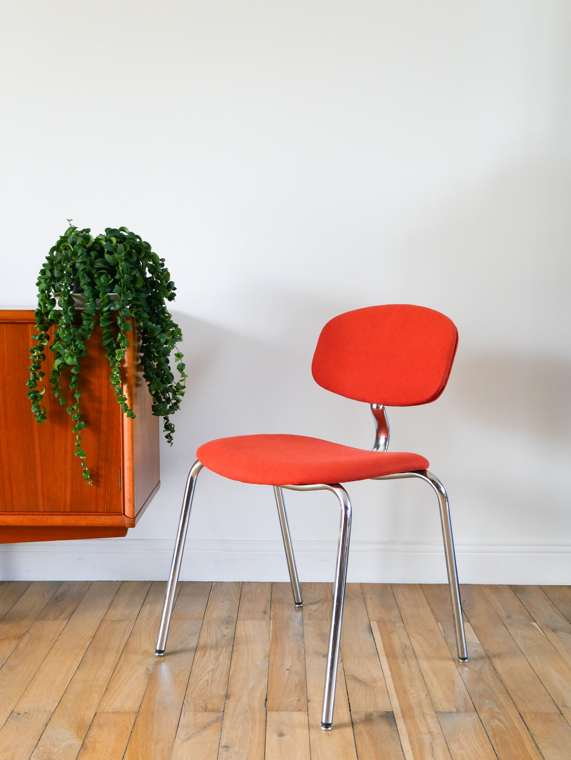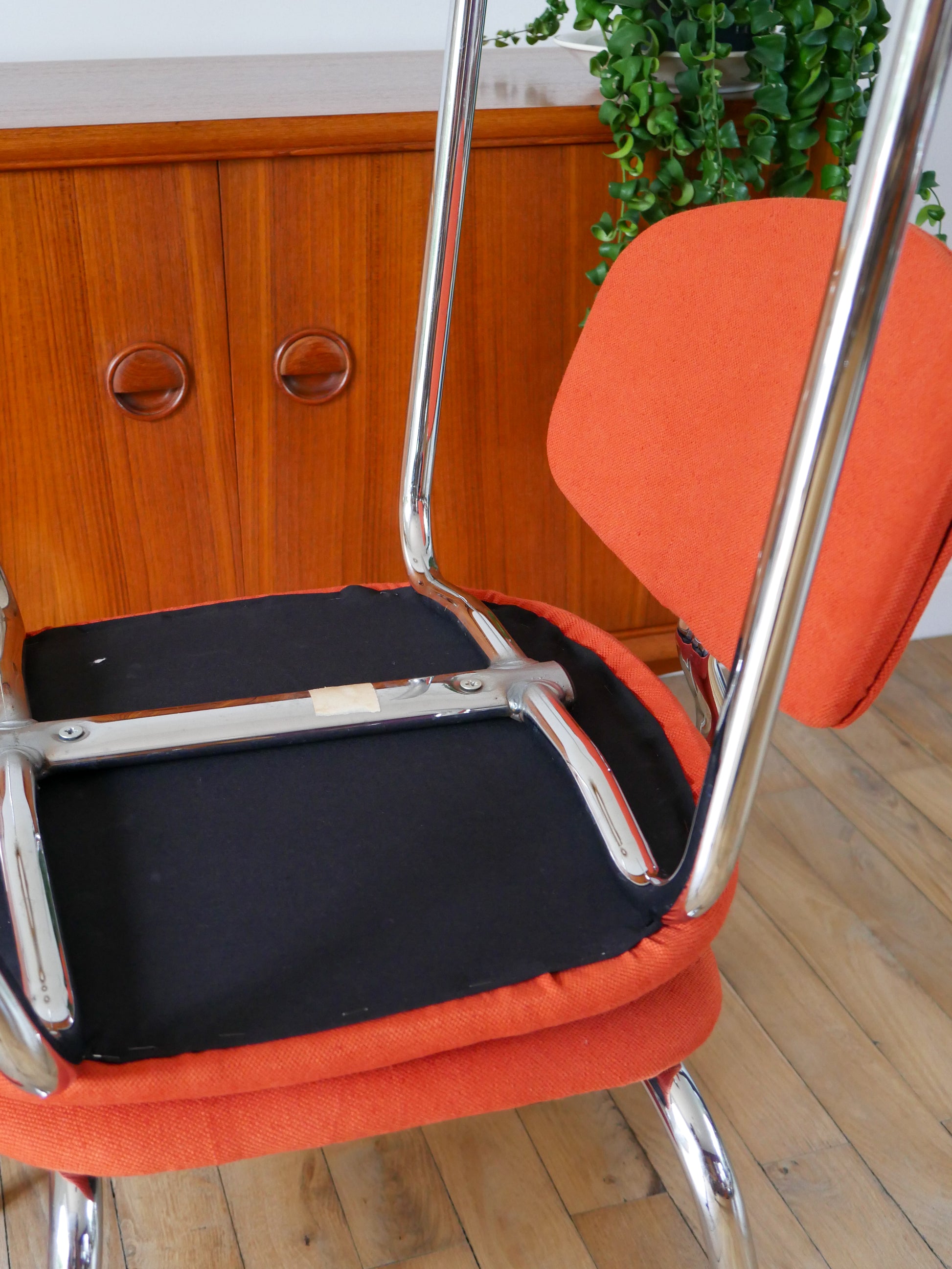 Superbe ensemble de 4 chaises Strafor par Pierre Paulin, retapissées Orange, 1970. En excellent état. Envoi rapide et soigné. Possibilité d'envois groupés - plus économique et plus écologique ! Dimensions : 78 X 46 X 42 cm ; hauteur d'assise : 46 cm.