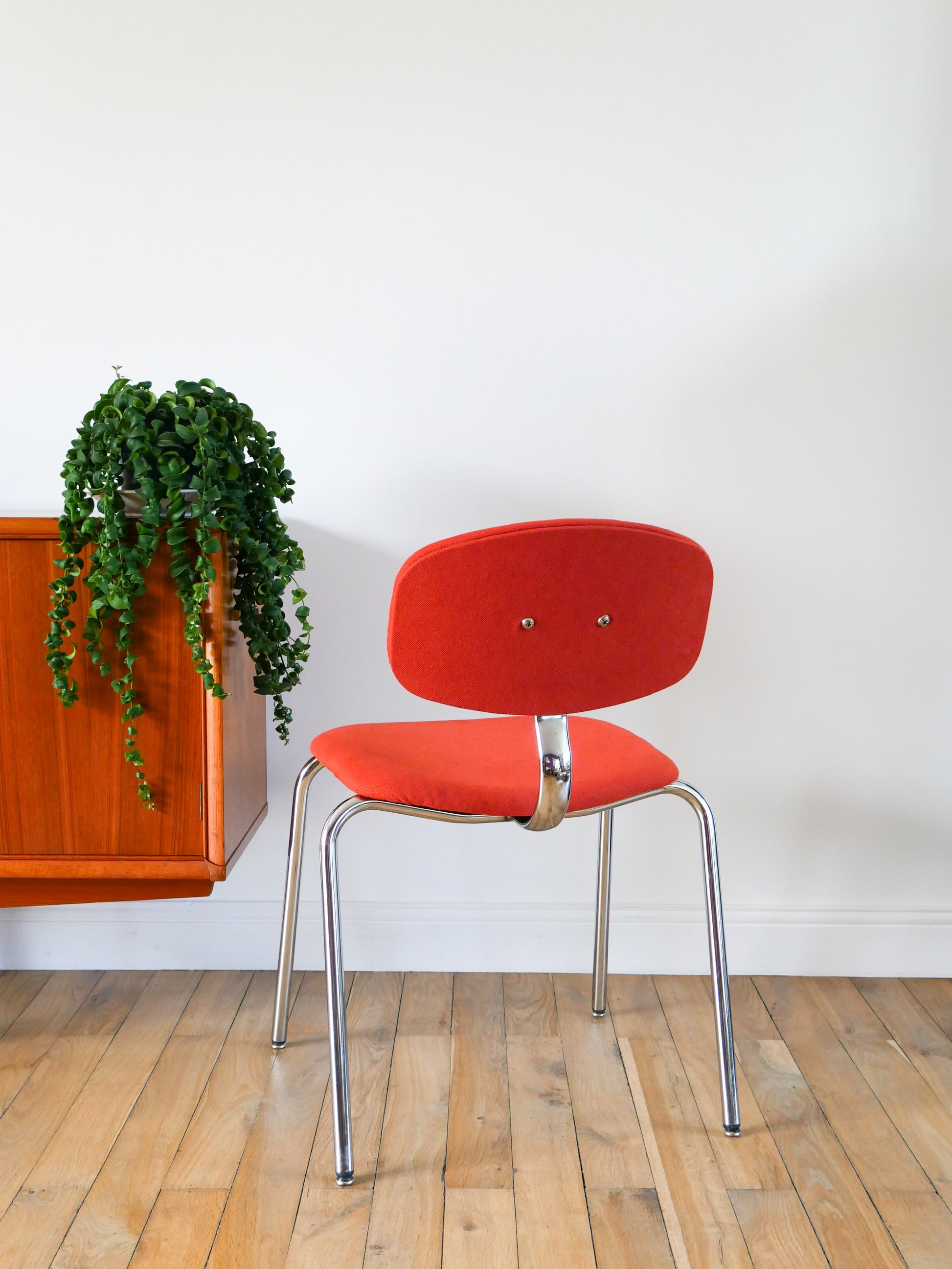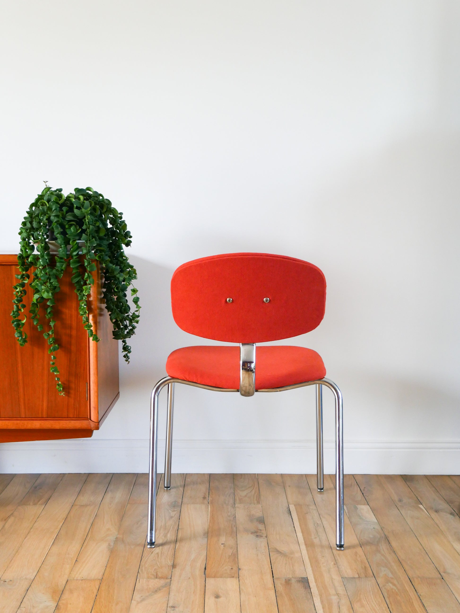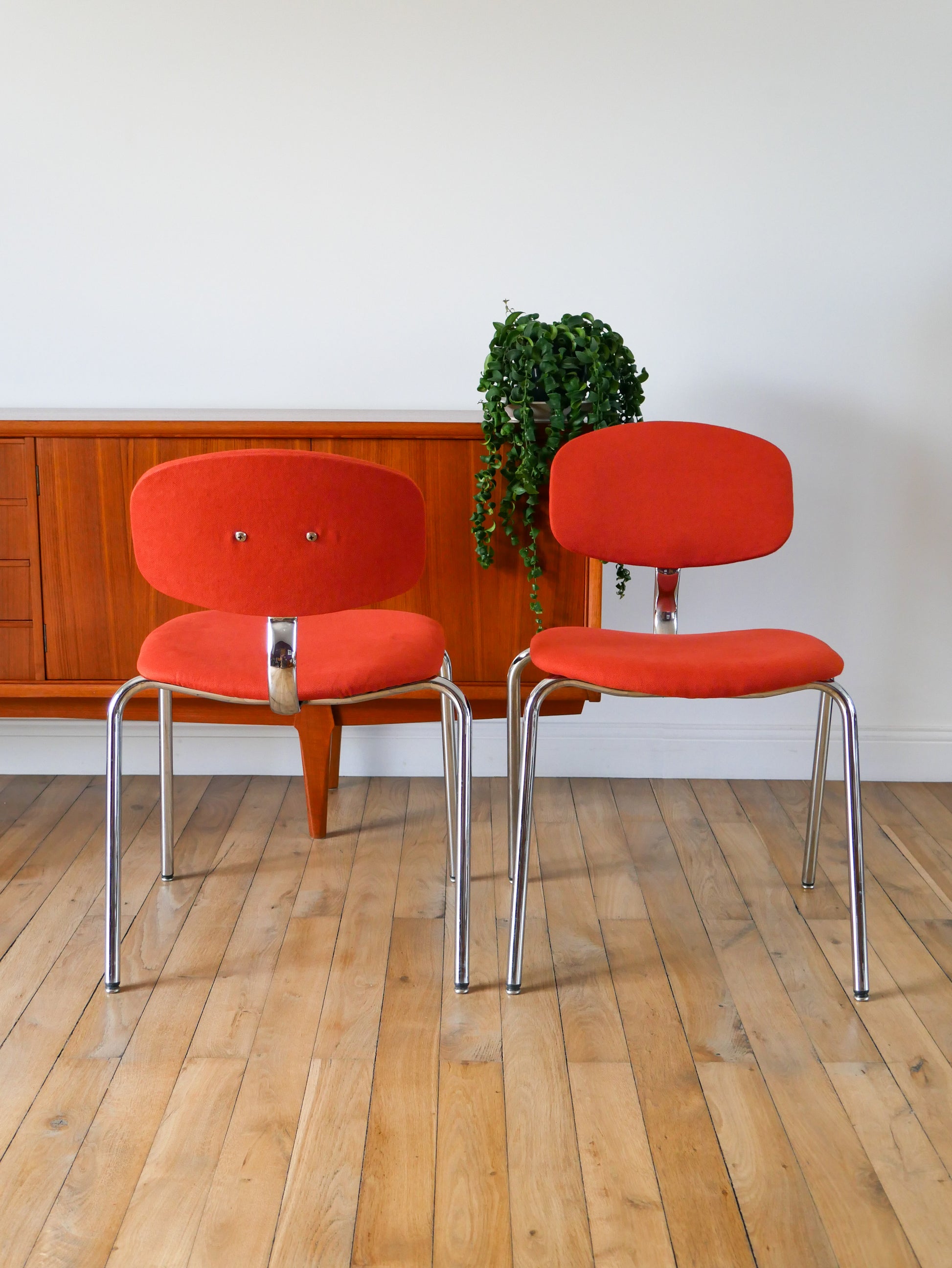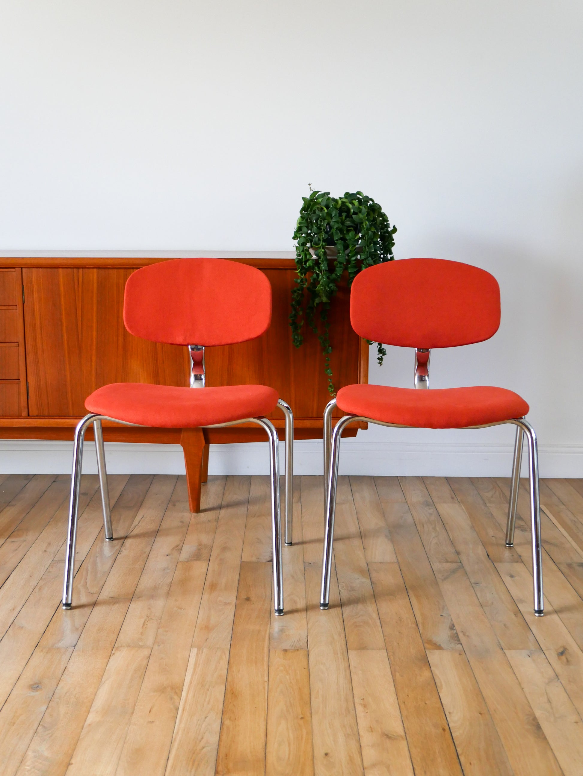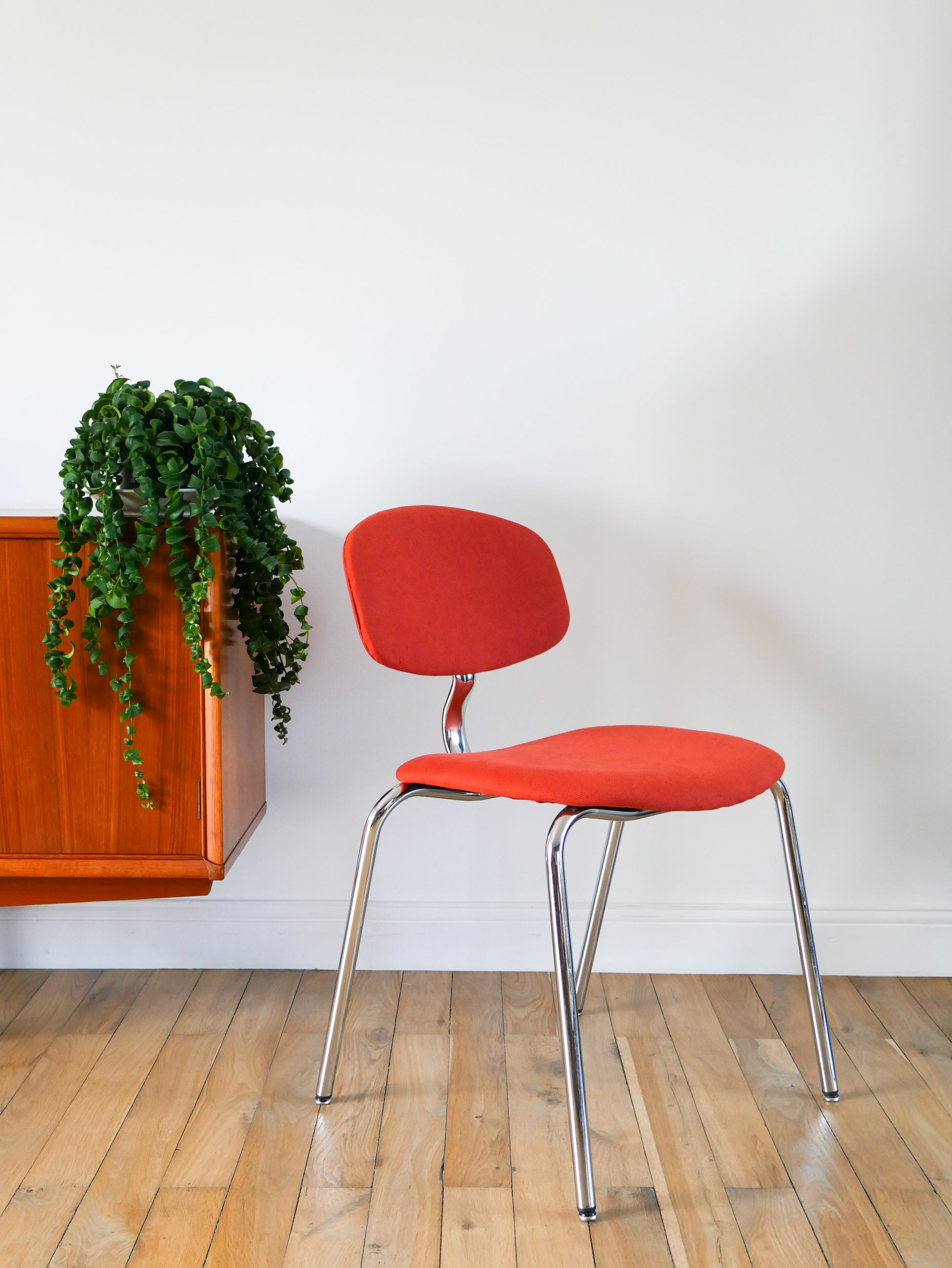 Superbe ensemble de 4 chaises Strafor par Pierre Paulin, retapissées Orange, 1970. En excellent état. Envoi rapide et soigné. Possibilité d'envois groupés - plus économique et plus écologique ! Dimensions : 78 X 46 X 42 cm ; hauteur d'assise : 46 cm.