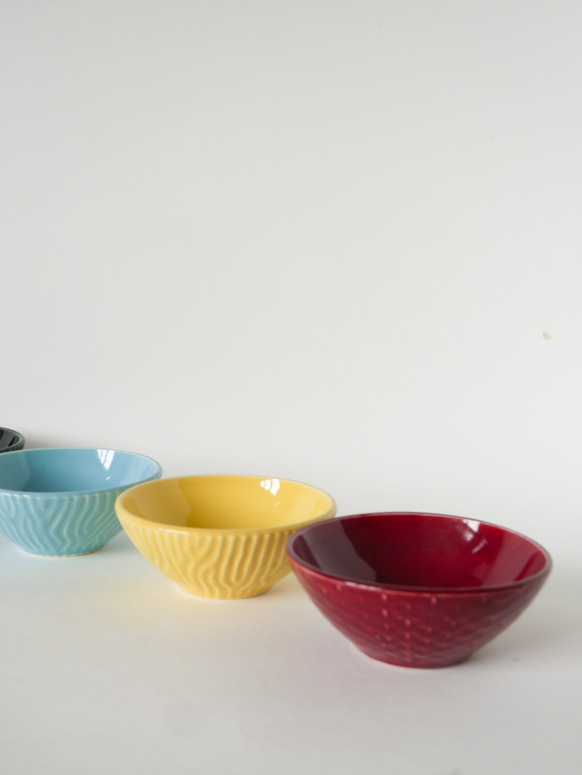 Superbe ensemble de 4 petits bols en céramique, Effet Bambou, Sarreguemines, 1960. En très bon état, de rares traces du temps. Envoi rapide et soigné. Possibilité d'envois groupés - plus économique et plus écologique ! Dimensions : 12 X 5 cm.