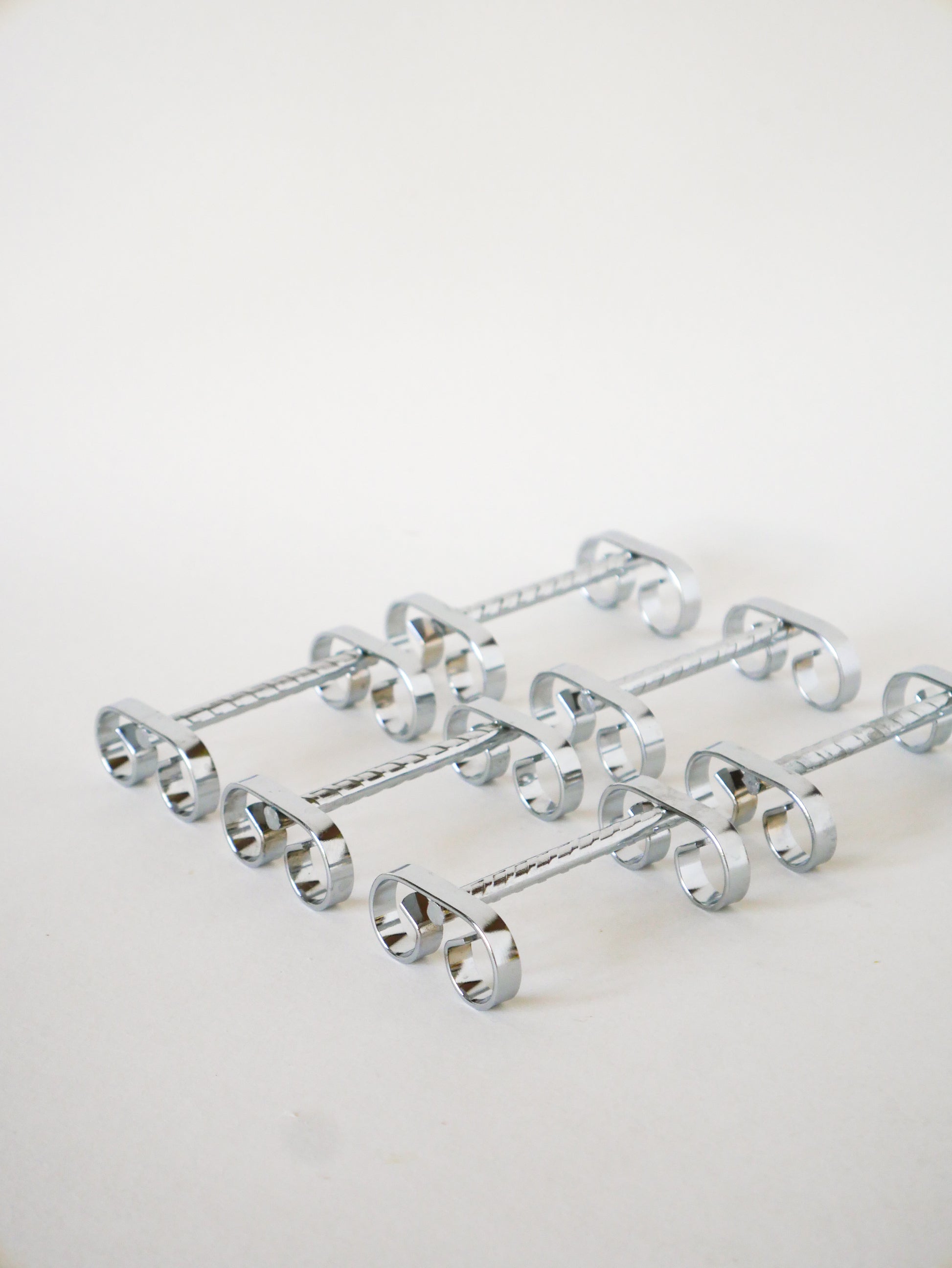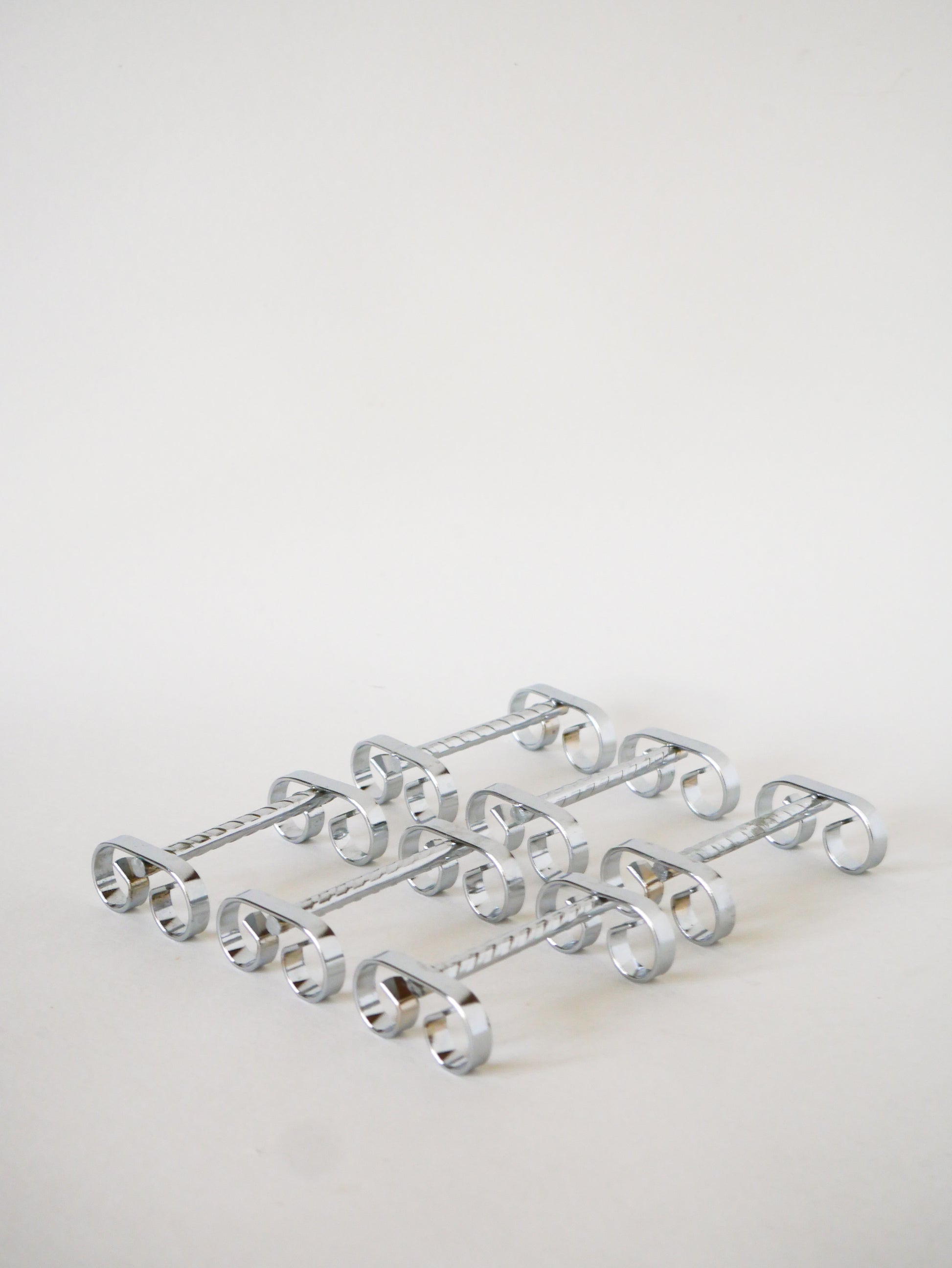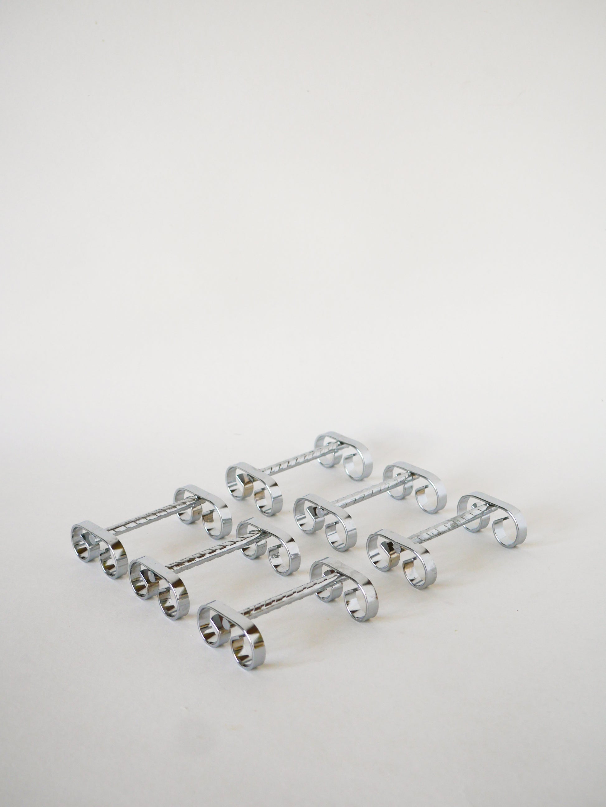 Joli ensemble de 6 porte-couteaux travaillés en inox, 1970. En très bon état, de rares traces du temps. Envoi rapide et soigné. Possibilité d'envois groupés - plus économique et plus écologique ! Dimensions : 11 cm.