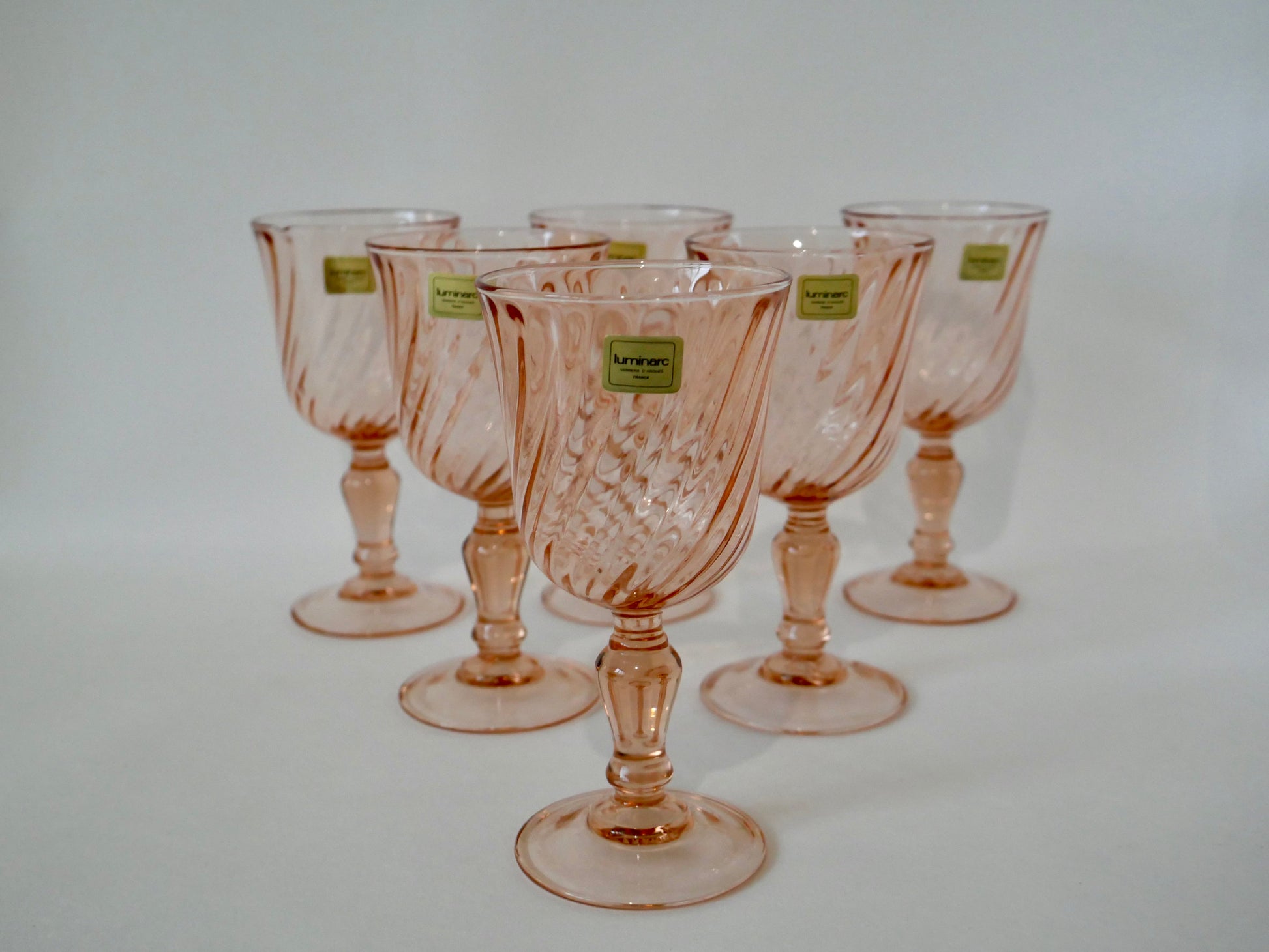 Magnifique ensemble de 6 verres à vin Rosaline Luminarc en verre rose facetté 18cl années 60. En excellent état. 2 lots disponibles. Dimensions : 14.5 X 7.3 cm.