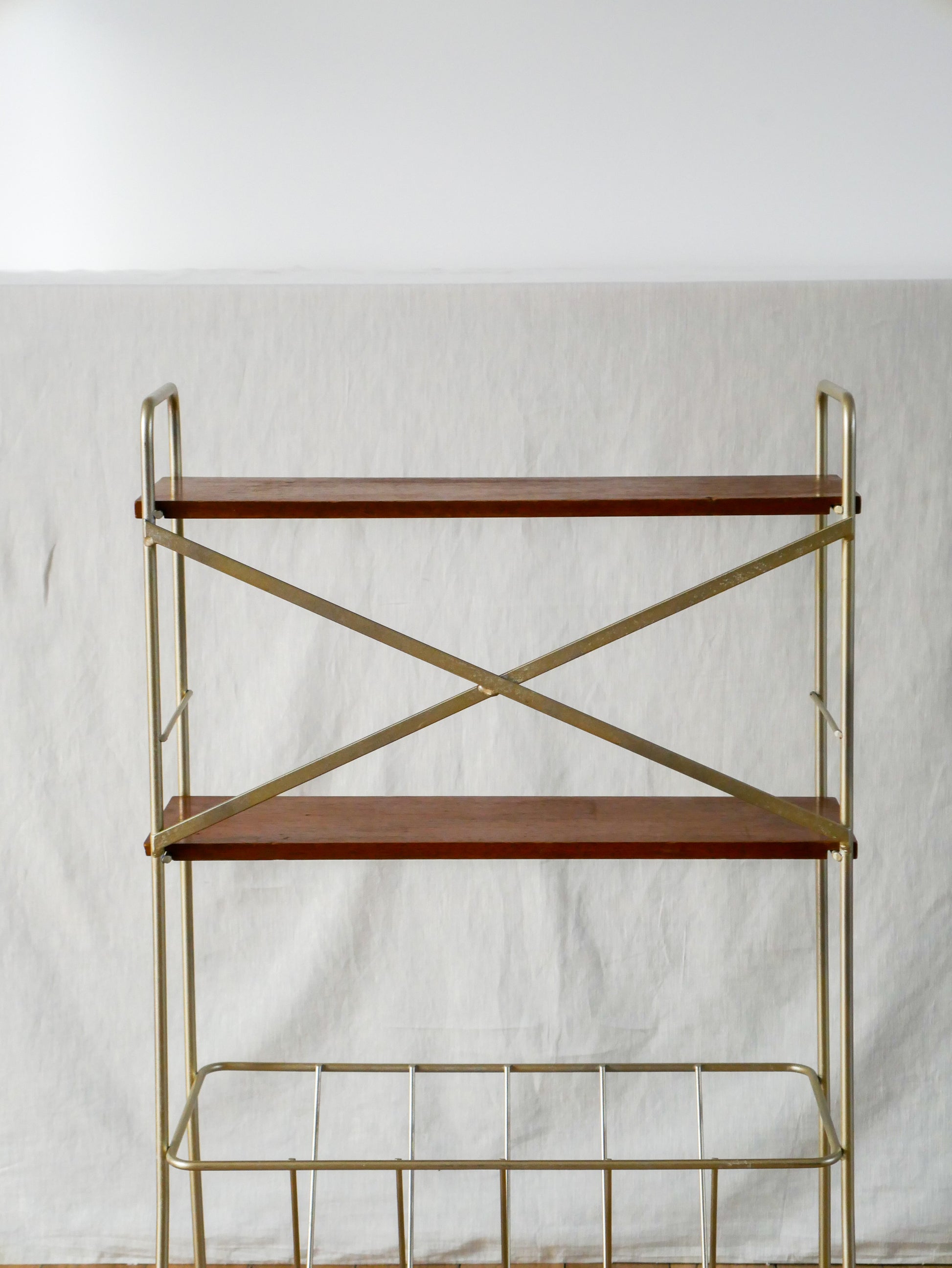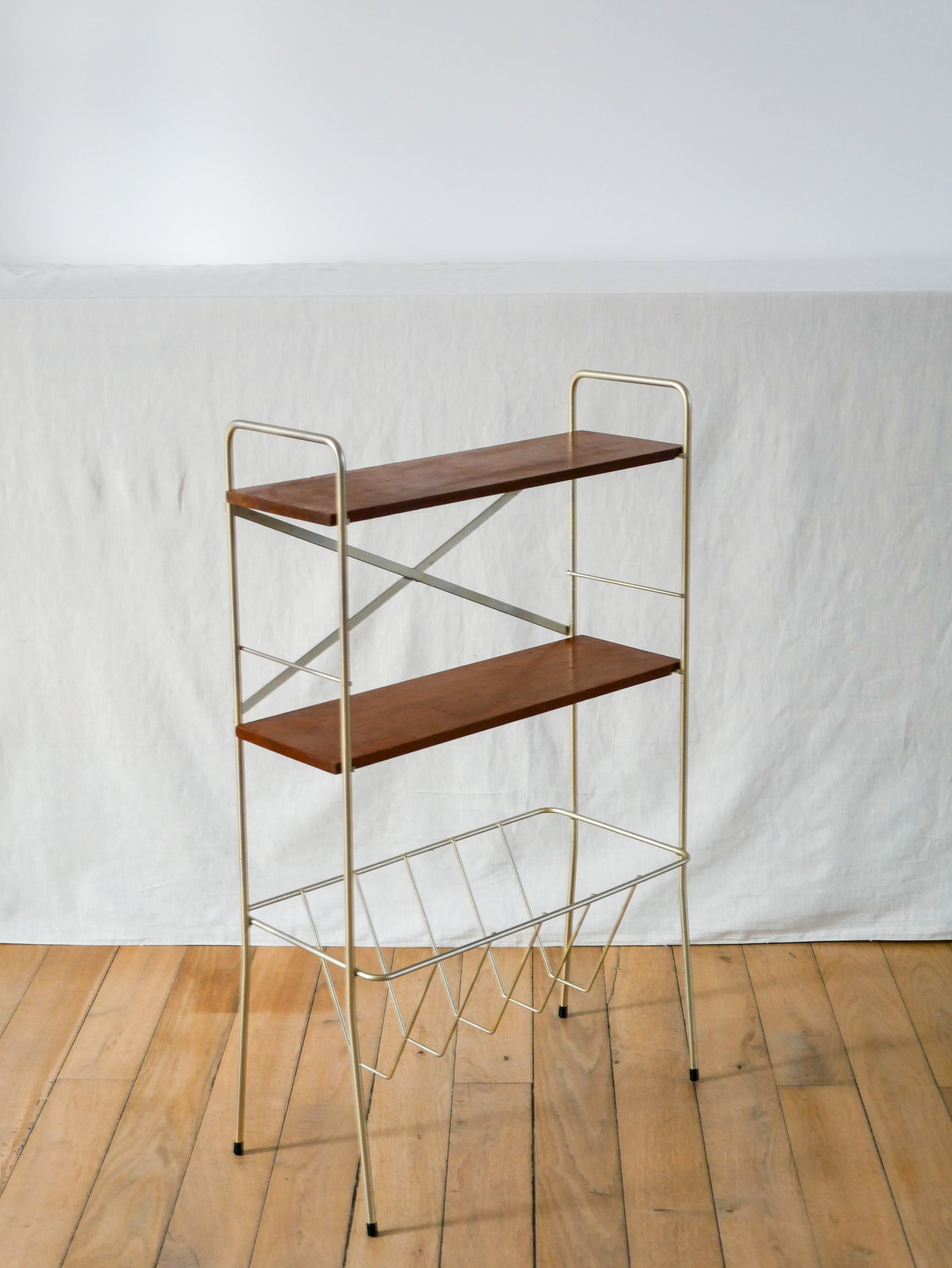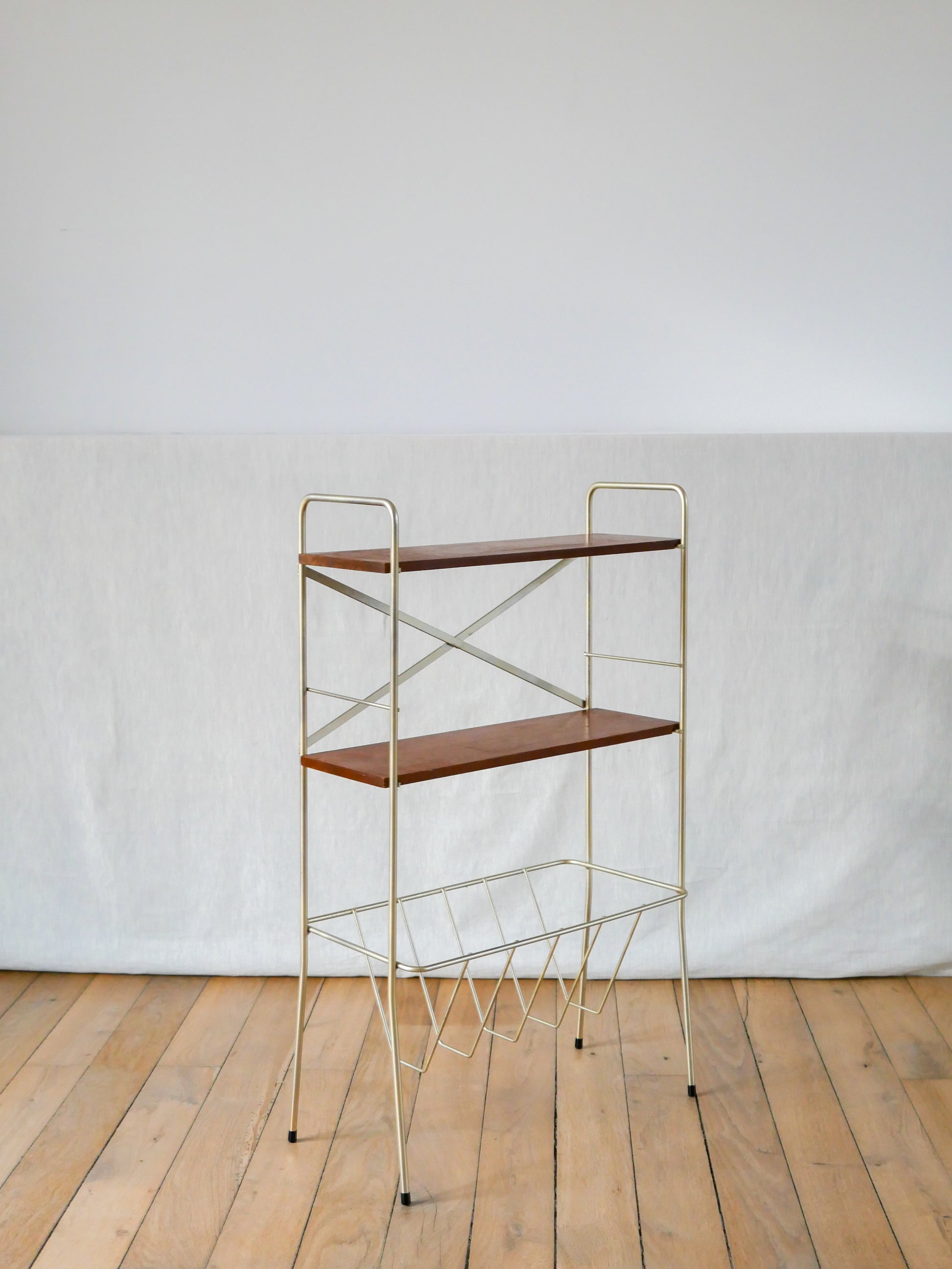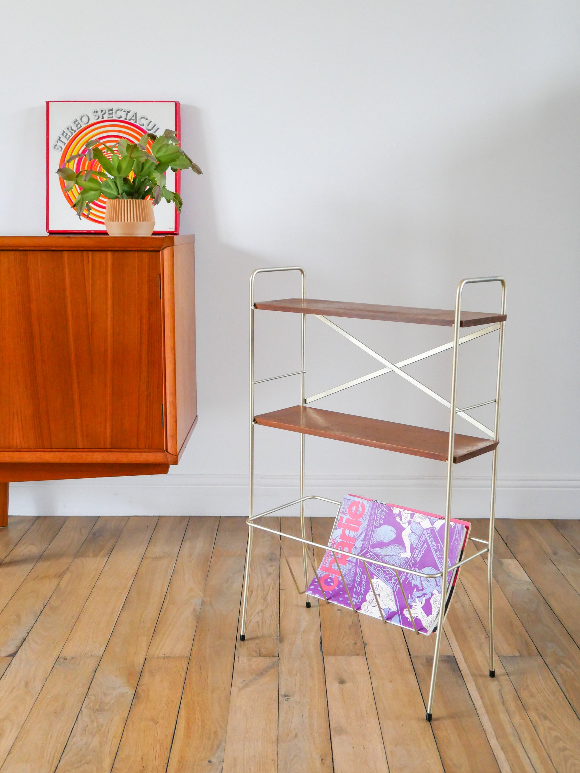 Étagère porte-revue range-vinyle en laiton doré et teck, Mid-century, 1960