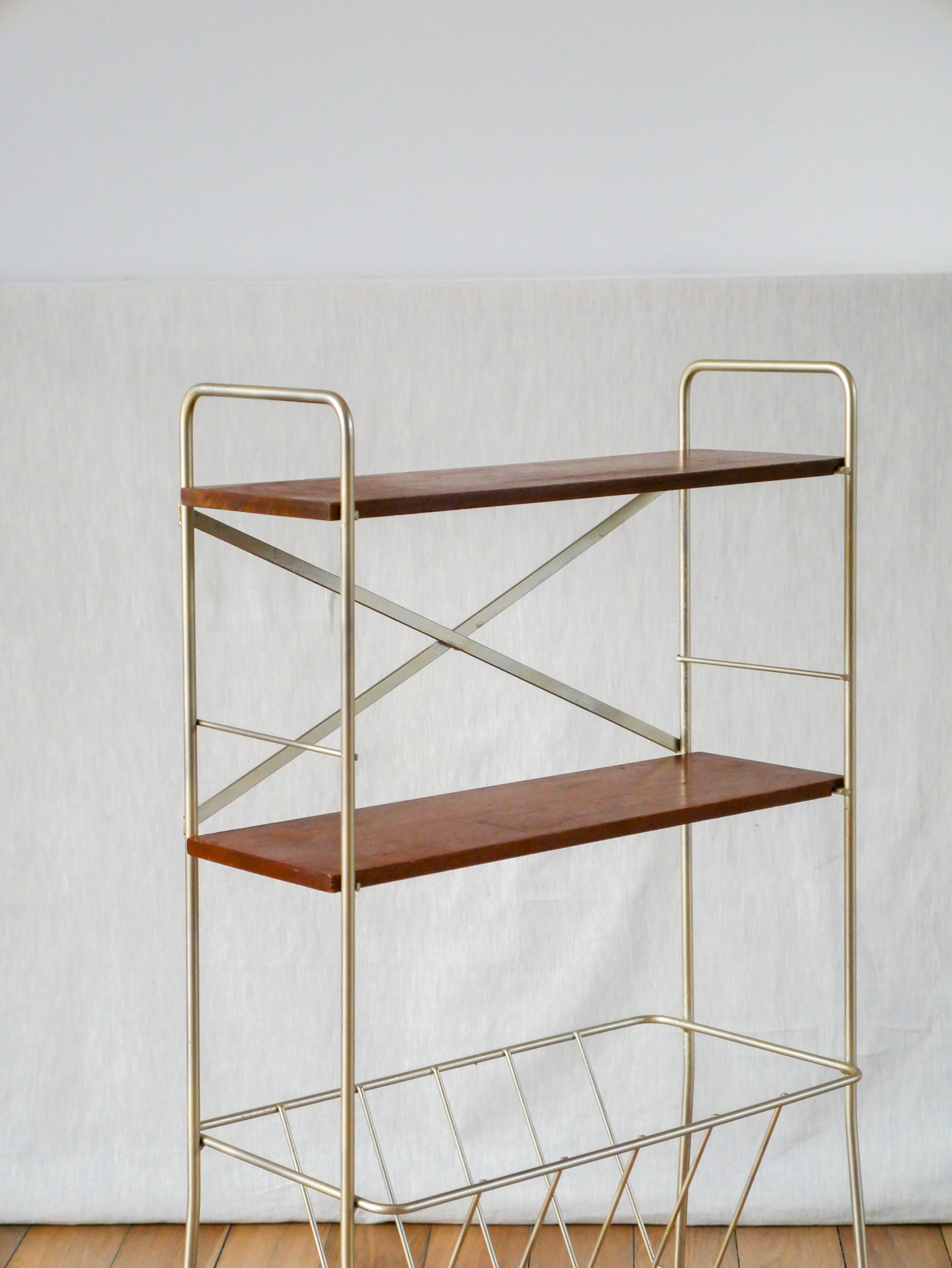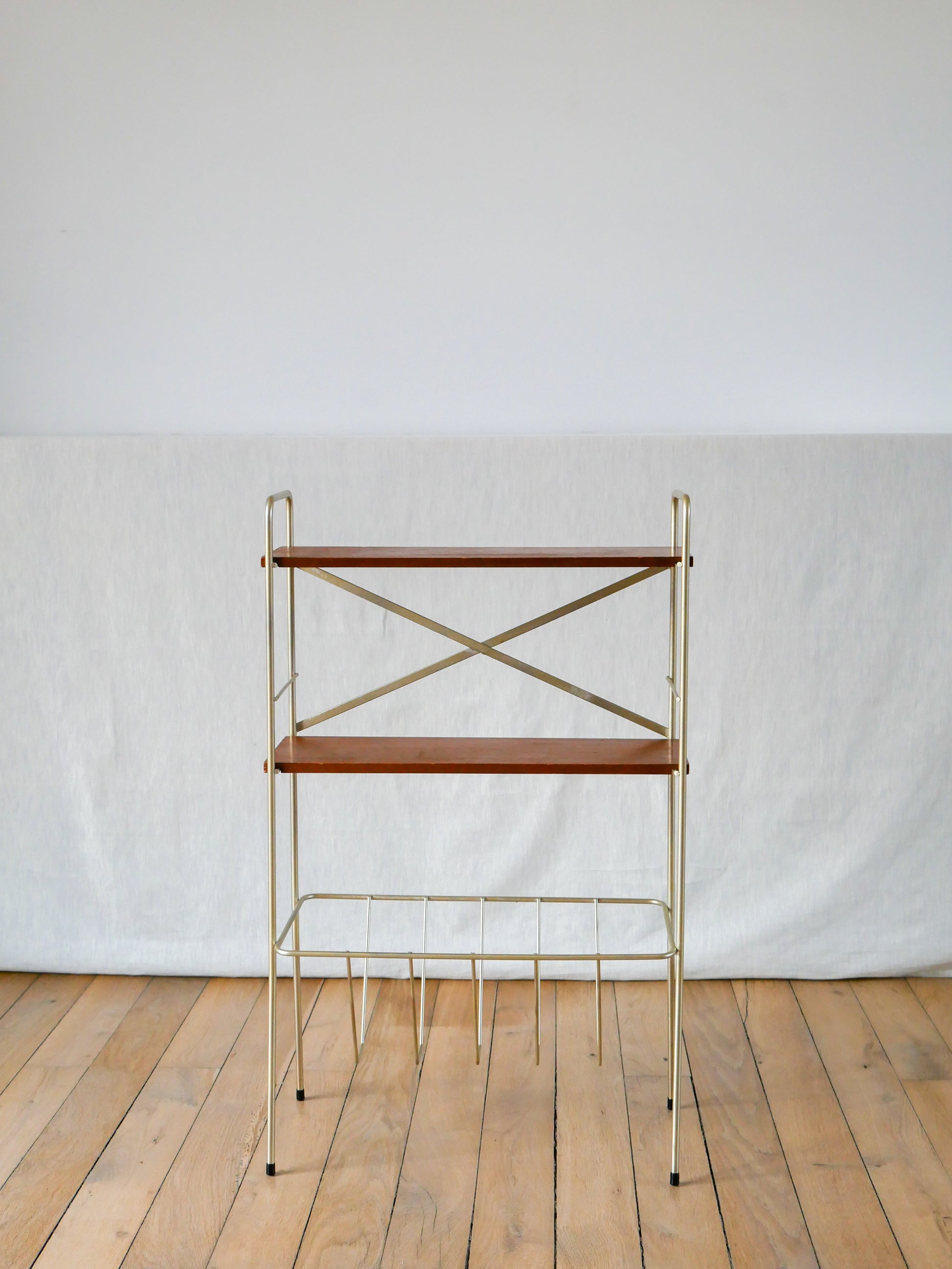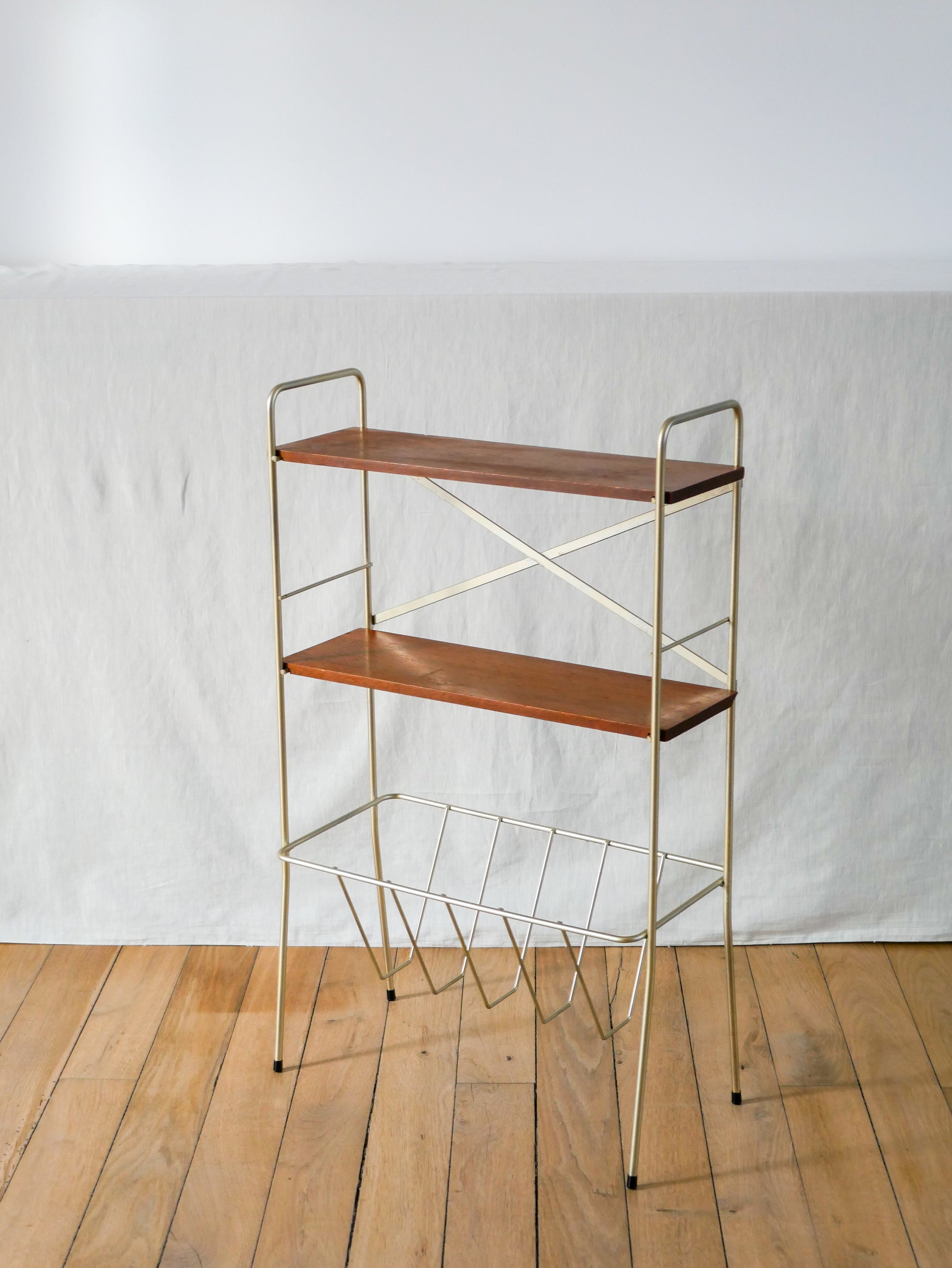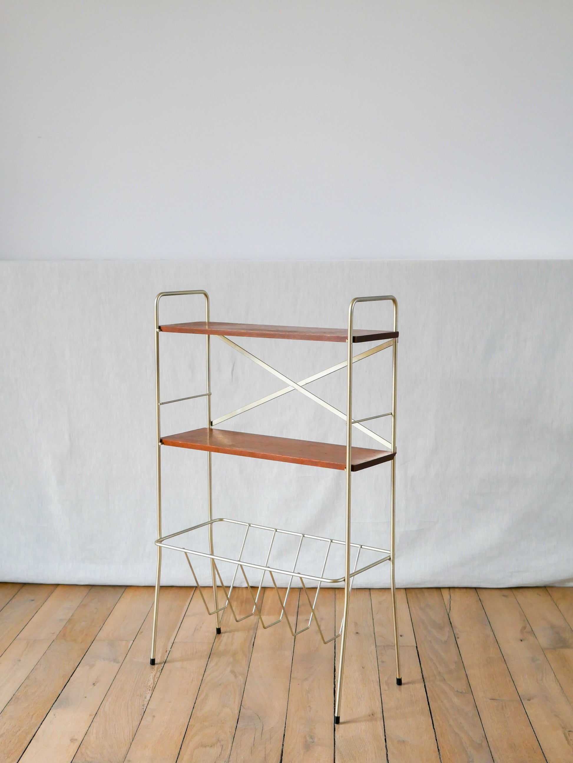 Étagère porte-revue range-vinyle en laiton doré et teck, Mid-century, 1960