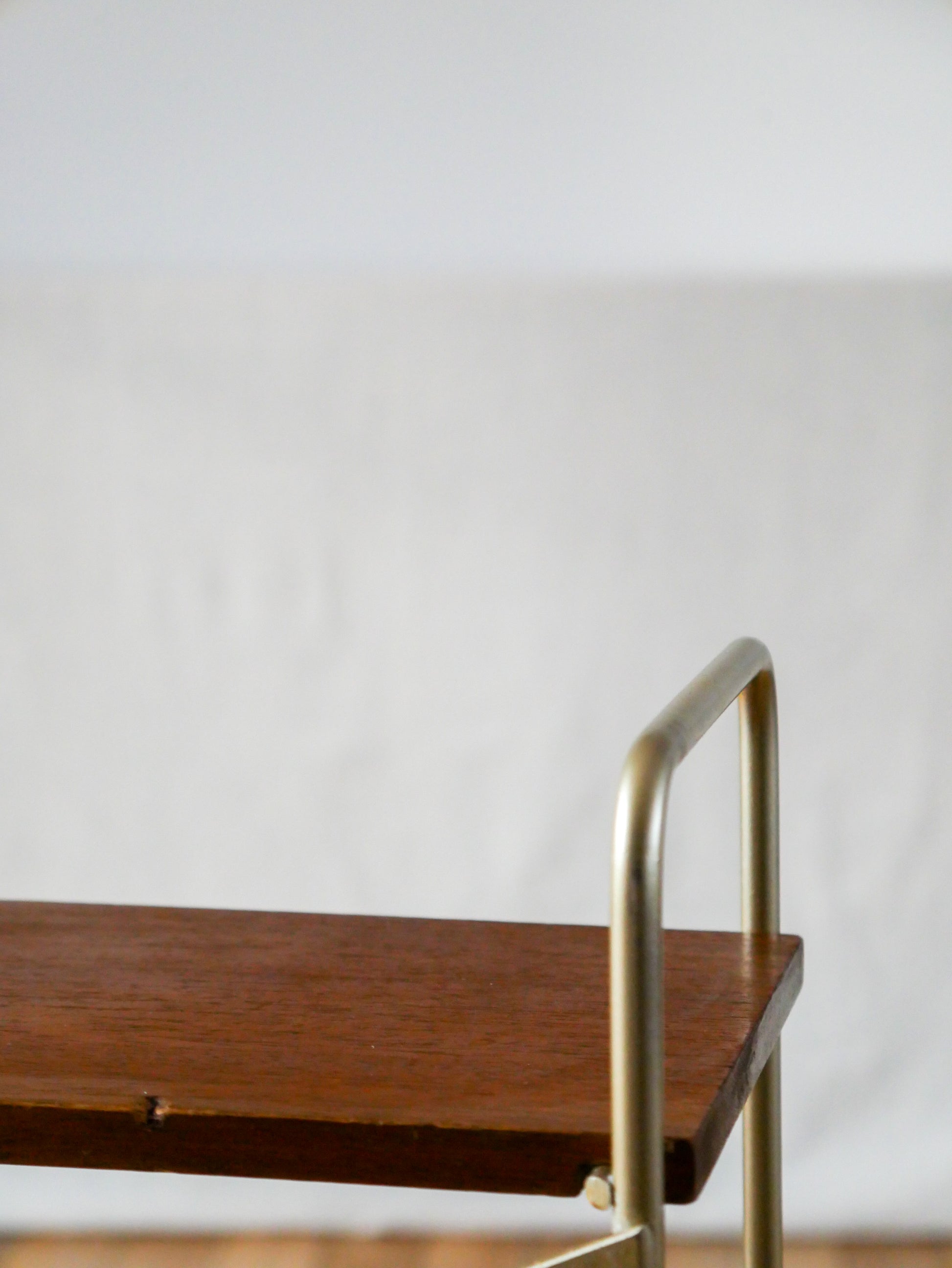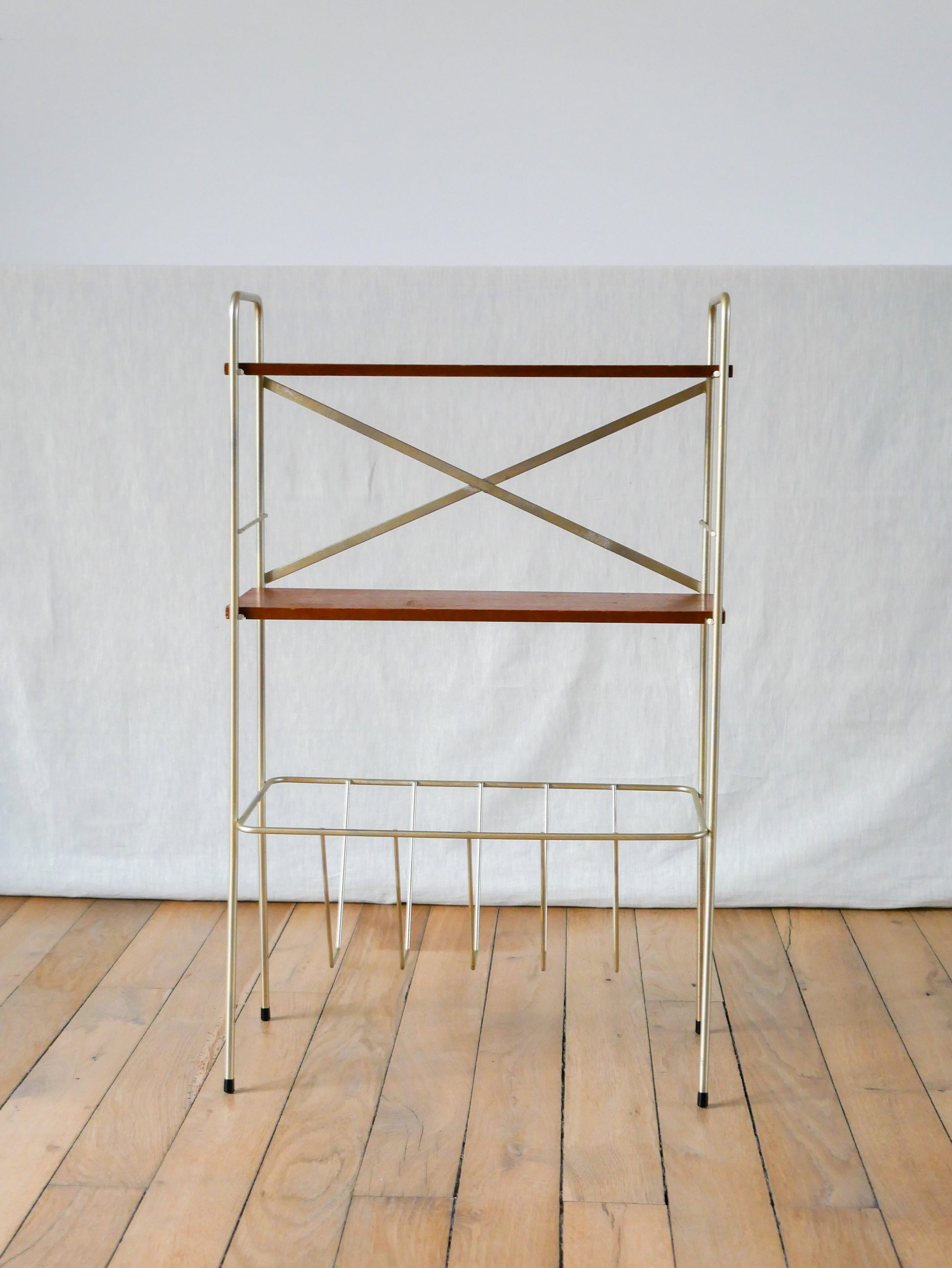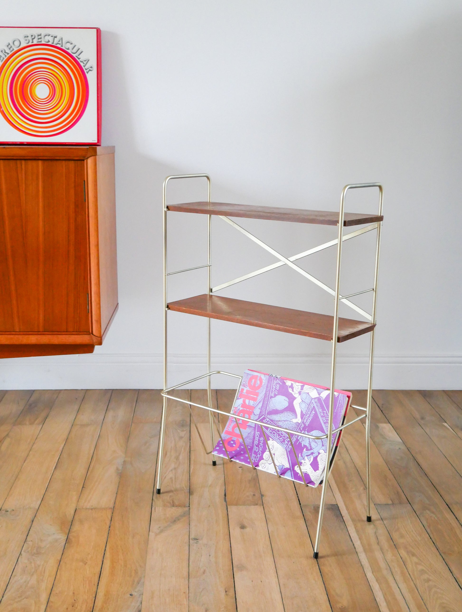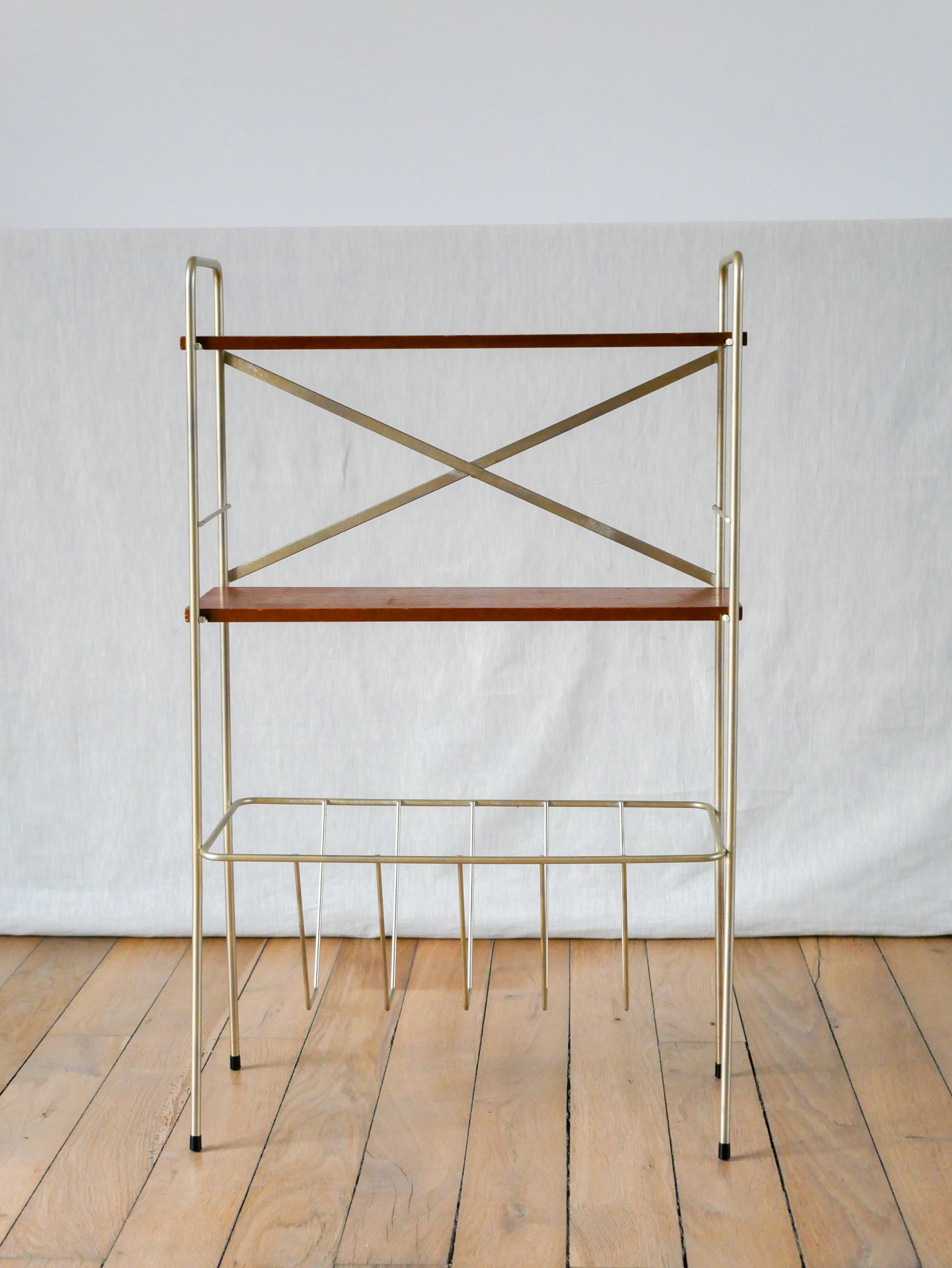 Étagère porte-revue range-vinyle en laiton doré et teck, Mid-century, 1960