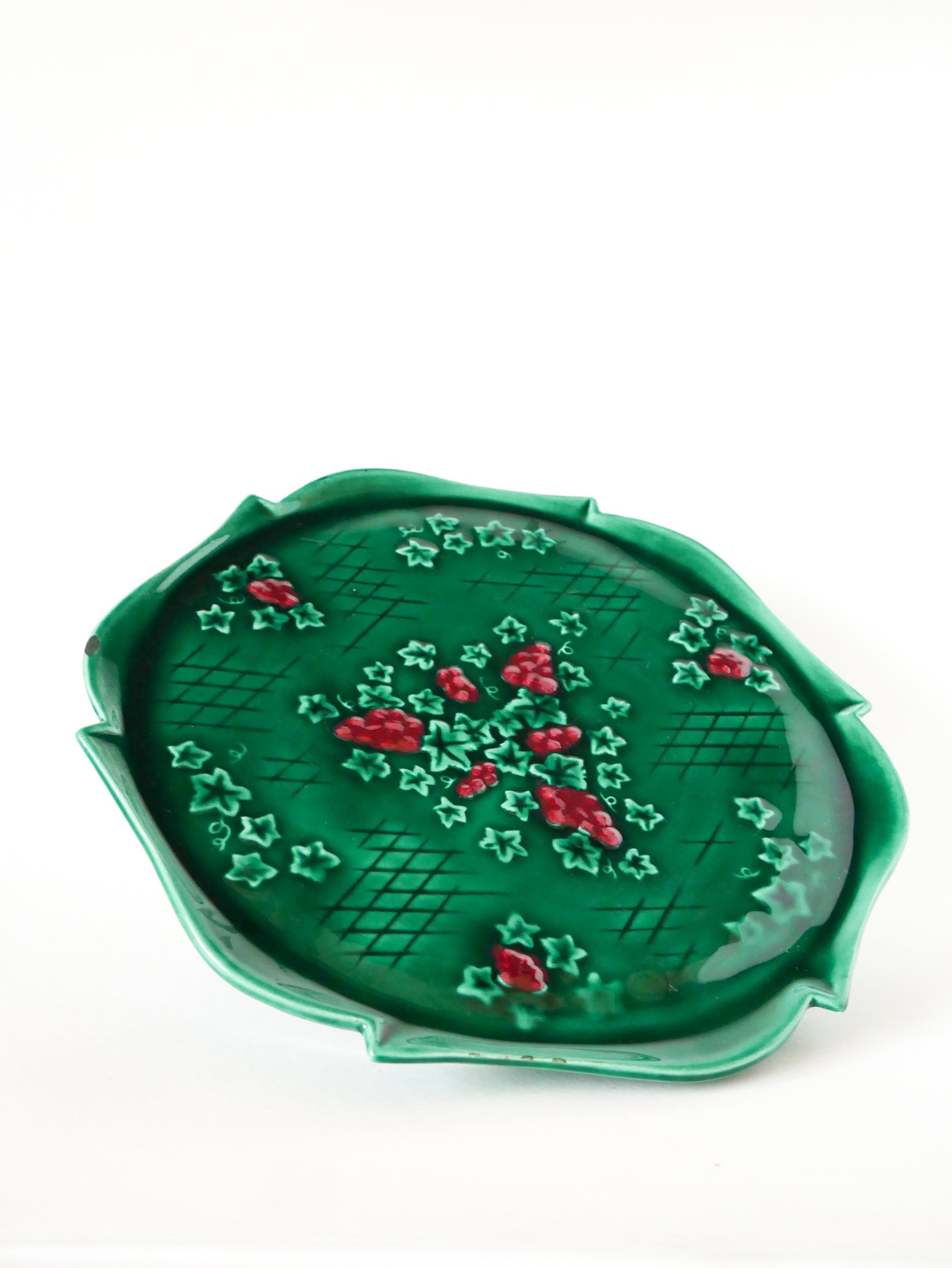 Grand plat à gâteaux en barbotine, Vert & Bordeaux, 1970