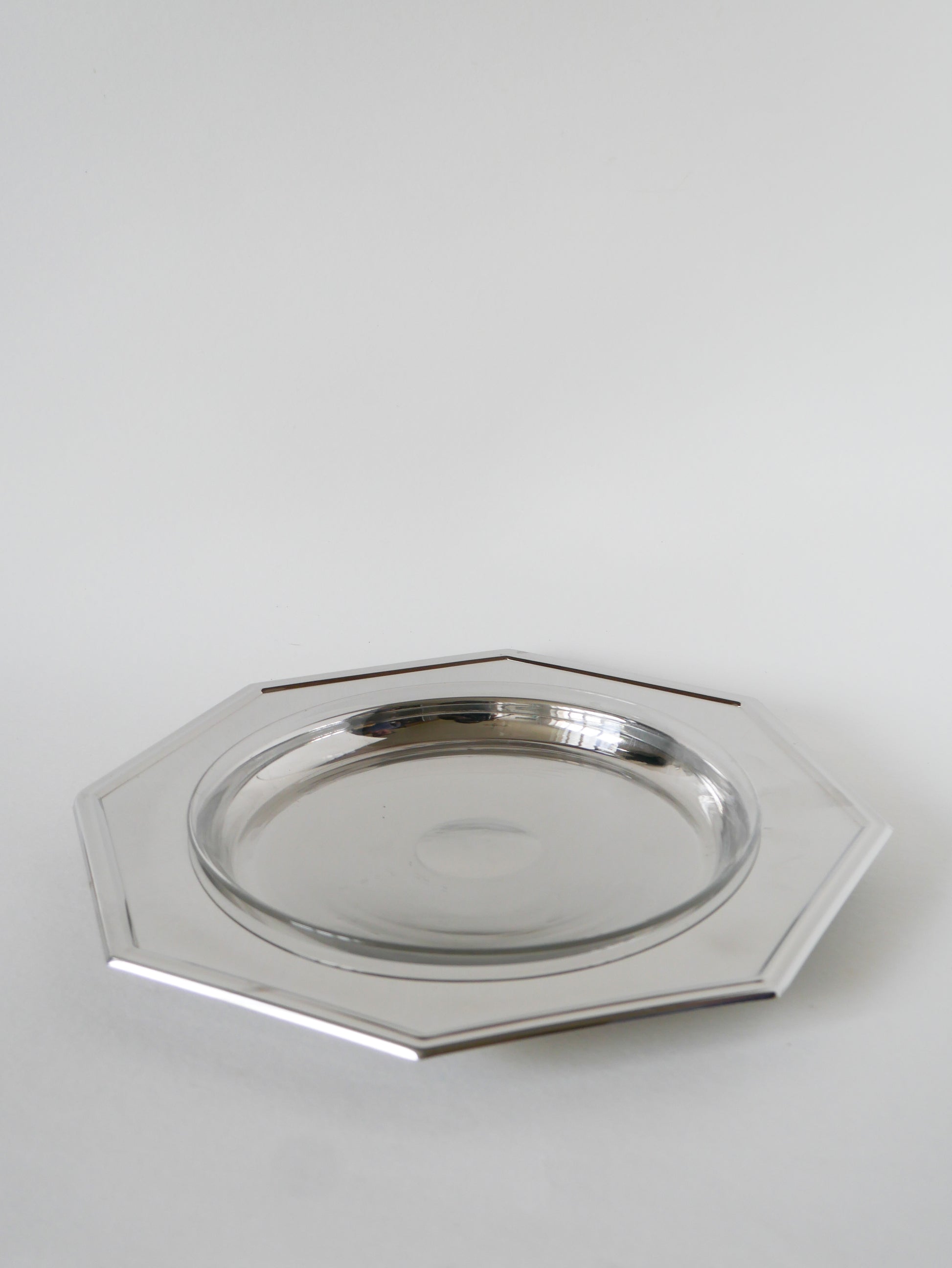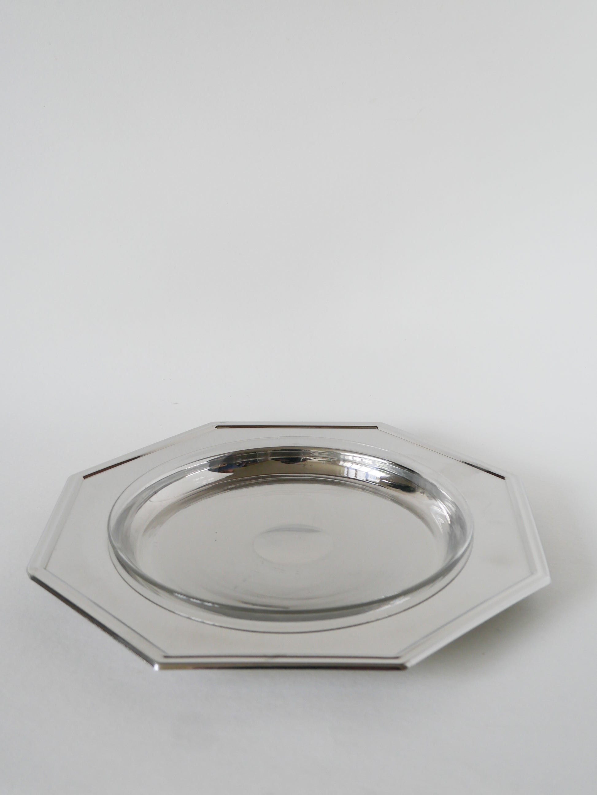 Joli grand plat hexagonal en inox et verre, Design, 1970. En très bon état, de rares traces du temps. Envoi rapide et soigné. Possibilité d'envois groupés - plus économique et plus écologique ! Dimensions : 28.5 cm .