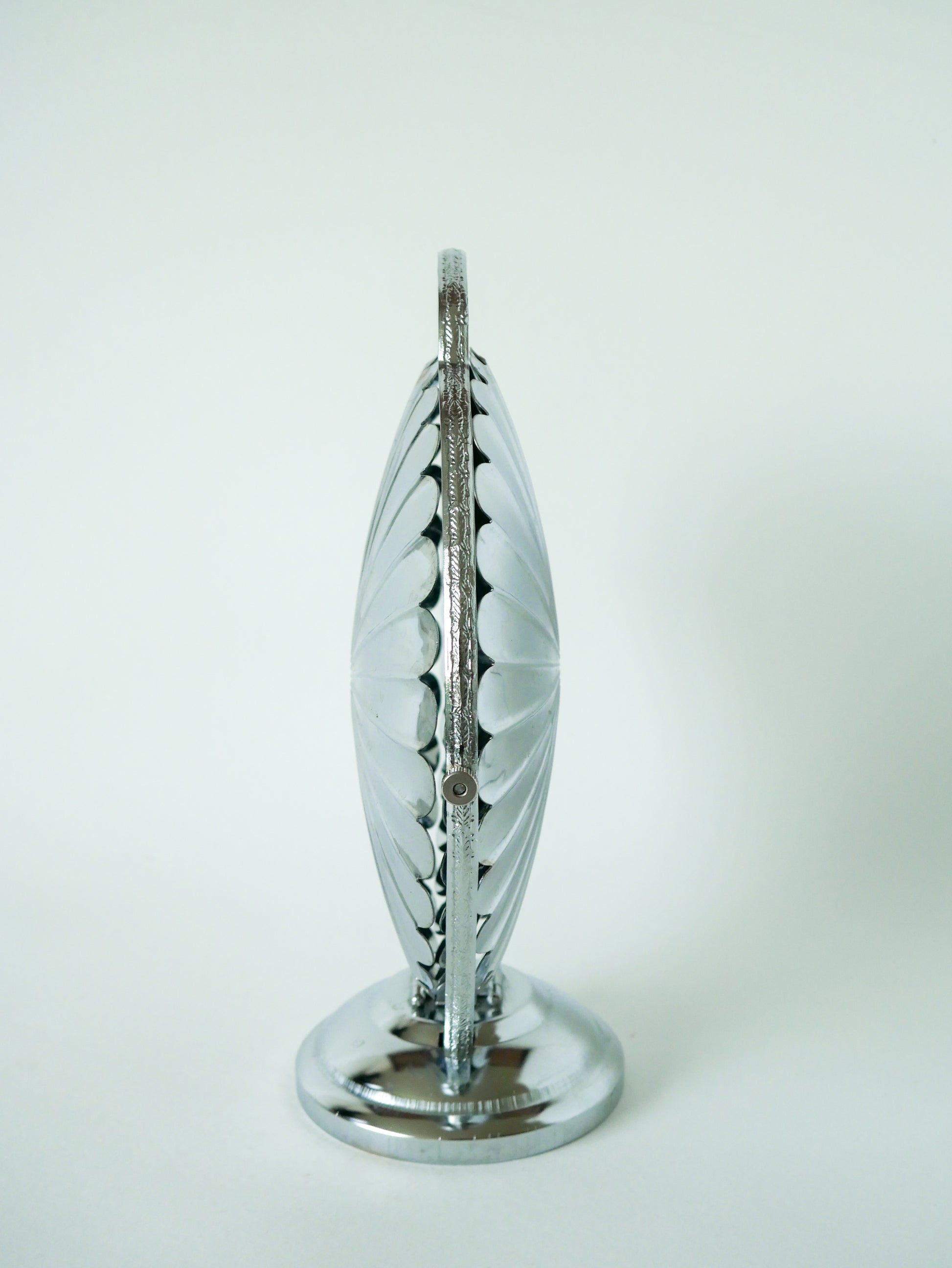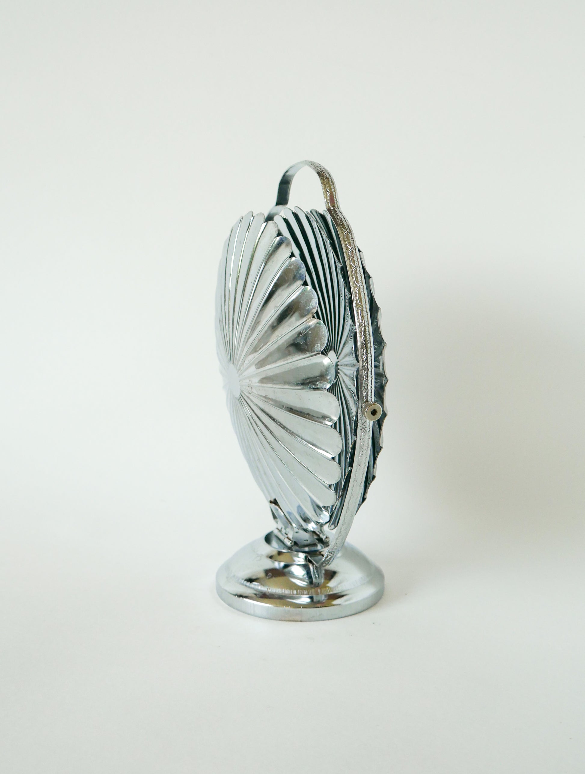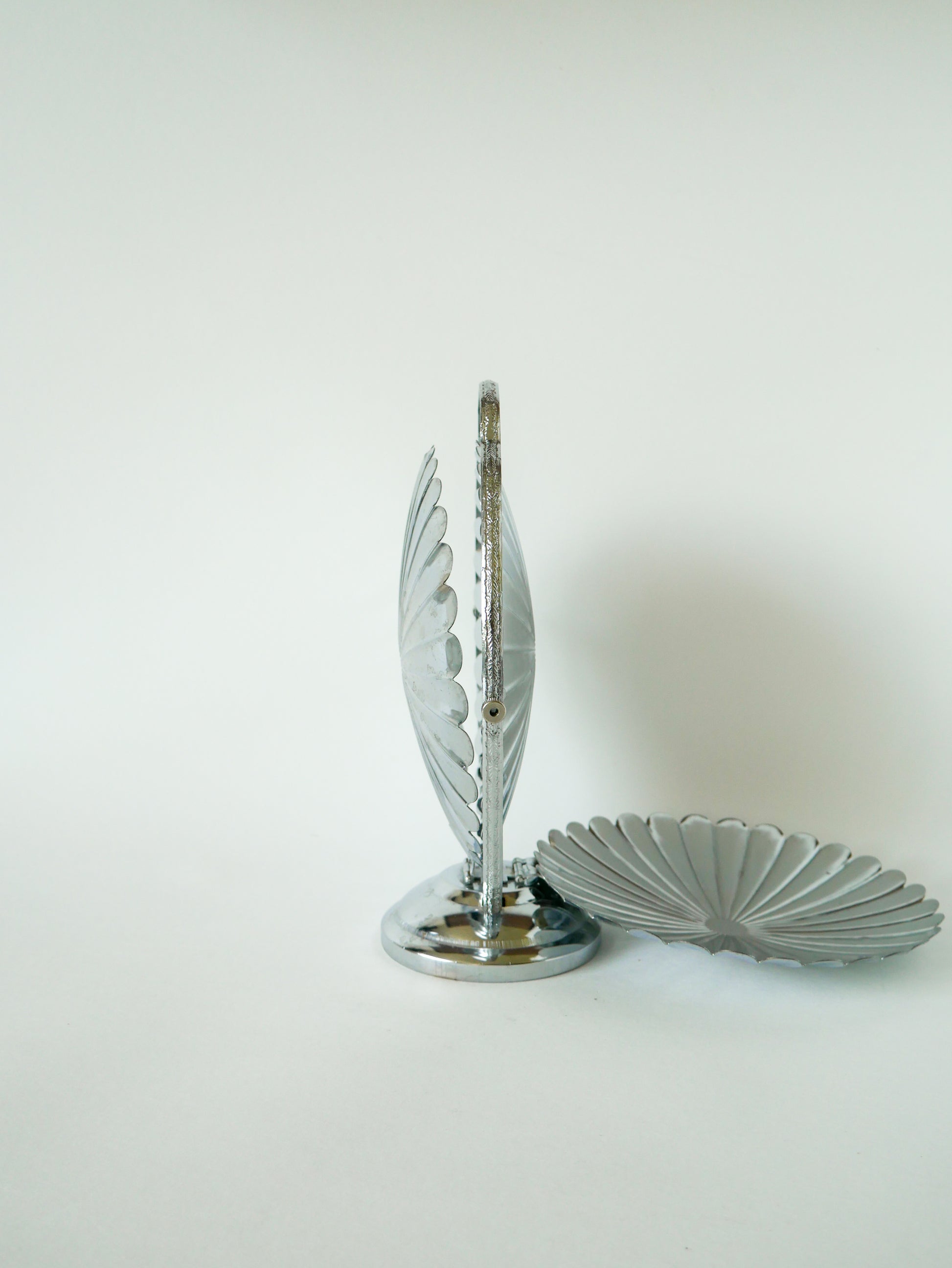 Superbe grand plat / présentoir pliant en inox avec trois plateaux en forme de fleurs, 1970. En très bon état, de rares traces du temps. Envoi rapide et soigné. Possibilité d'envois groupés - plus économique et plus écologique ! Dimensions : 44 X 27 X 23 cm.