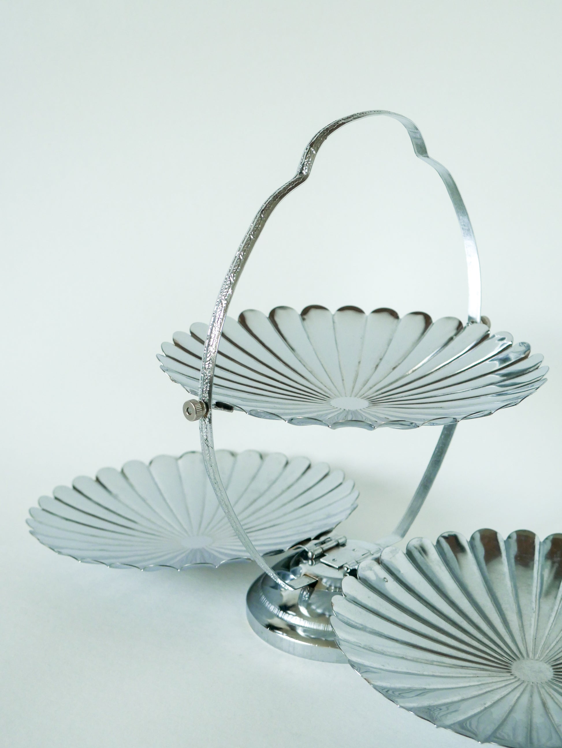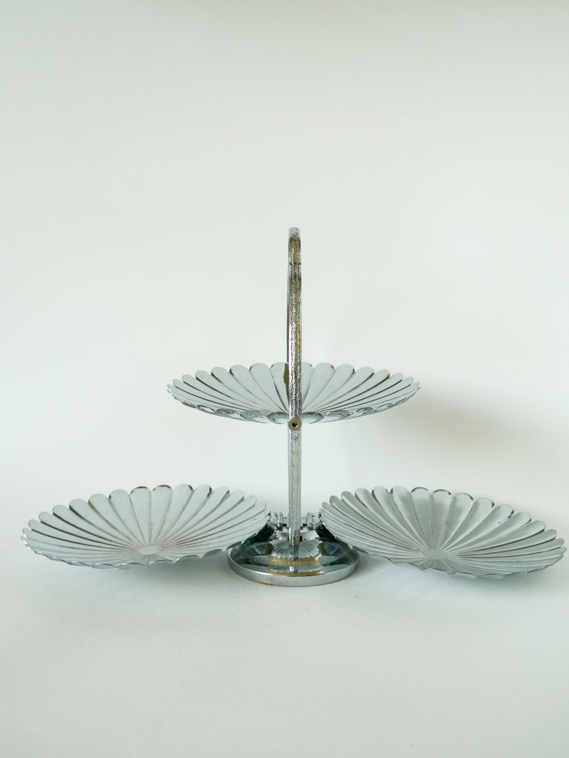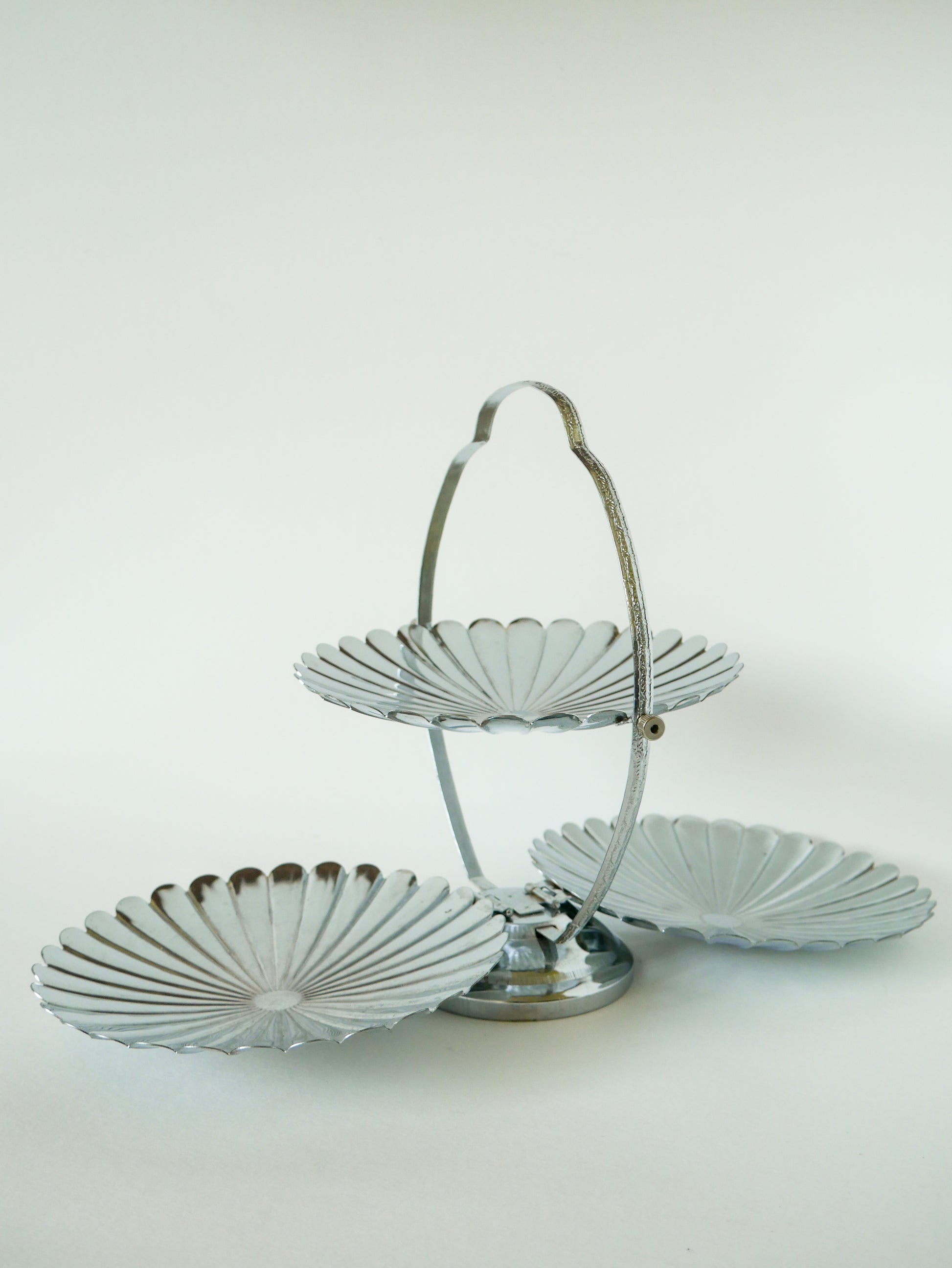 Grand plat / présentoir pliant en inox avec trois plateaux en forme de fleurs, 1970