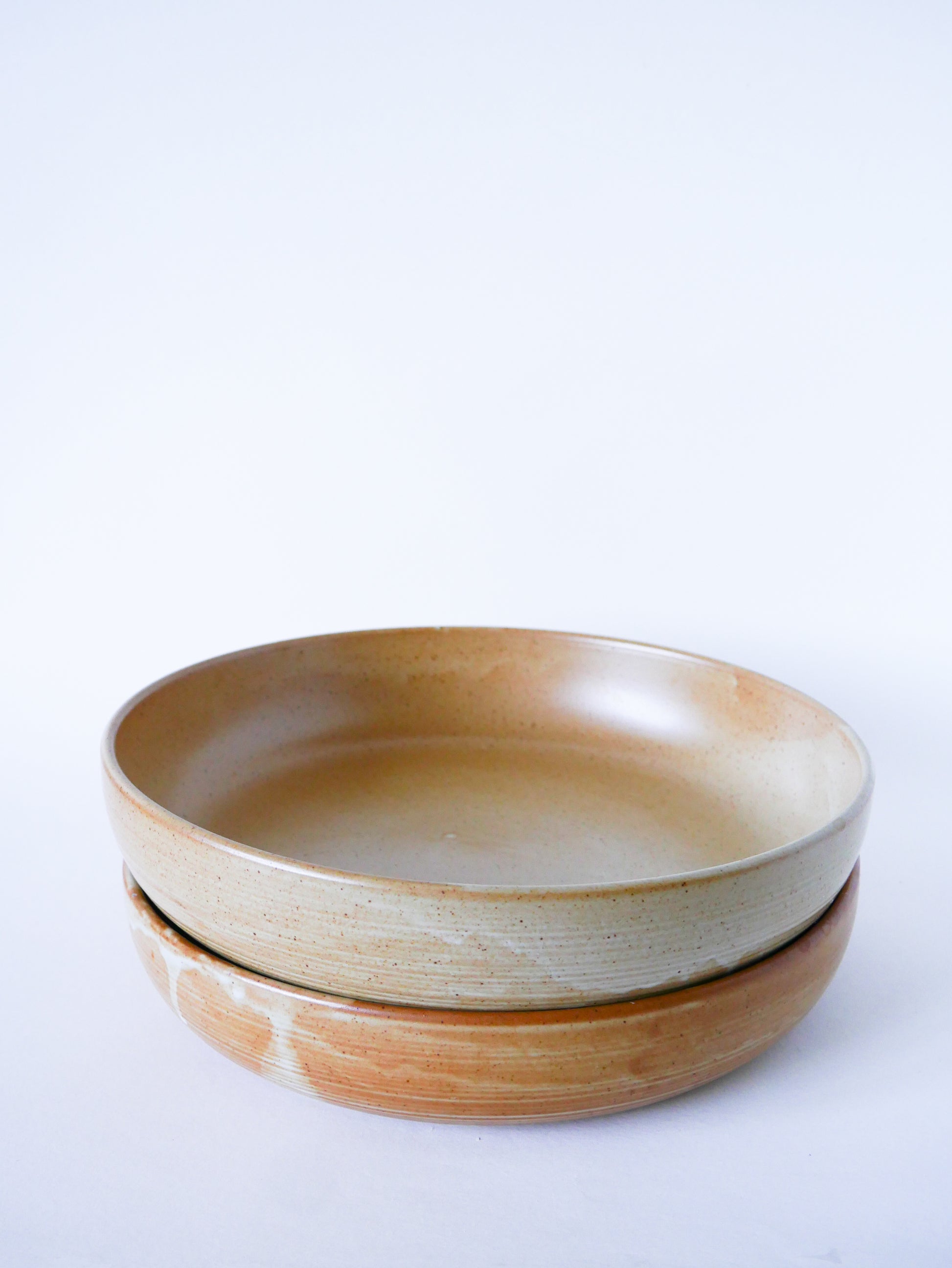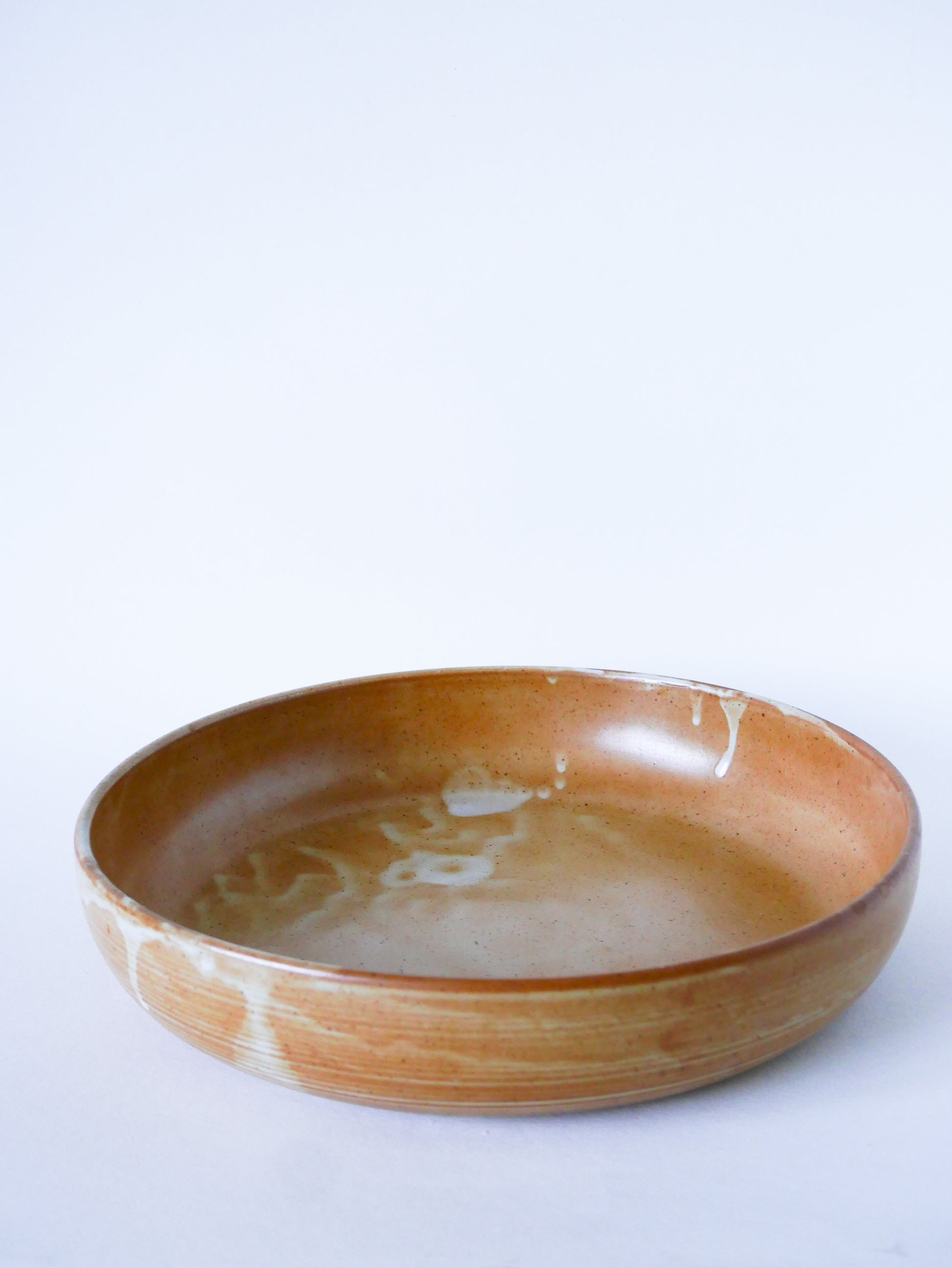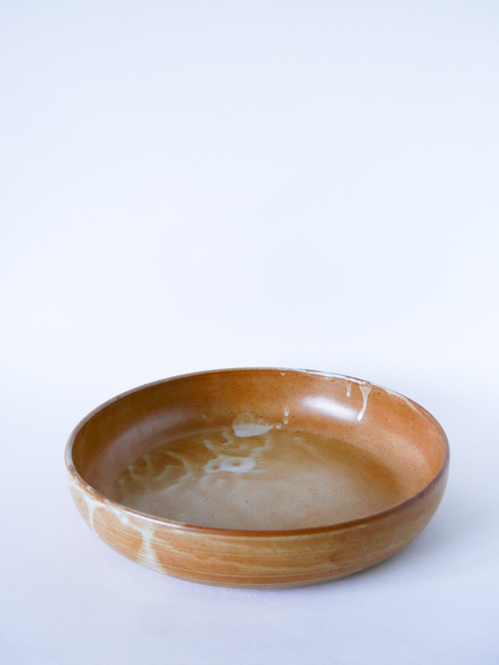 Joli grand plat rond creux en grès, 1970. En très bon état, de rares traces du temps. 2 lots disponibles. Envoi rapide et soigné. Possibilité d'envois groupés - plus économique et plus écologique ! Dimensions : 31 X 7 cm.