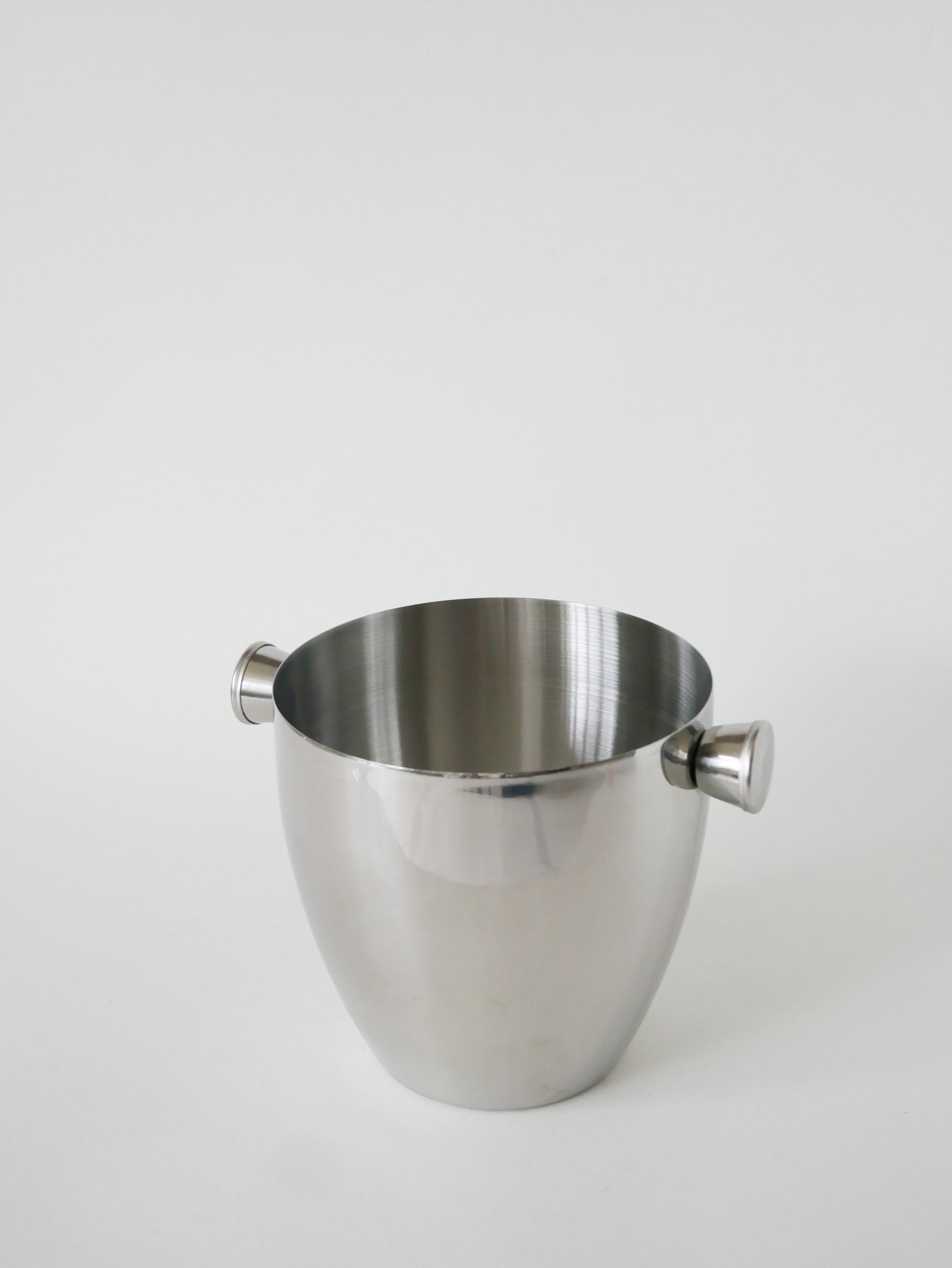 Joli grand seau à glace en inox et poignée en bois, 1970. En très bon état, de rares traces du temps. Envoi rapide et soigné. Possibilité d'envois groupés - plus économique et plus écologique ! Dimensions : 18 X 19 cm.