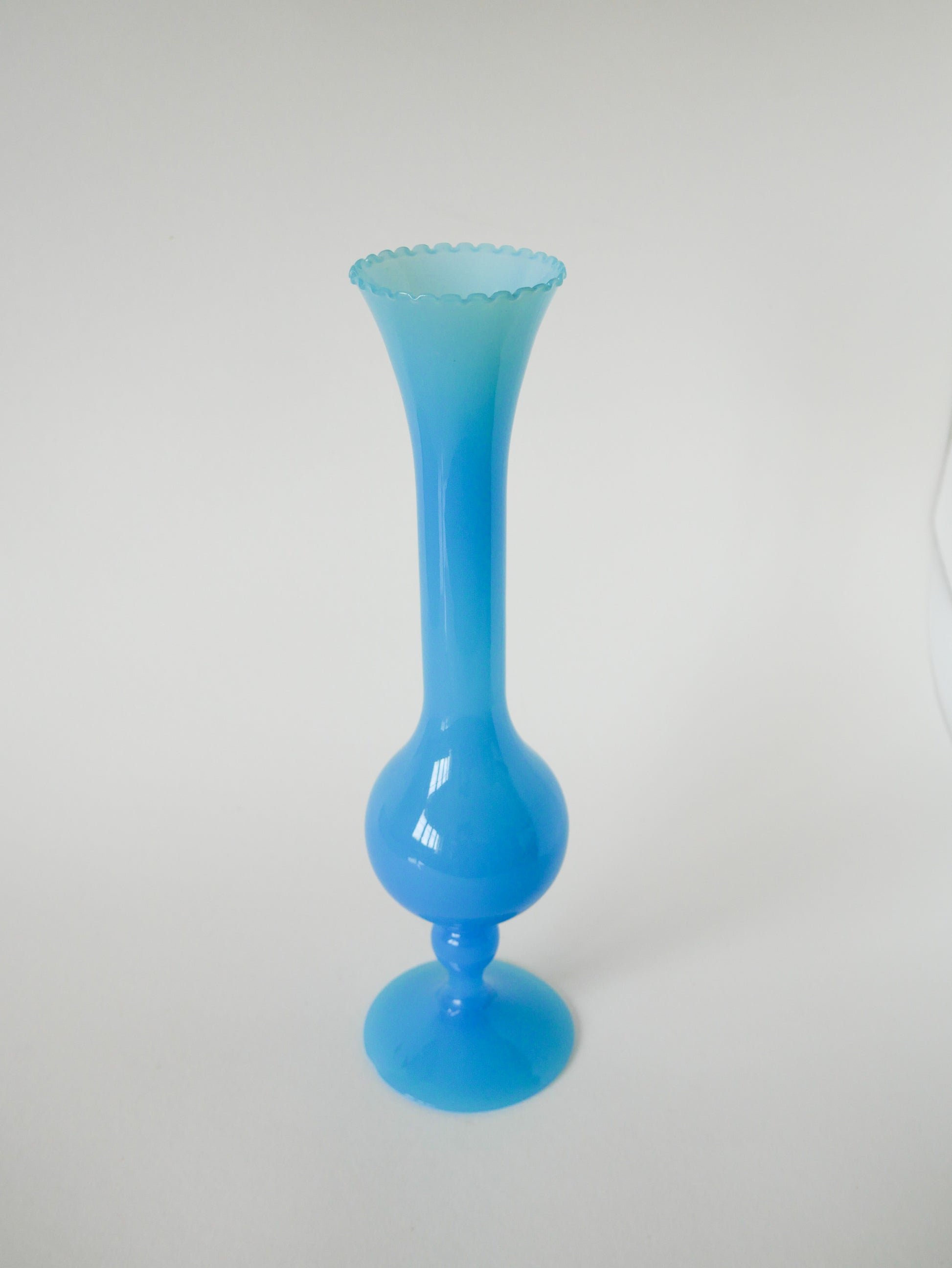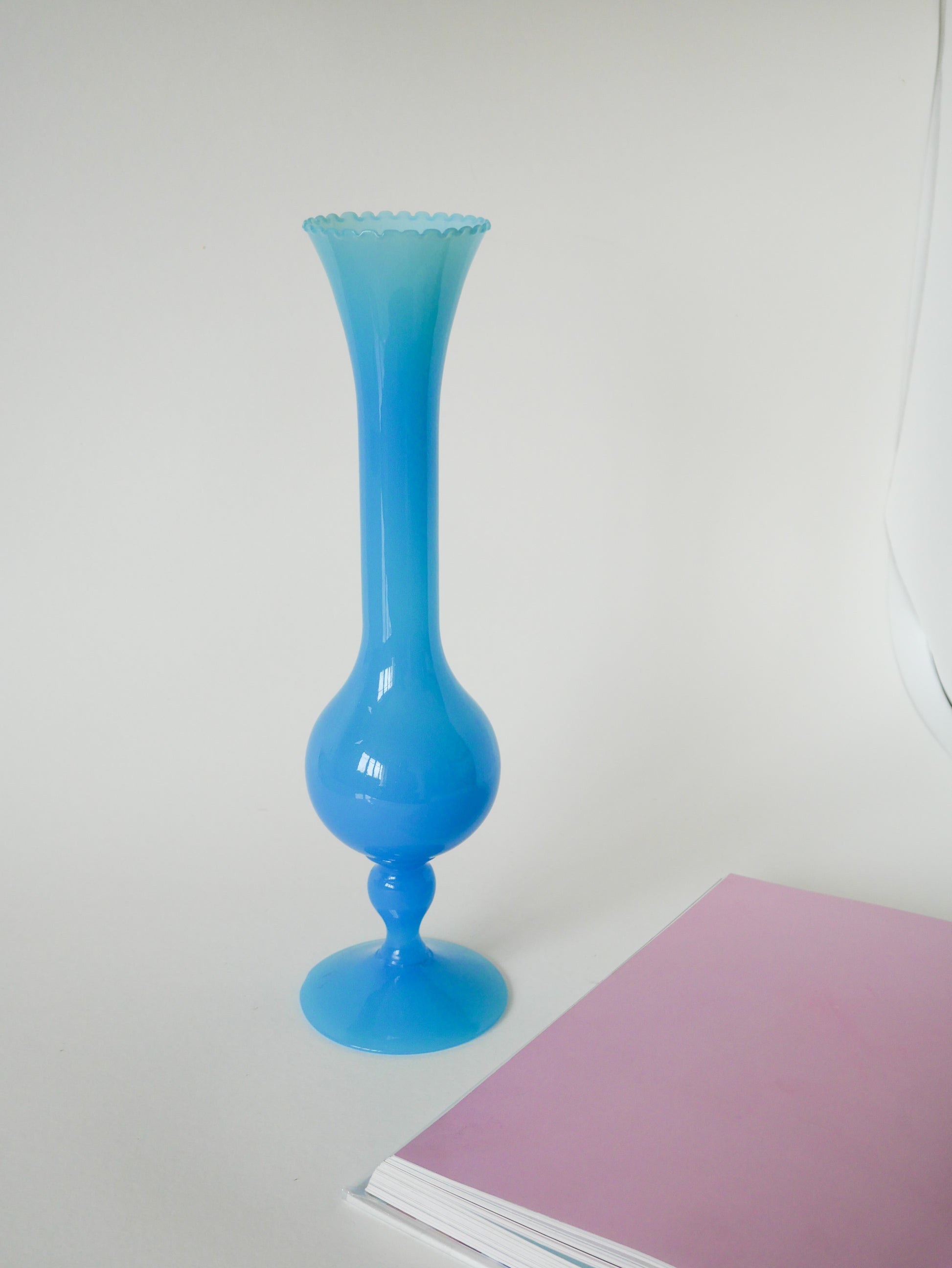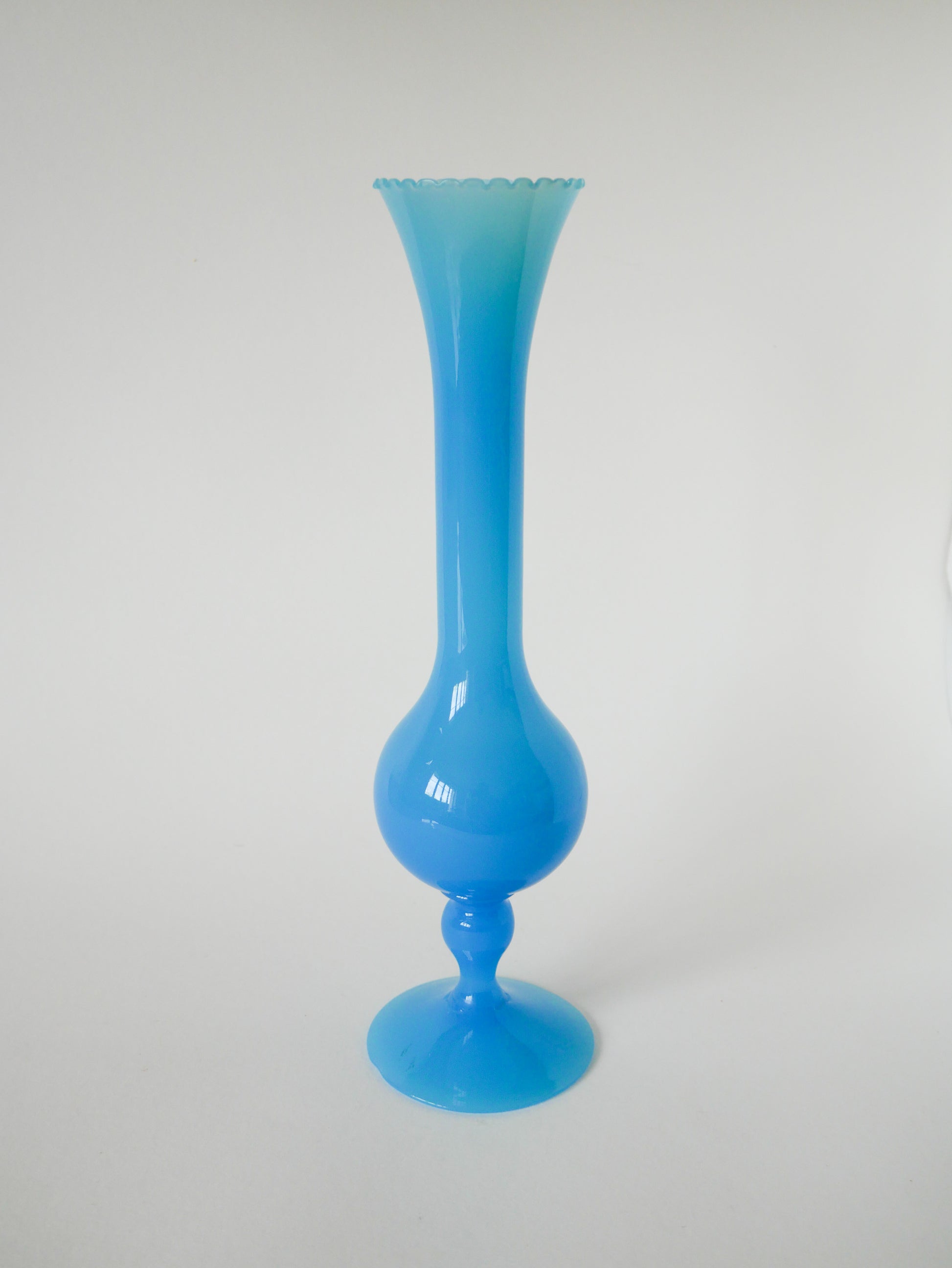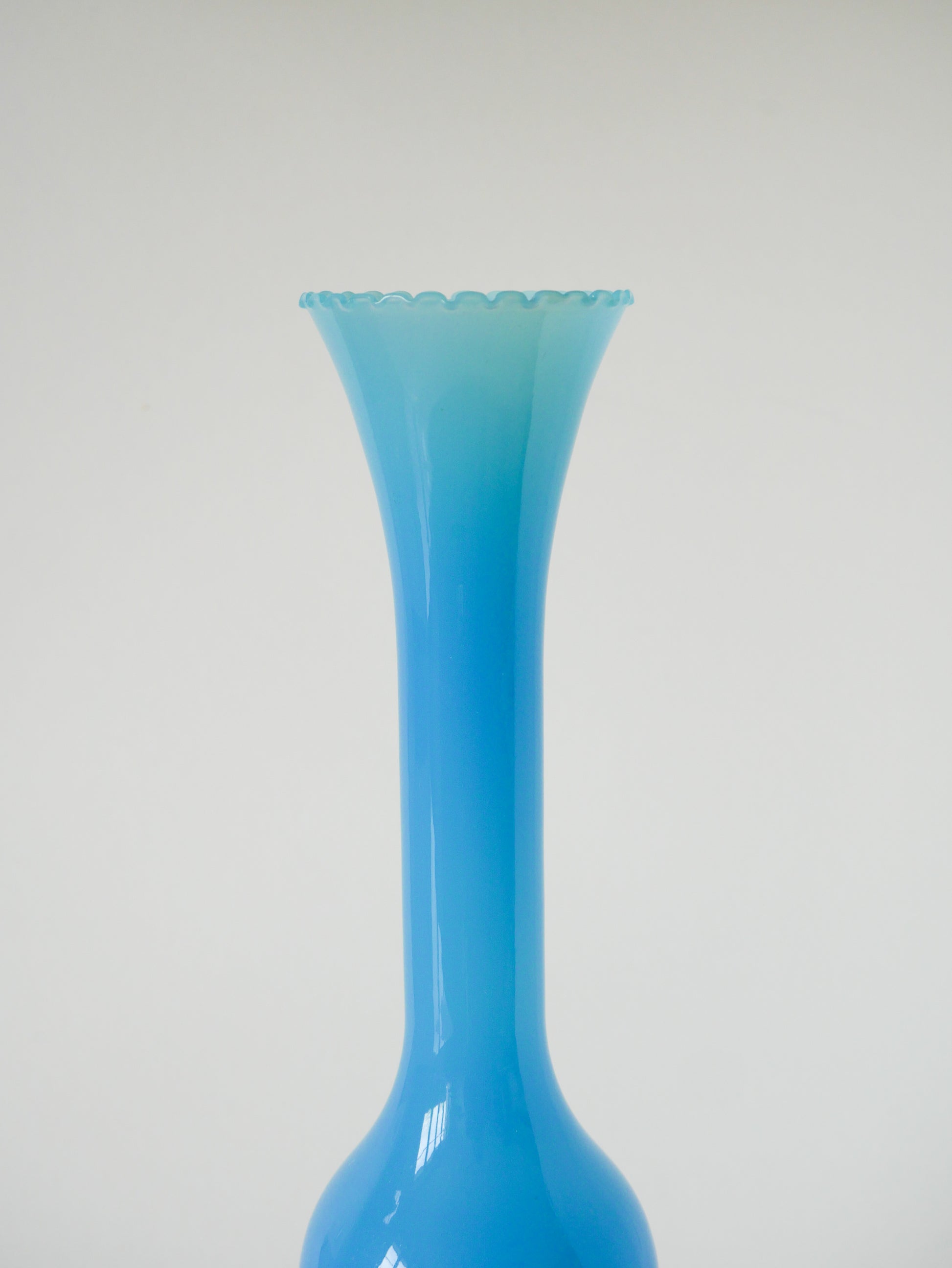 Superbe grand vase en opaline bleu dentelé, 1970. En excellent état. Envoi rapide et soigné. Possibilité d'envois groupés - plus économique et plus écologique ! Dimensions : 35 X 9.5 cm.