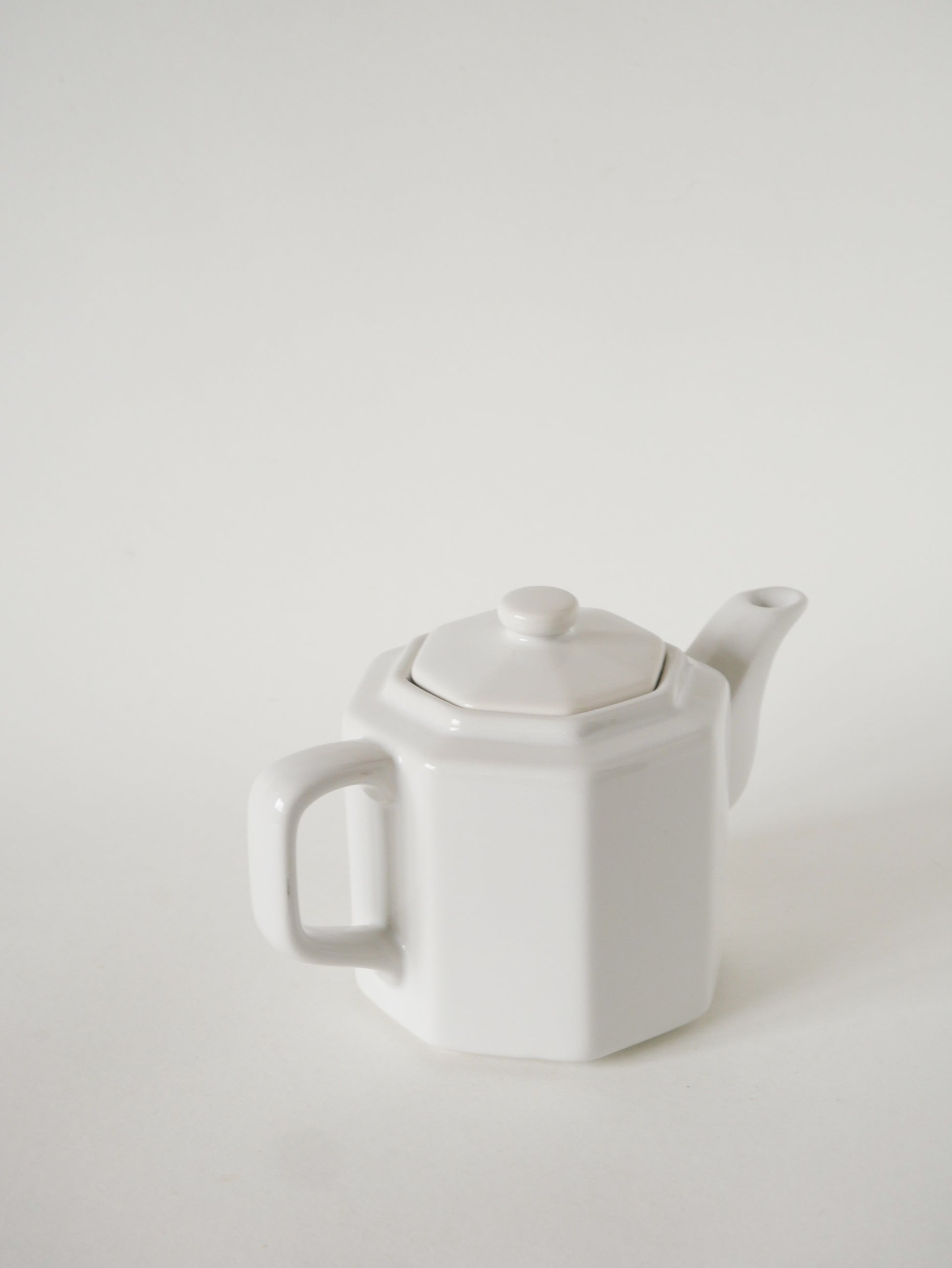 Jolie grande théière en céramique facettée, Blanc, 1950. En très bon état, de rares traces du temps. Envoi rapide et soigné. Possibilité d'envois groupés - plus économique et plus écologique ! Dimensions : 15 X 22 X 15 cm.