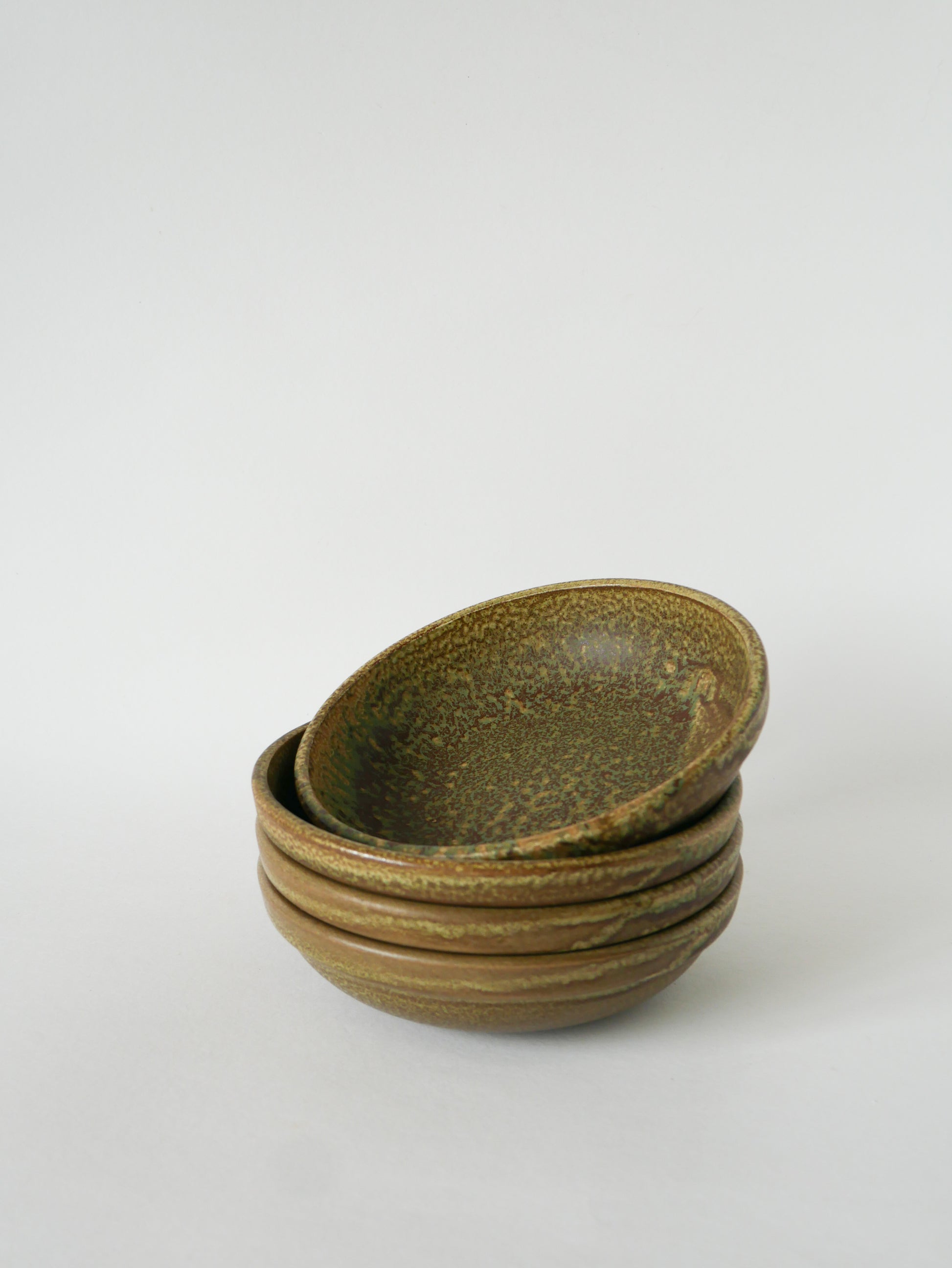 Lot de 4 assiettes creuses en grès moucheté, Marron & Vert, Fabrication Artisanale, 1970
