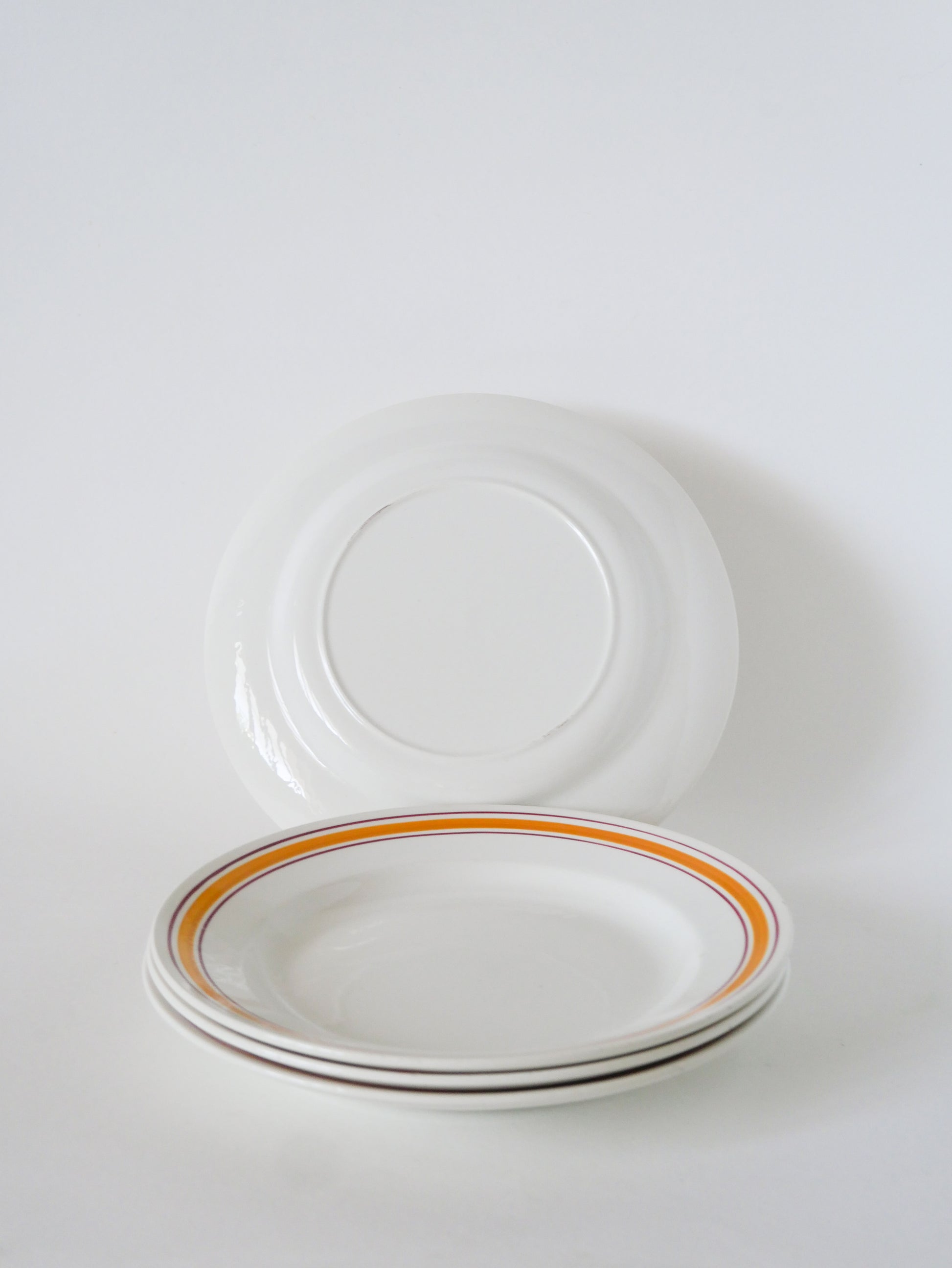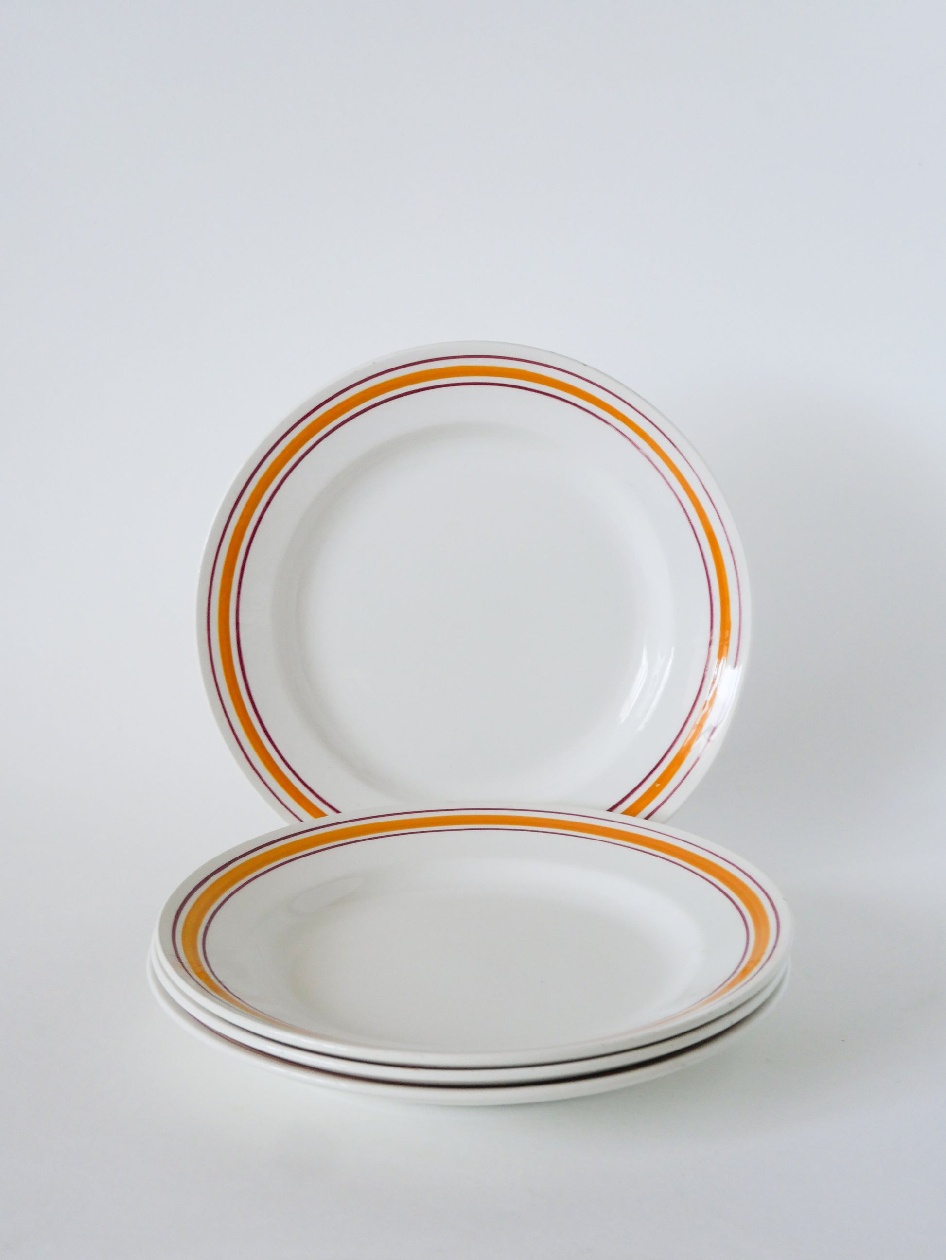 Lot de 4 assiettes plates, Liserés Jaune et Bordeaux, 1960