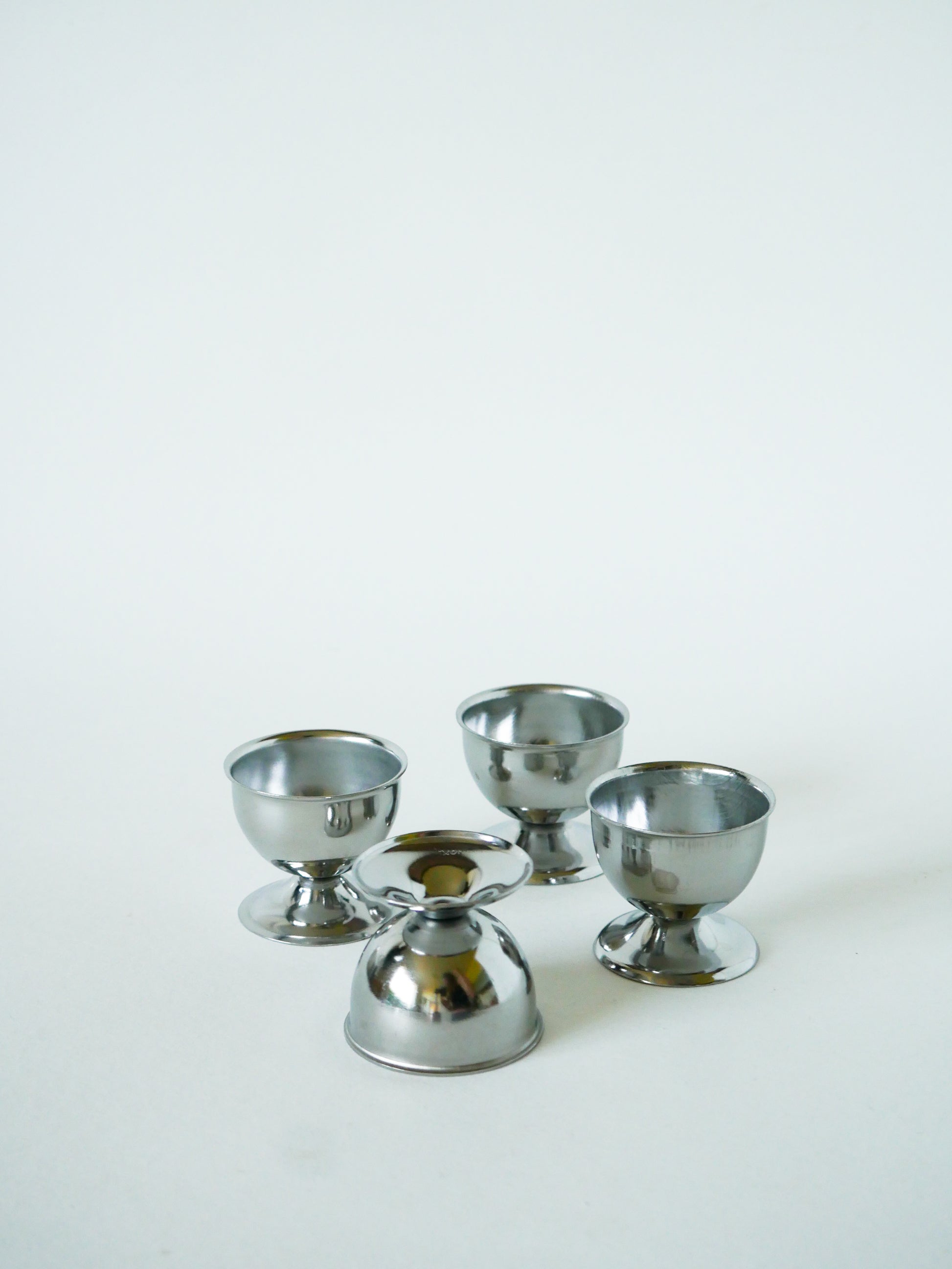 Joli lot de 4 coquetiers en inox, Design, 1970. En très bon état, de rares traces du temps. 3 lots disponibles. Envoi rapide et soigné. Possibilité d'envois groupés - plus économique et plus écologique ! Dimensions : 4.5 X 4 cm.