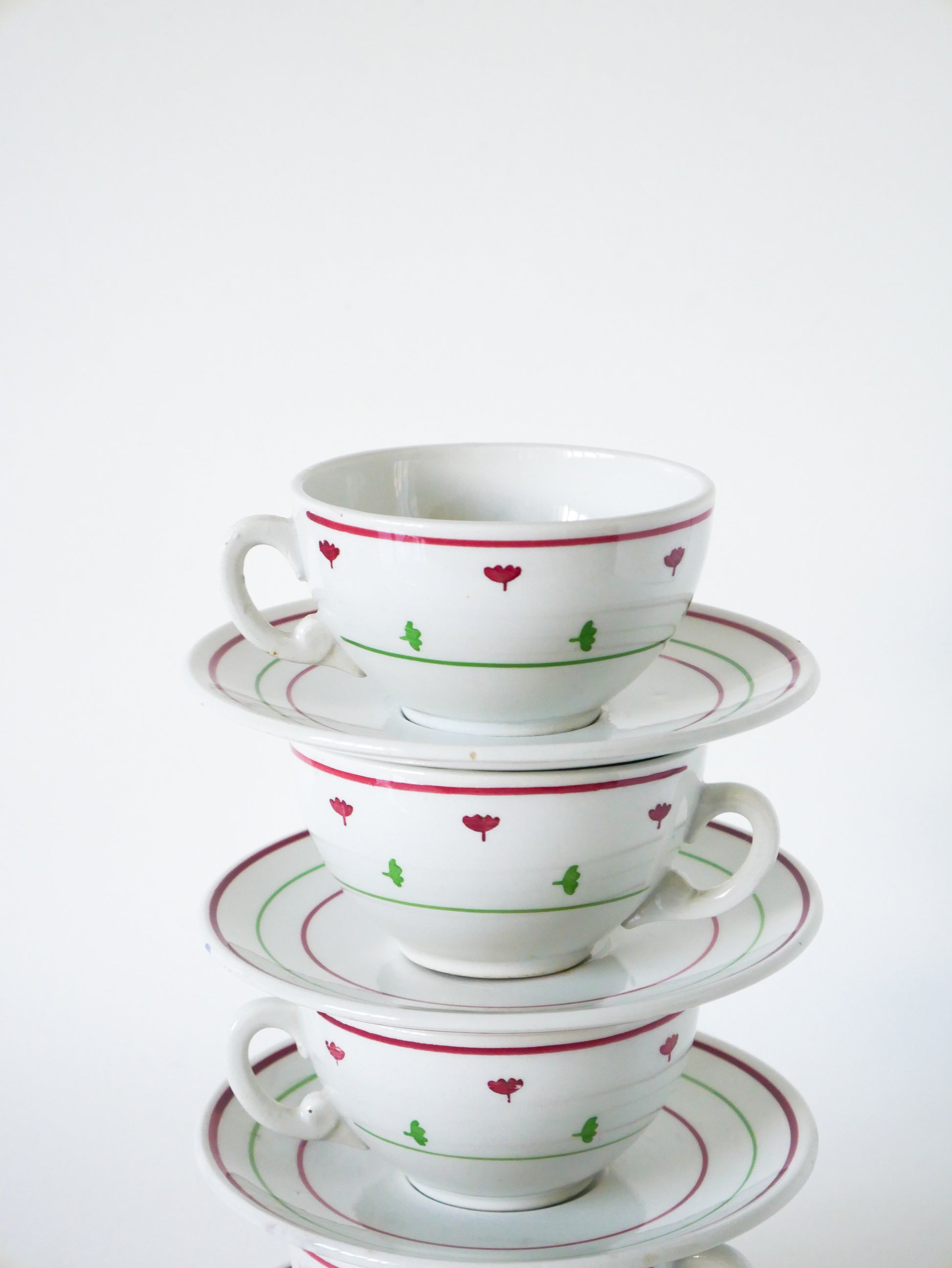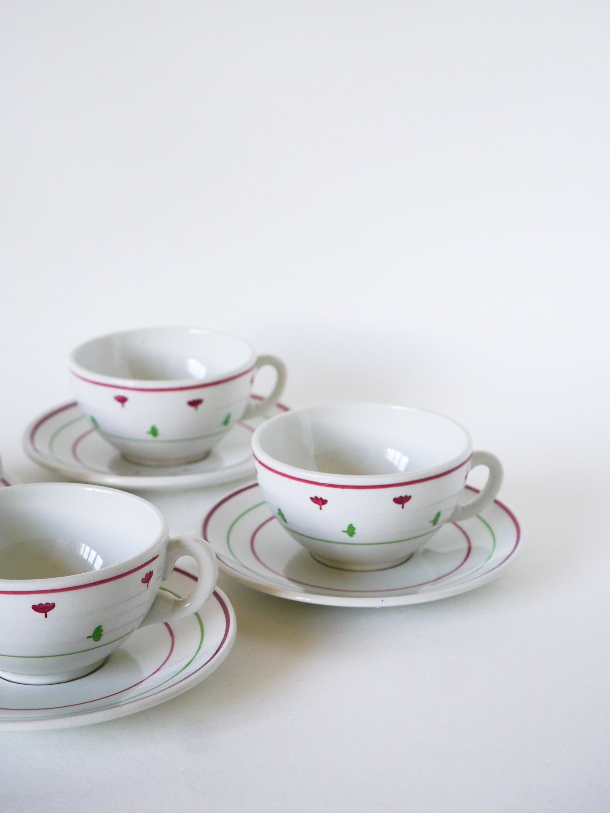 Joli lot de 4 tasses à café Luneville, Rose & Vert, 1950. En très bon état, de rares traces du temps. Envoi rapide et soigné. Possibilité d'envois groupés - plus économique et plus écologique ! Dimensions : 8.5 X 5 cm ; soucoupes : 13 cm.