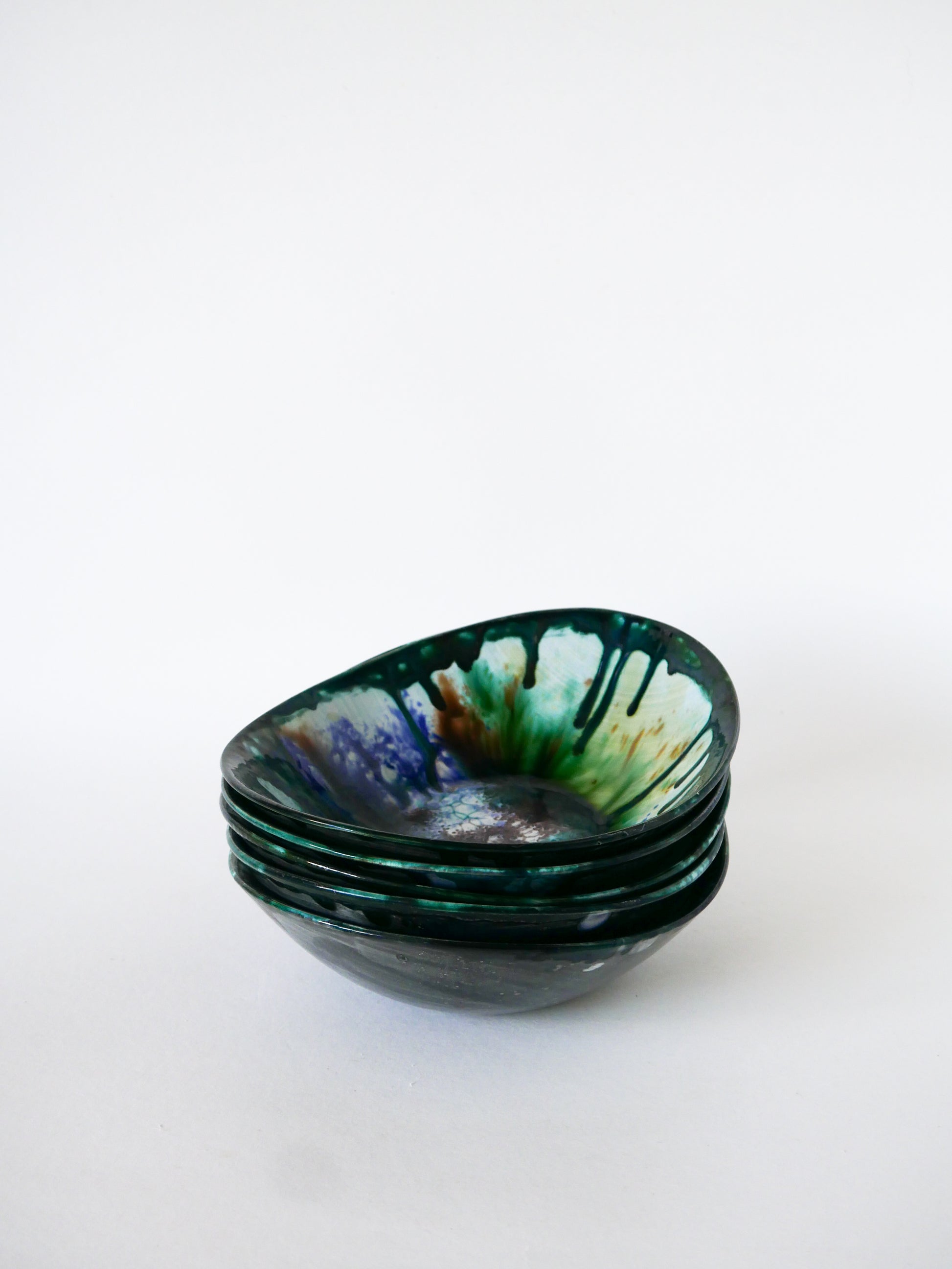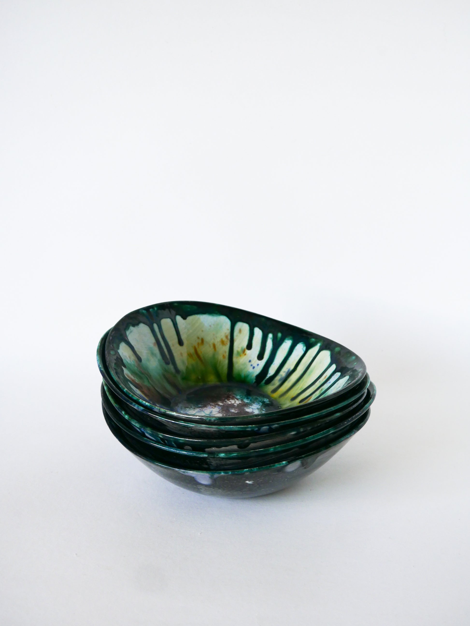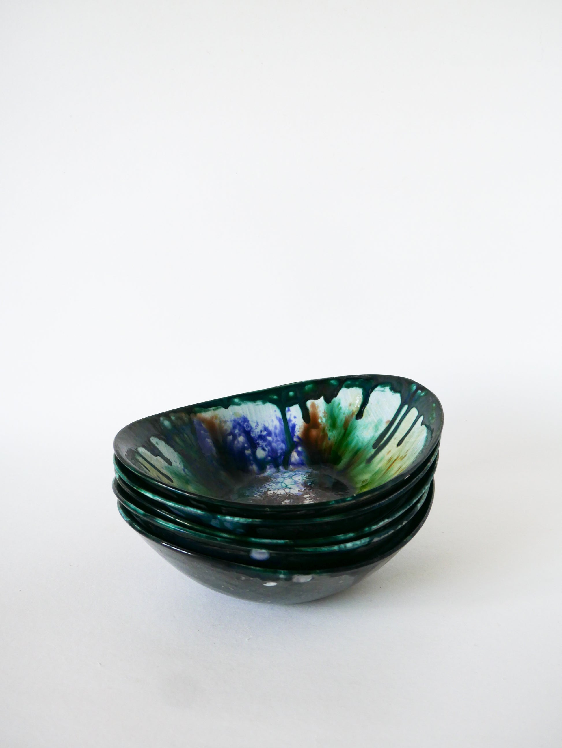 Joli lot de 5 assiettes creuses ovoïdes en céramique du Morvan, 1970. En très bon état, de rares traces du temps. 2 lots disponibles. Envoi rapide et soigné. Possibilité d'envois groupés - plus économique et plus écologique ! Dimensions : 20 X 17 X 6 cm.