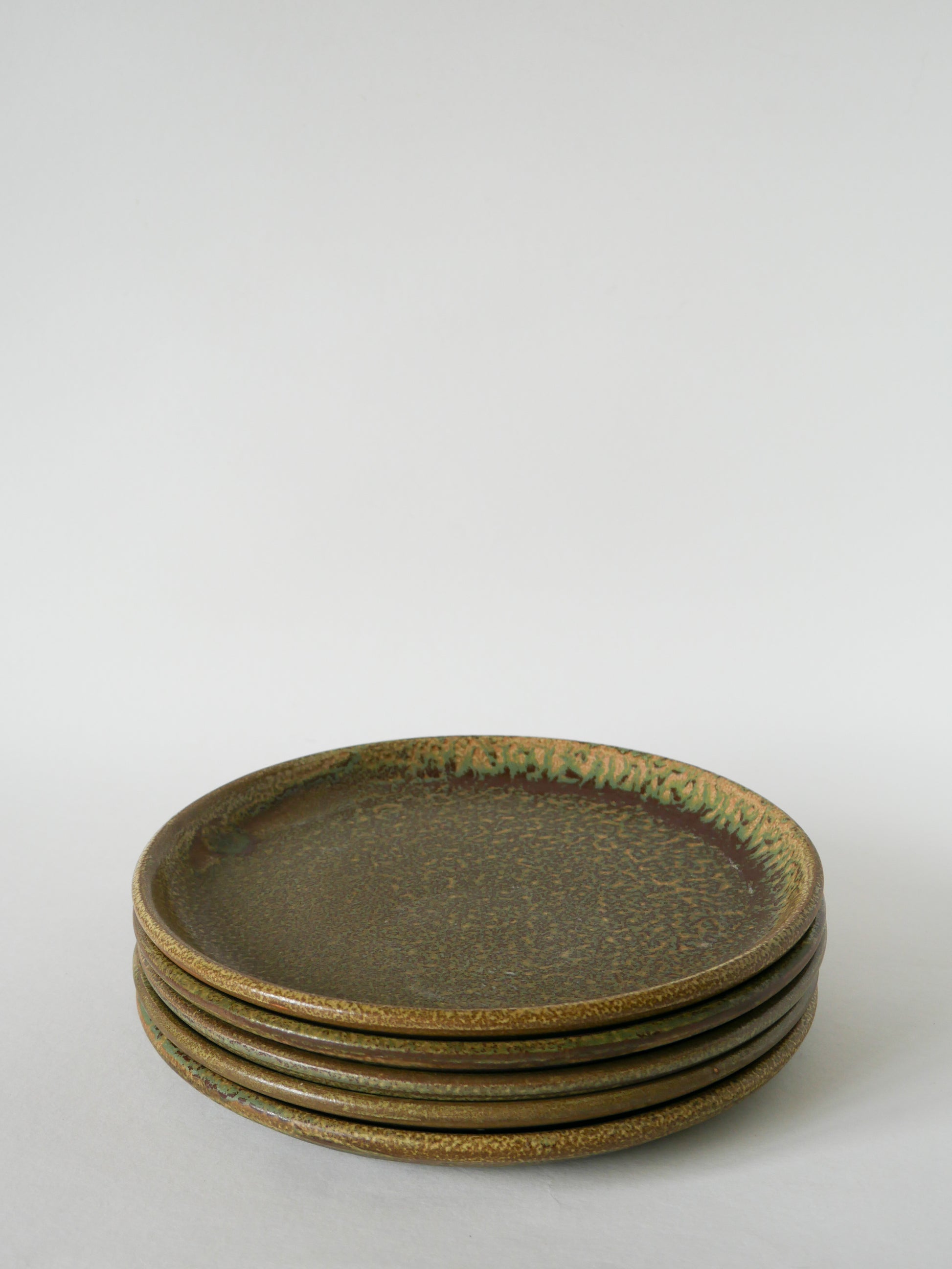 Lot de 5 assiettes plates en grès moucheté, Marron & Vert, Fabrication Artisanale, 1970