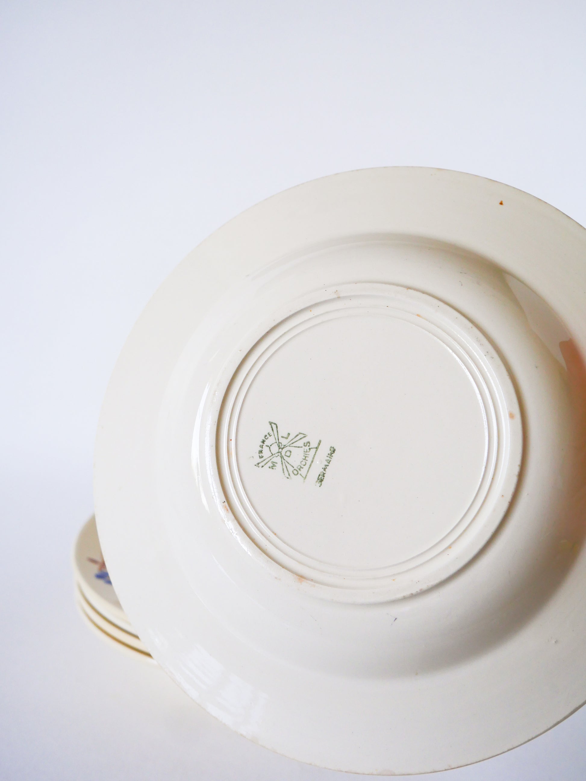 Lot de 5 assiettes plates, Moulin des Loups, Rose, Bleu & Marron, 1950