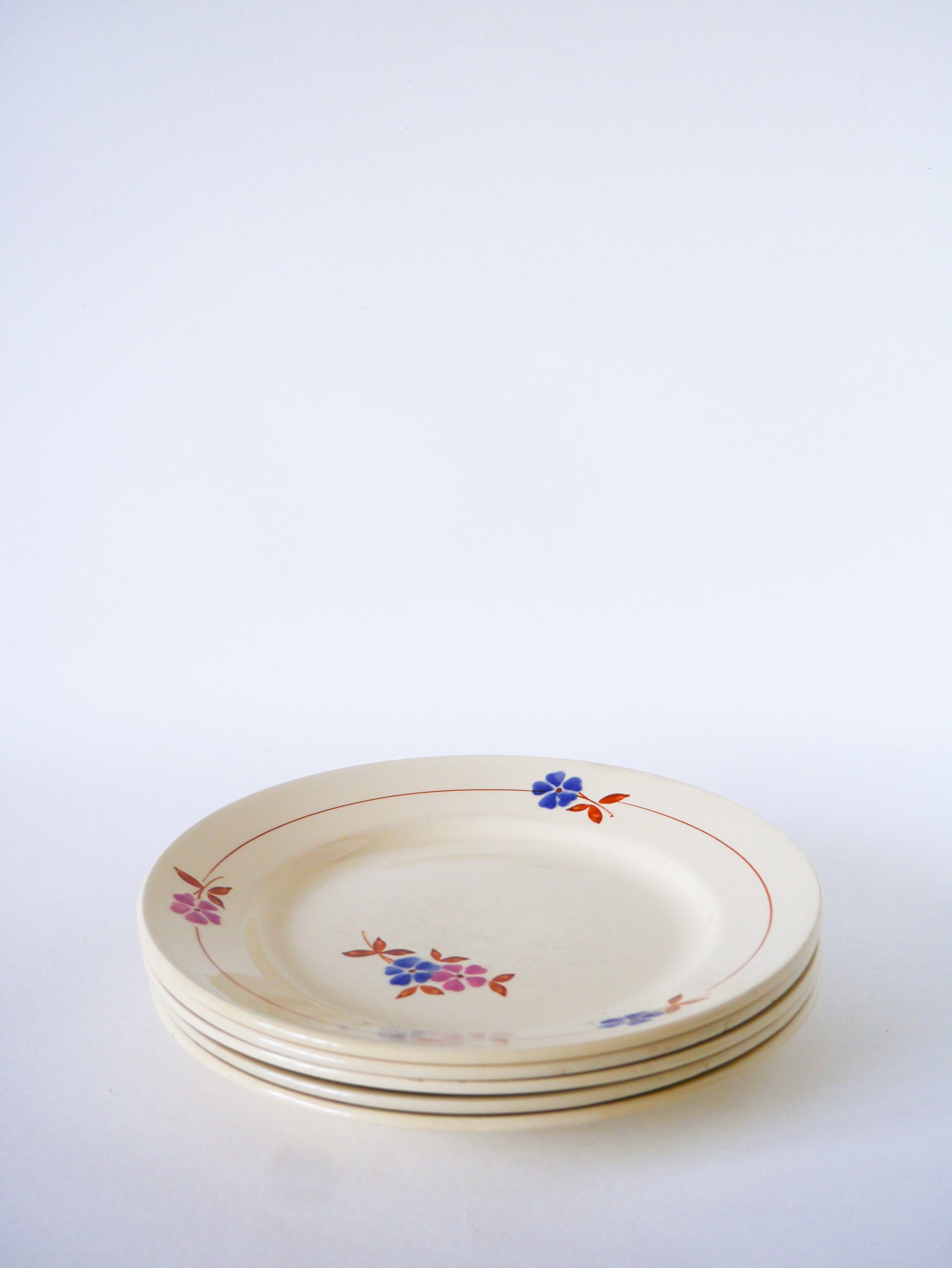 Joli lot de 5 assiettes plates, Moulin des Loups, Rose, Bleu & Marron, 1950. En très bon état, de rares traces du temps. Envoi rapide et soigné. Possibilité d'envois groupés - plus économique et plus écologique ! Dimensions : 22.5 cm.