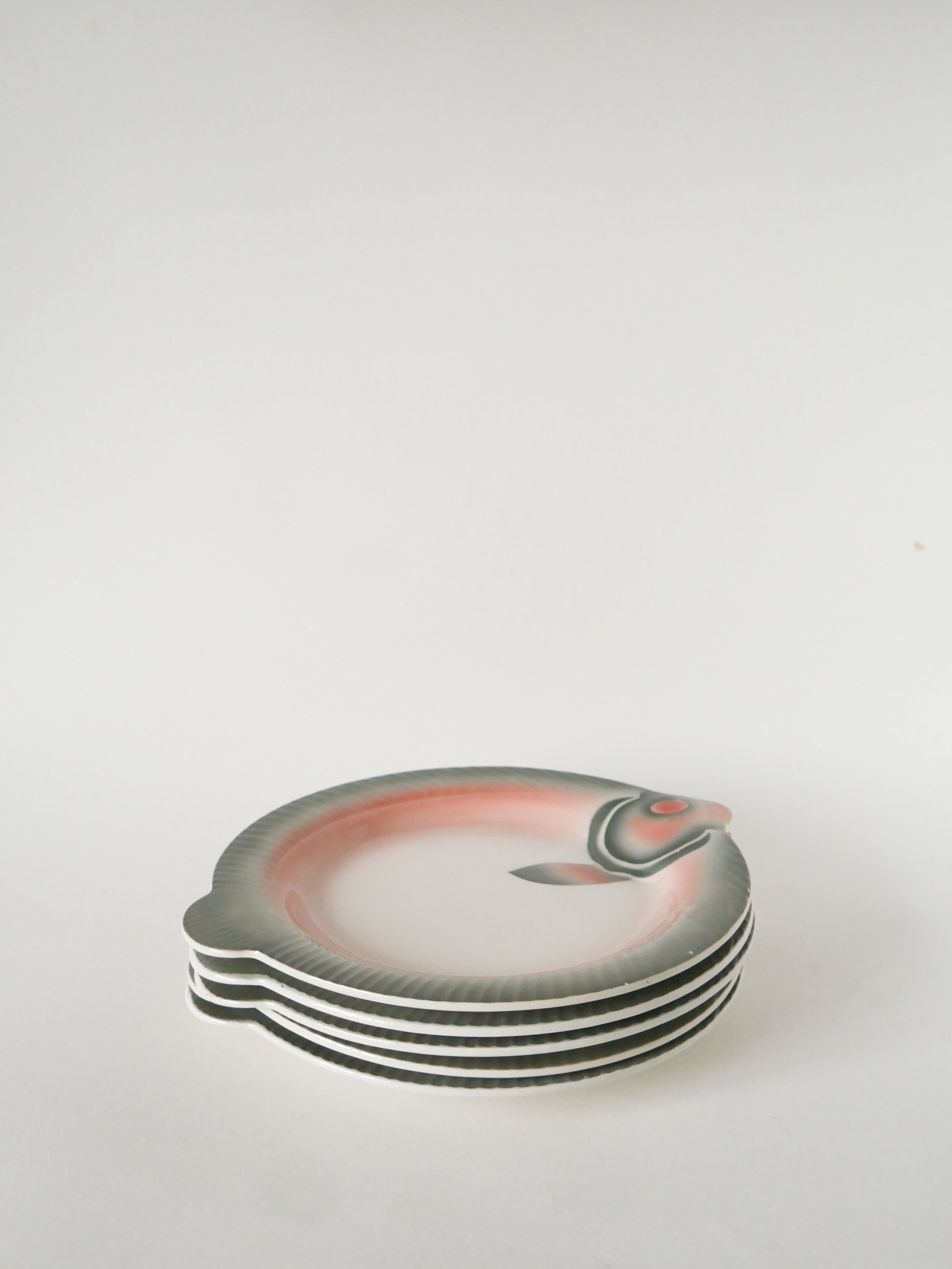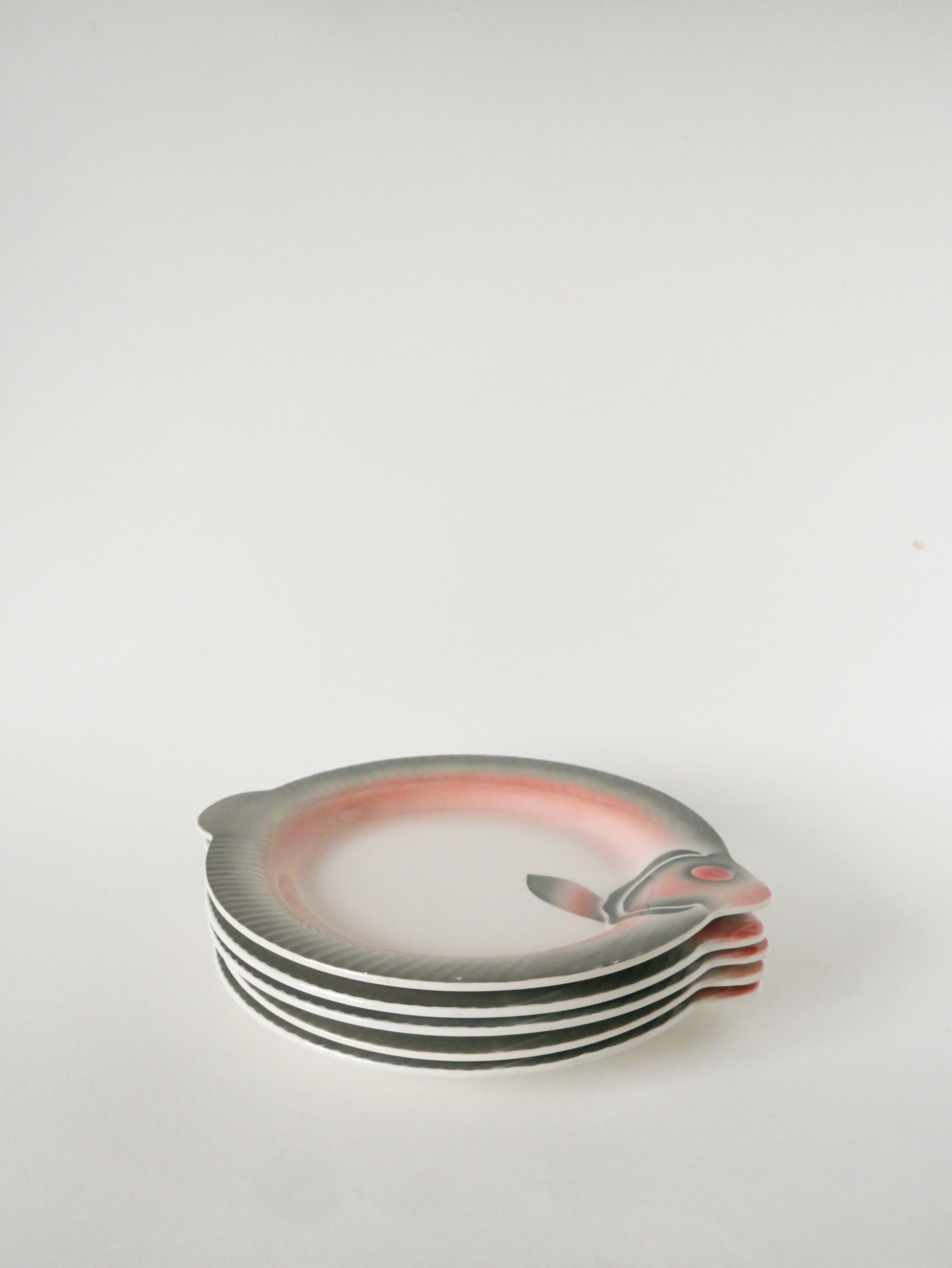 Lot de 6 assiettes plates en barbotine, forme Poisson, Rose et Gris, 1960
