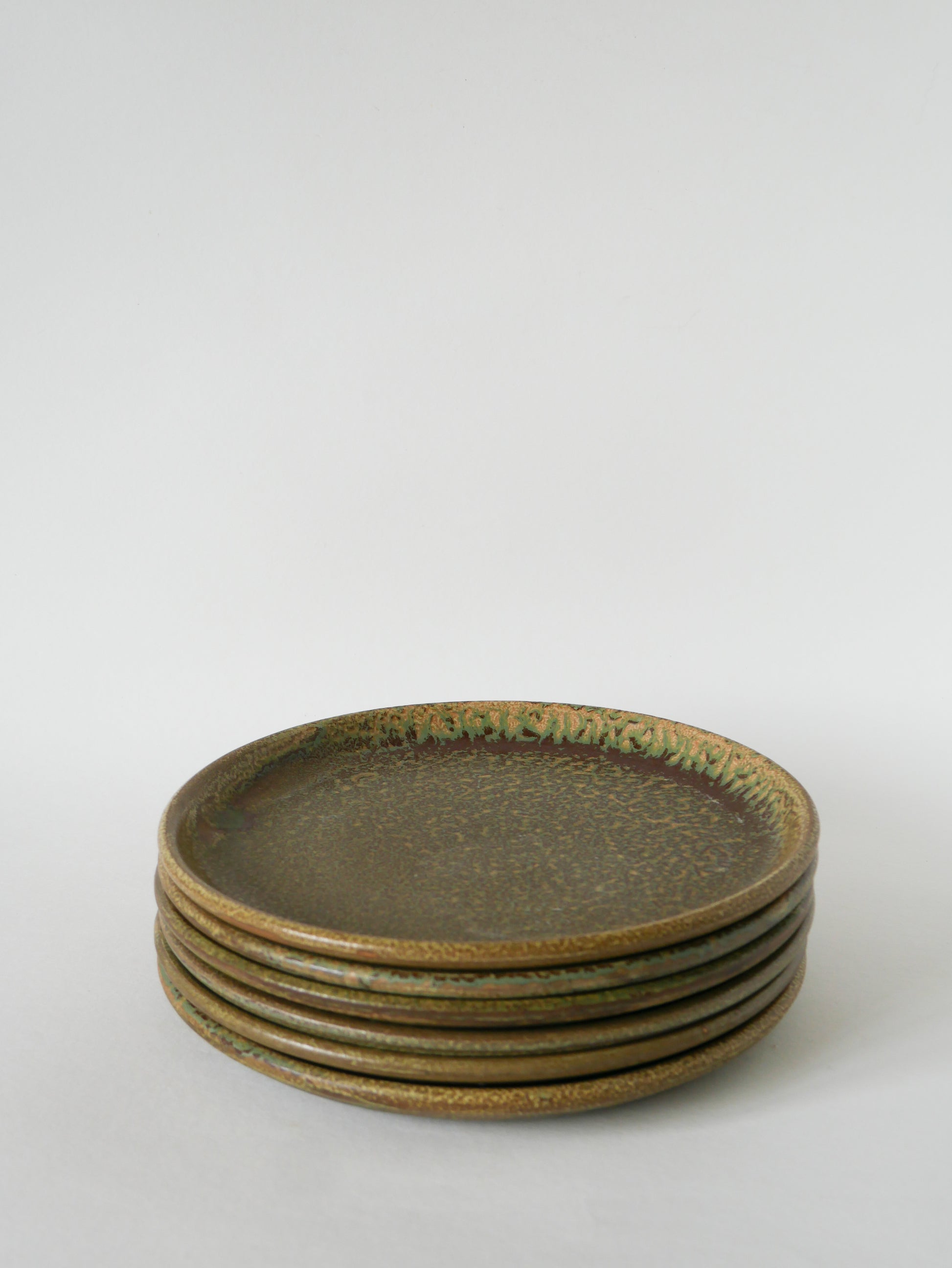 Lot de 6 assiettes plates en grès moucheté, Marron & Vert, Fabrication Artisanale, 1970