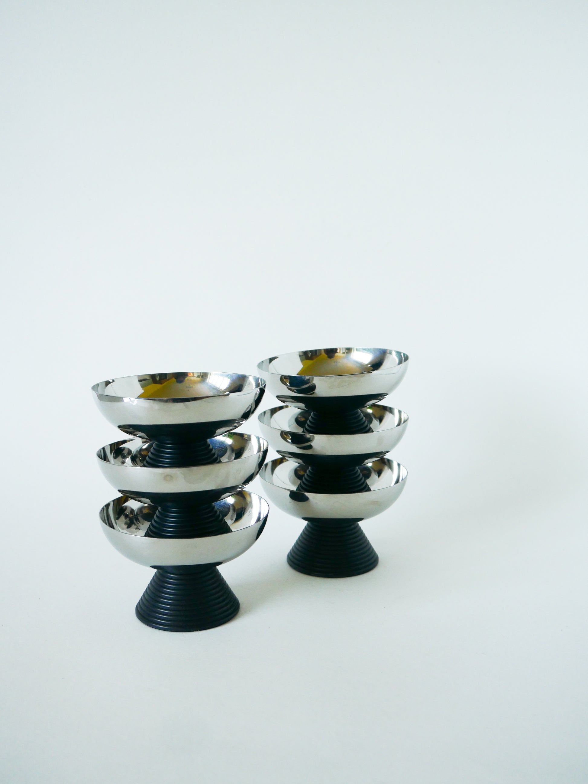 Lot de 6 coupes à glace en inox, pieds large, plastique Noir, Design, 1970 - 7 X 10 cm