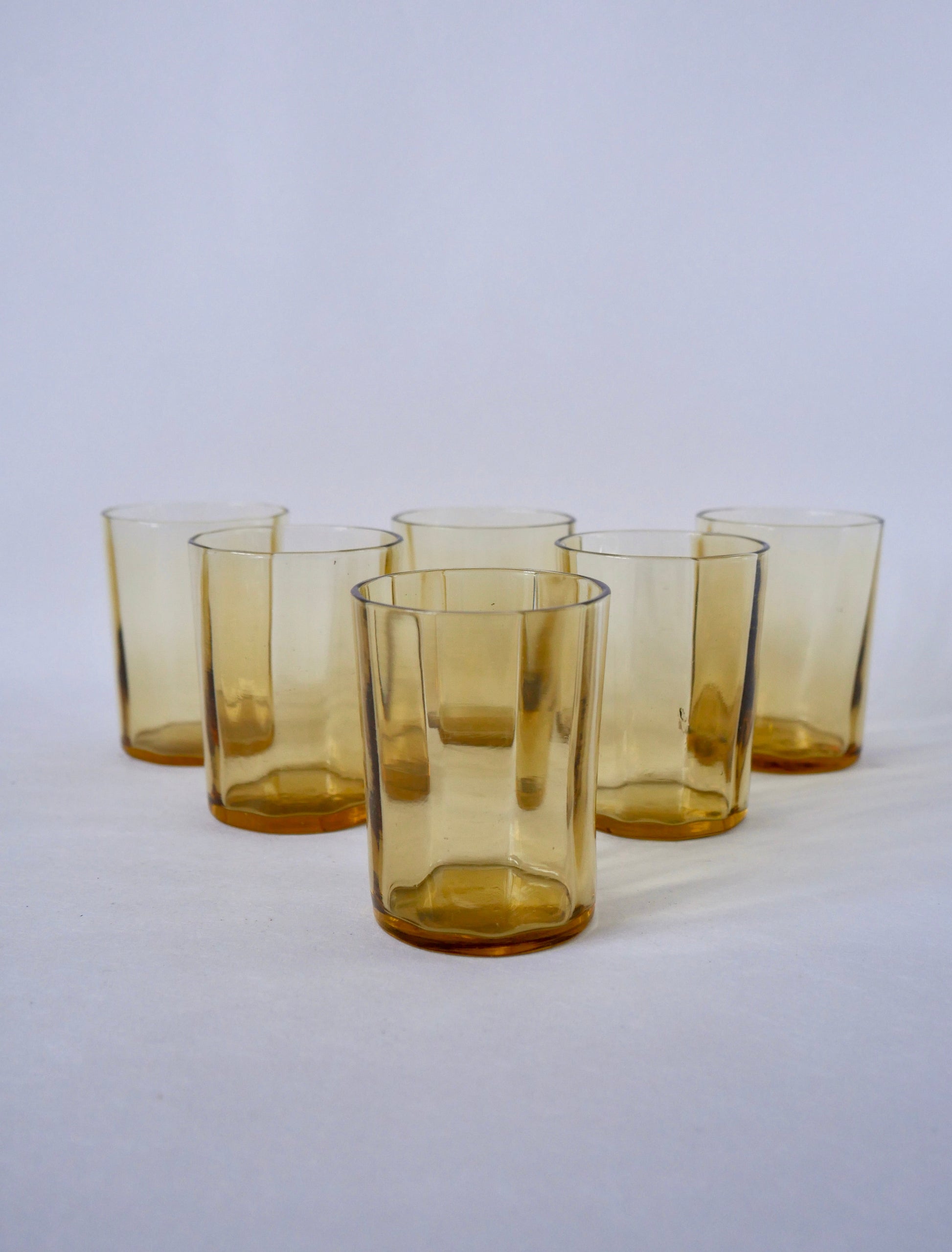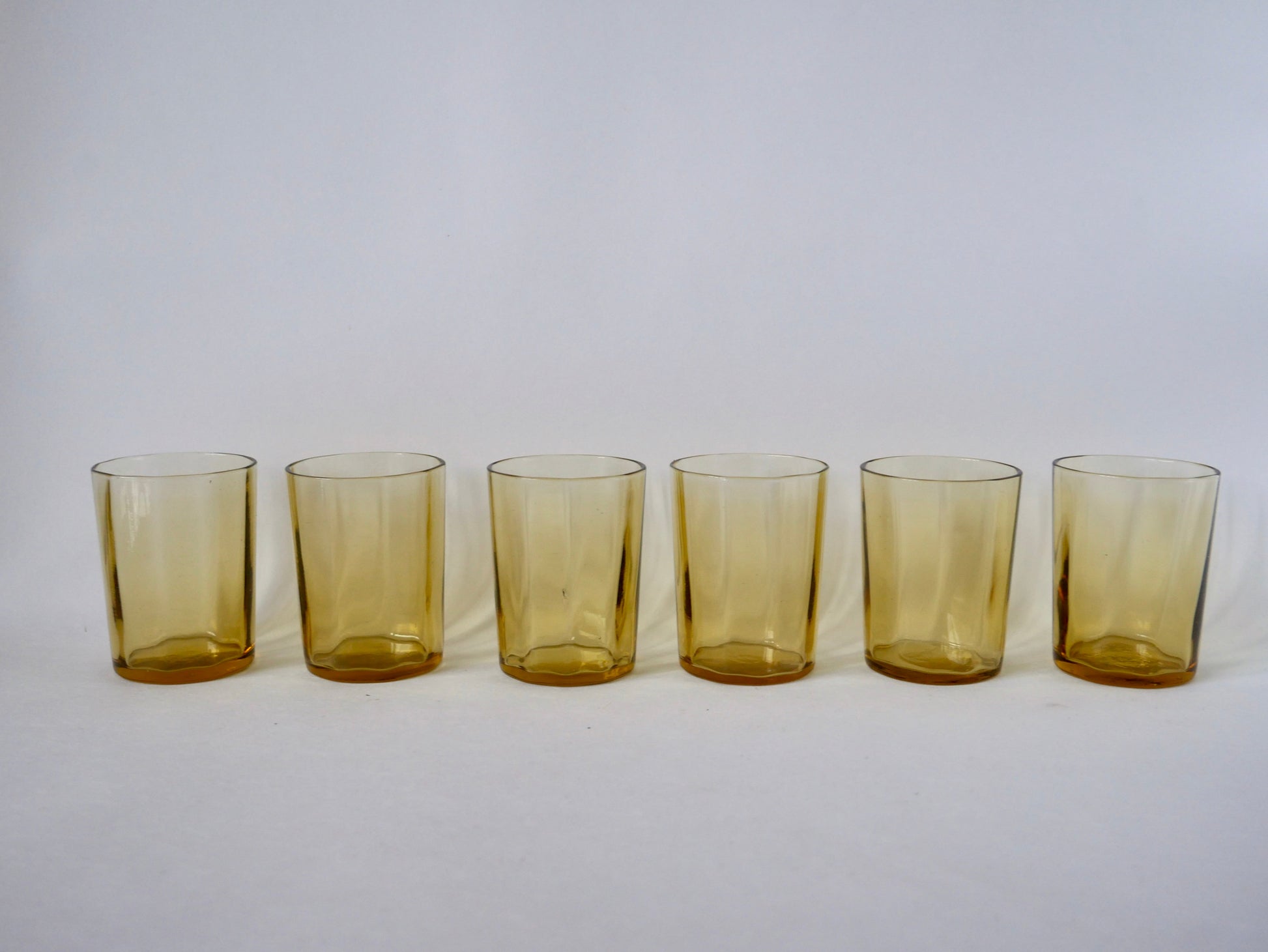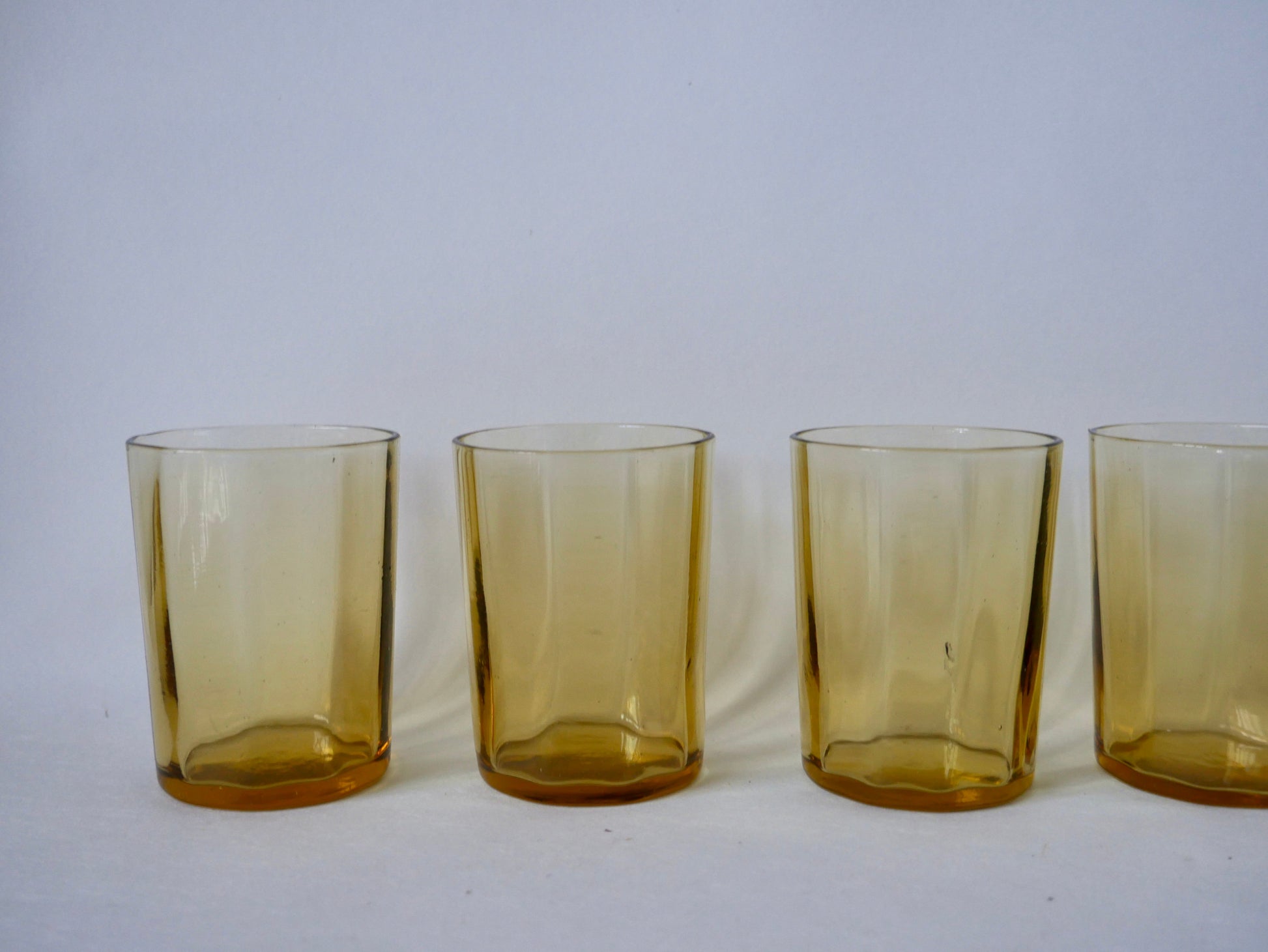 Superbe lot de 6 verres à eau en verre jaune années 40-50. En excellent état. Dimensions : 7 X 5.5 cm.
