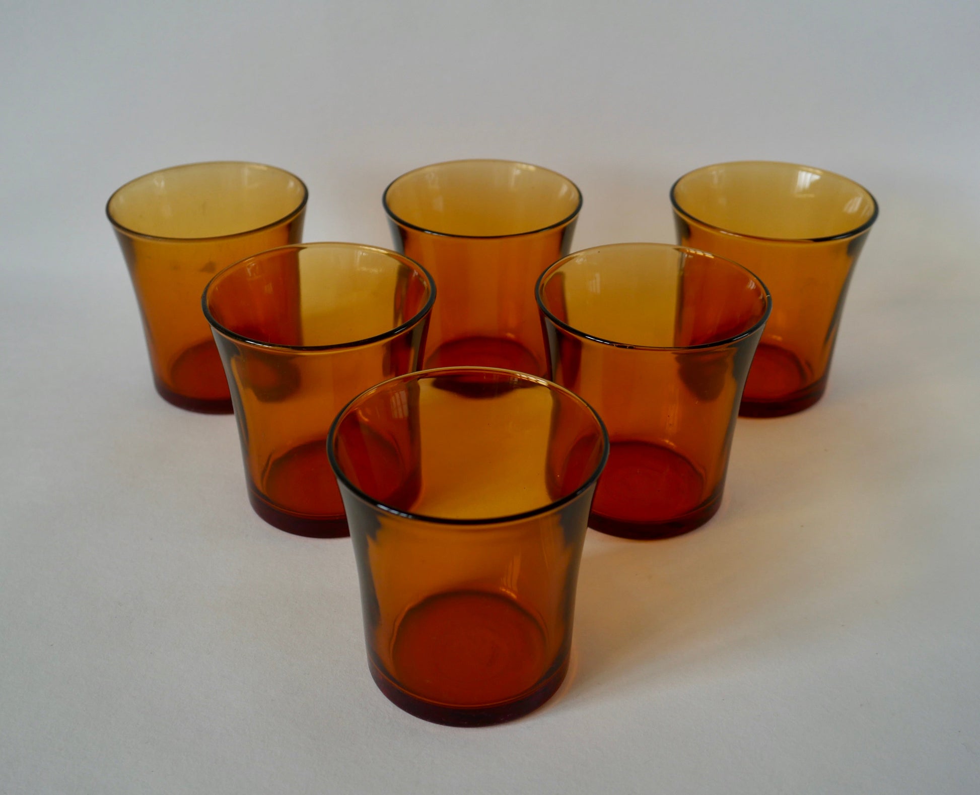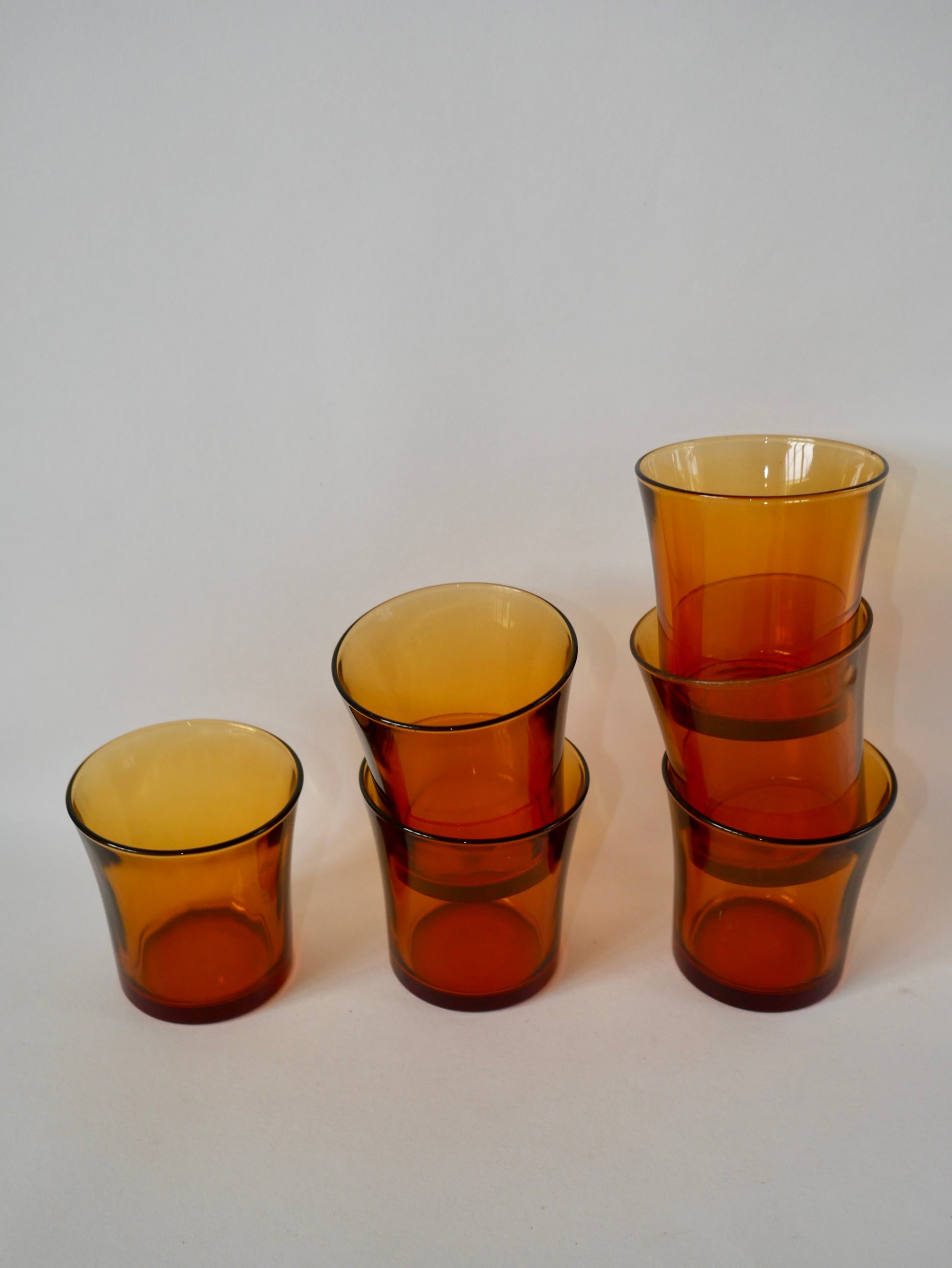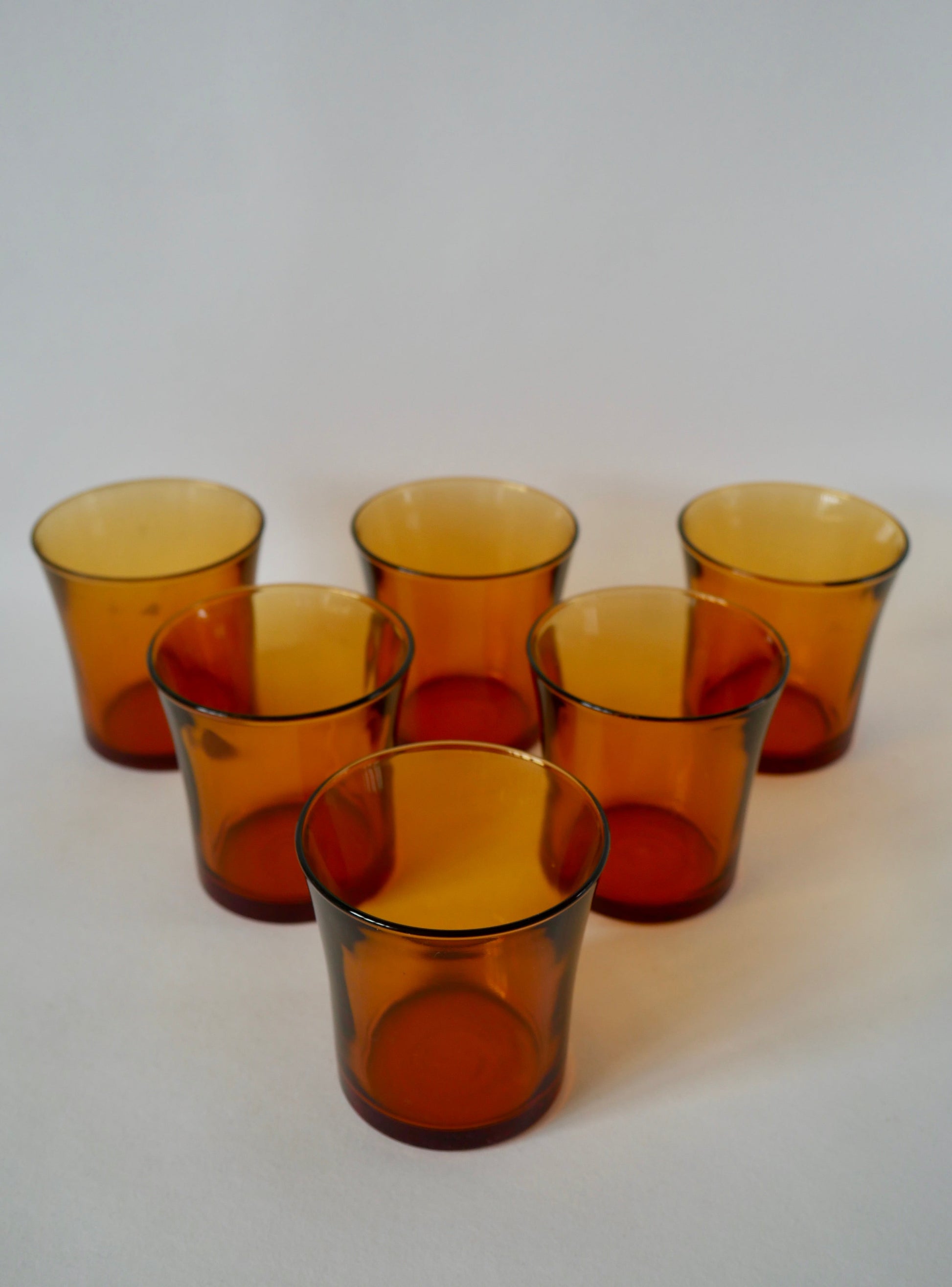 Superbe lot de 6 verres ambrés Duralex années 70. En excellent état. Dimensions : 8 X 8 X 8 cm.