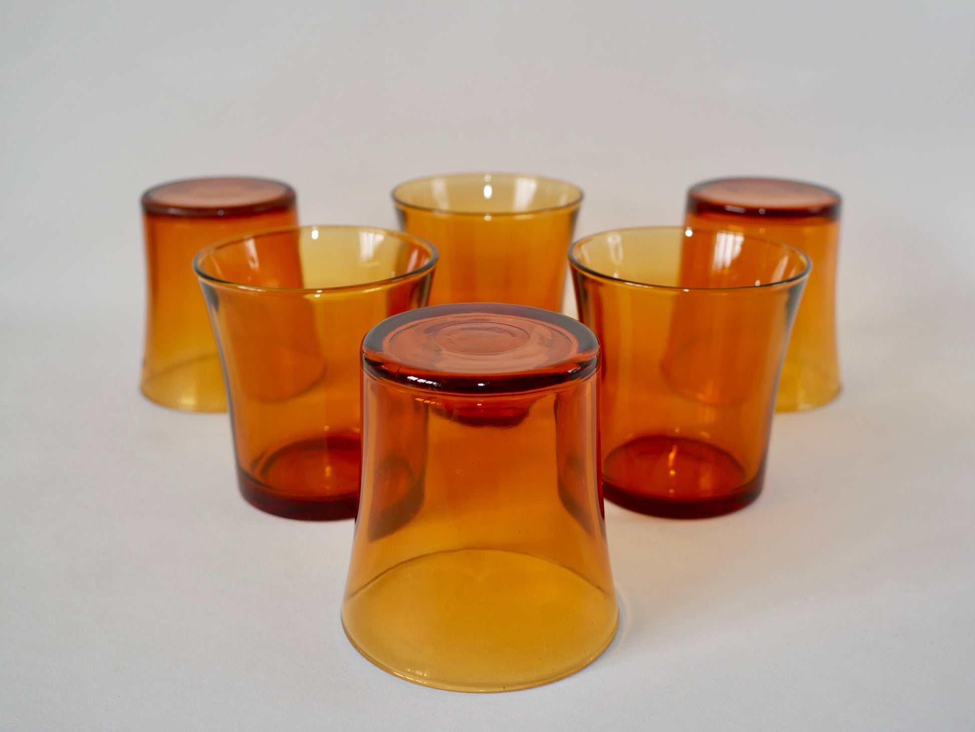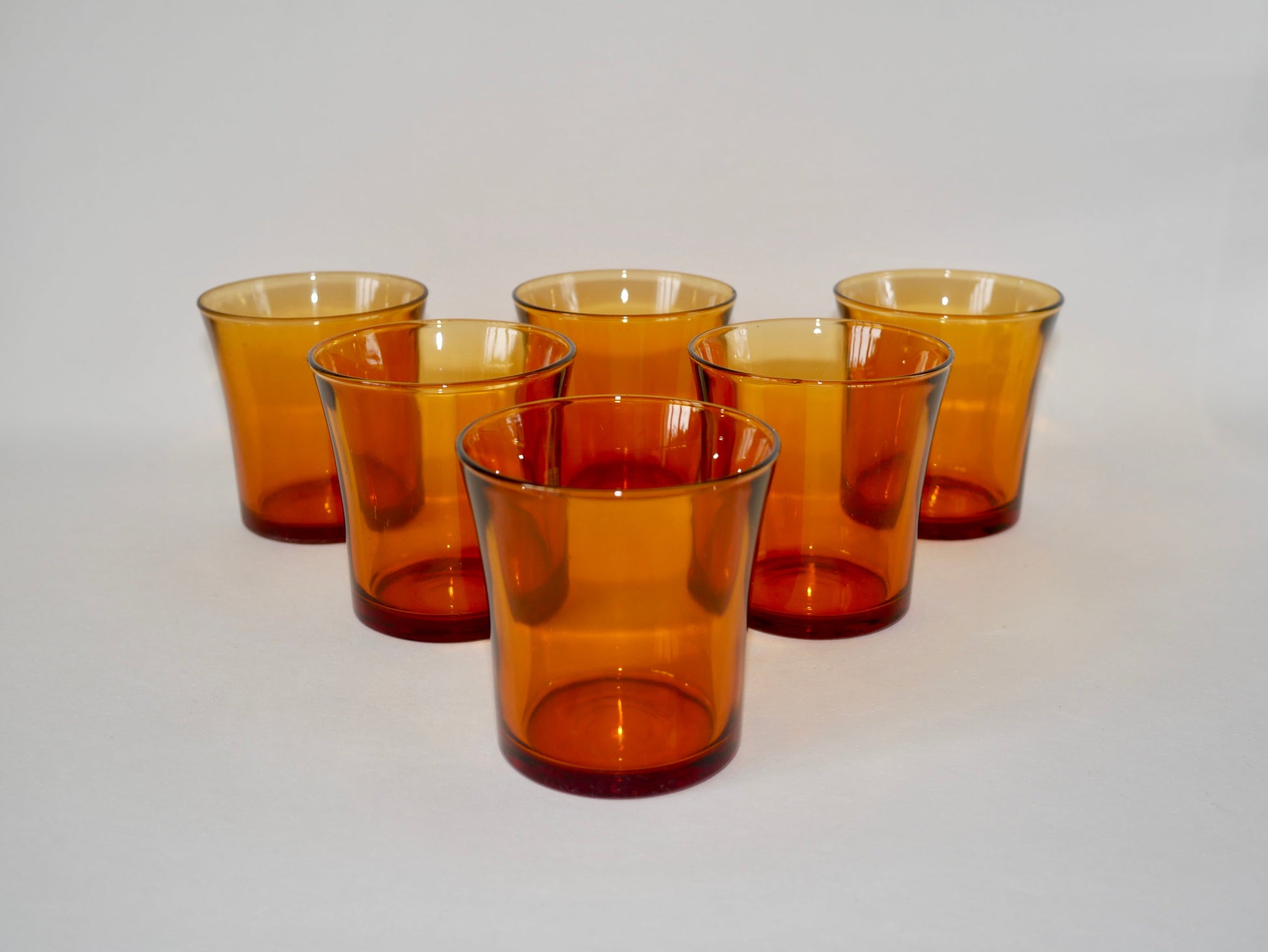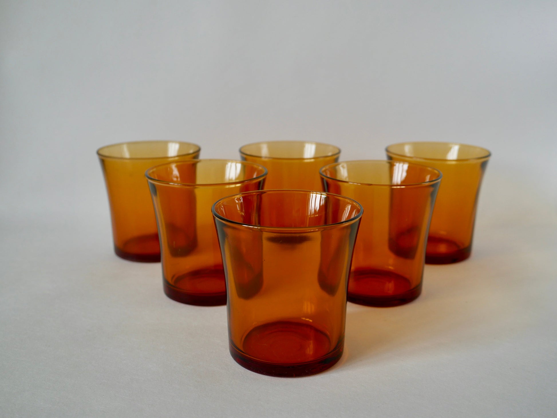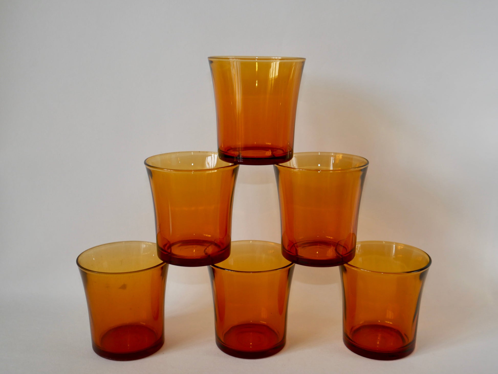 Superbe lot de 6 verres ambrés Duralex années 70. En excellent état. Dimensions : 8 X 8 X 8 cm.