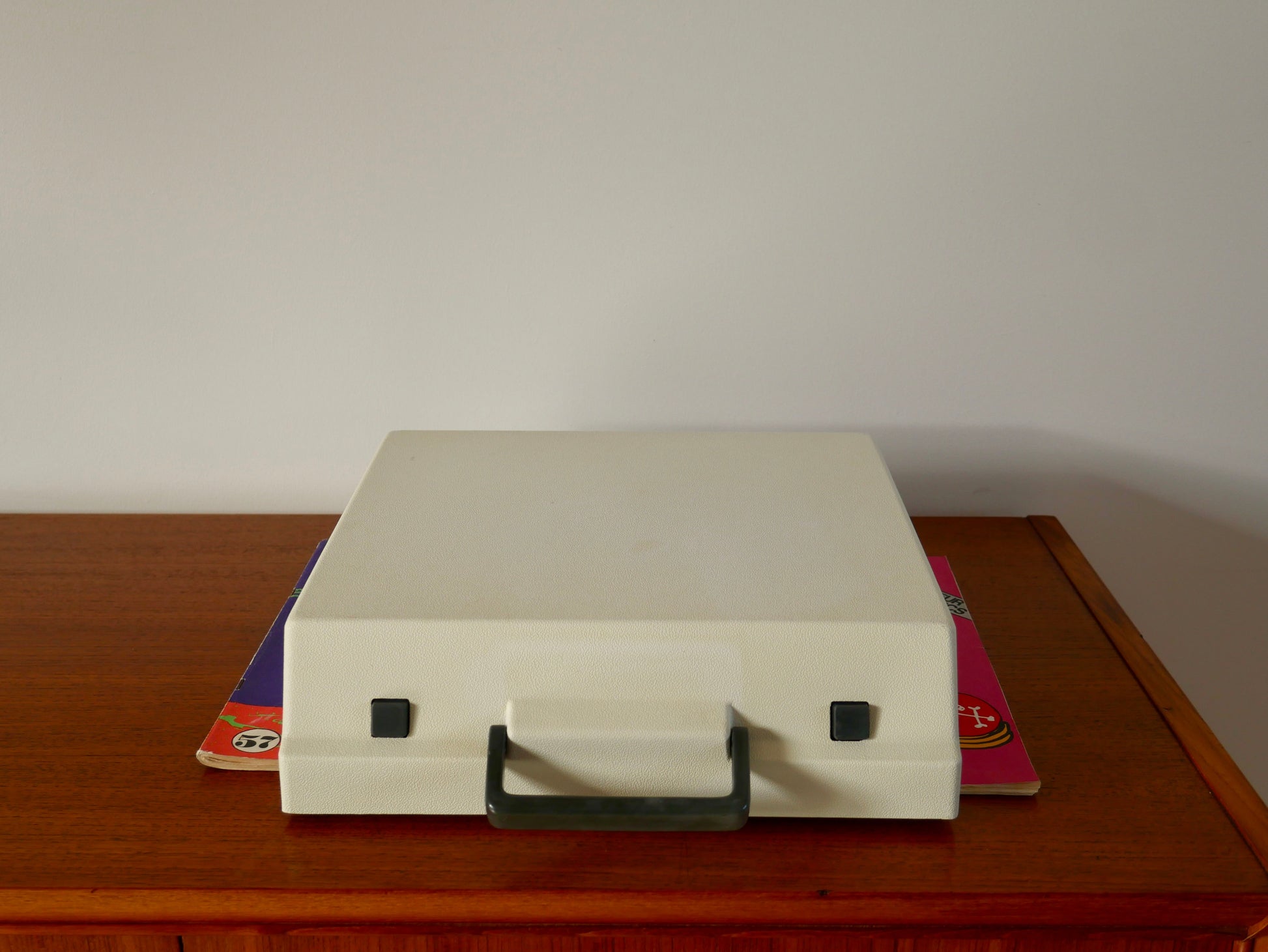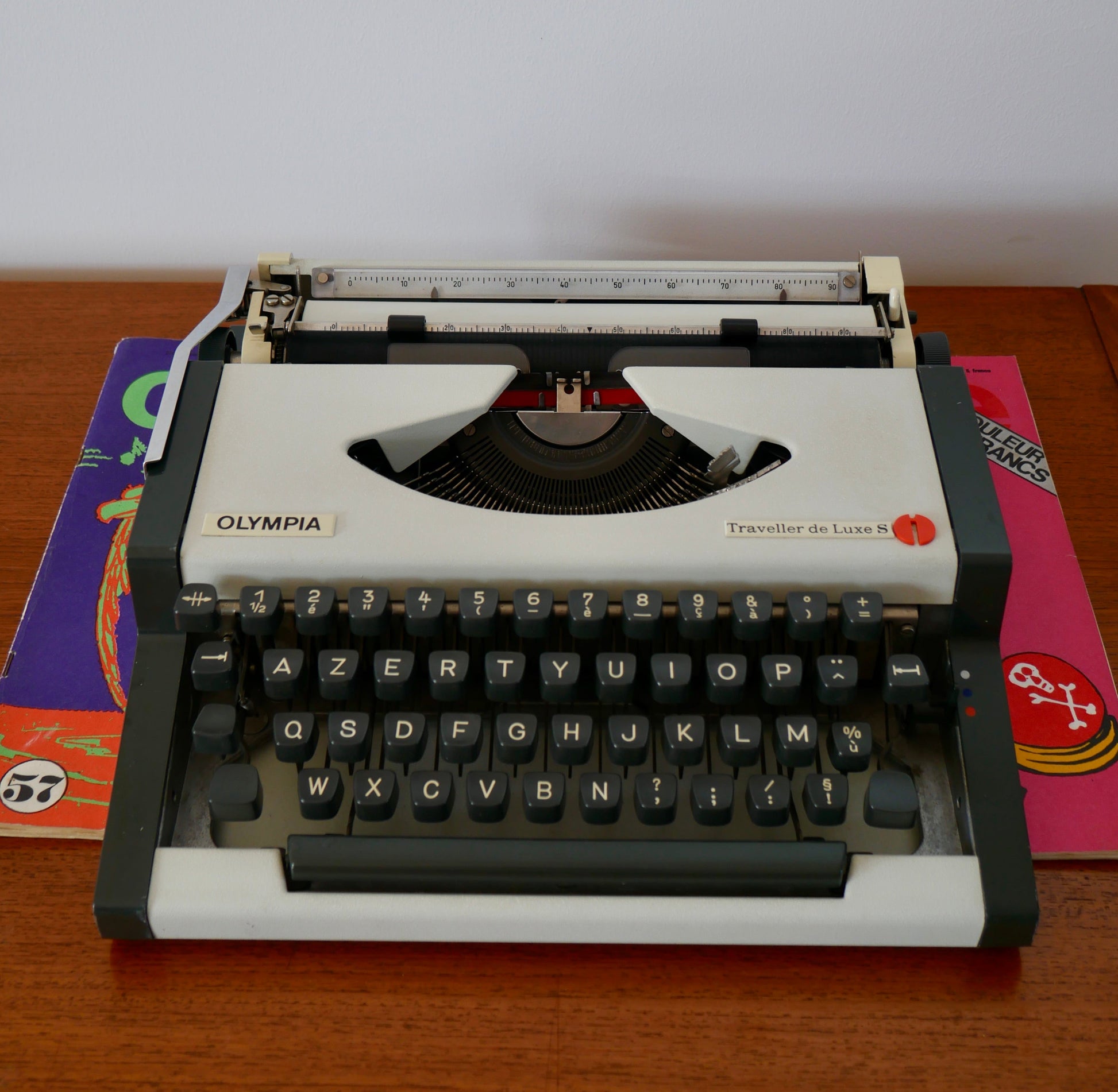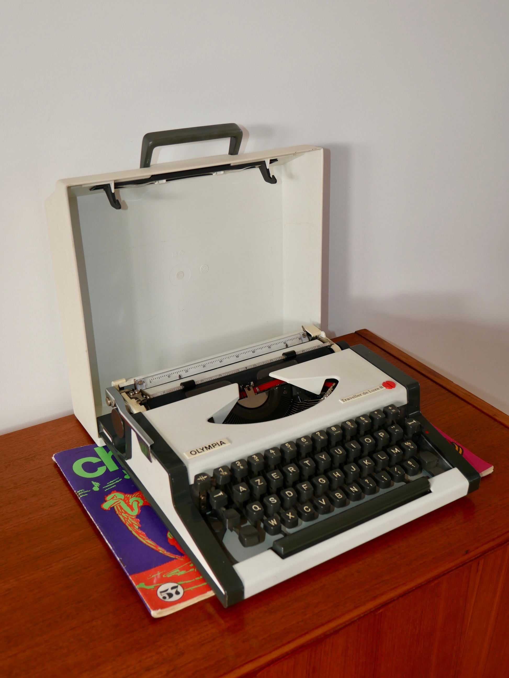 Superbe machine à écrire blanche Olympia Travaller de Luxe années 70. En très bon état, rares traces du temps. Fonctionnelle, prévoir un changement de ruban à l'usage.. Dimensions : 31 X 30 cm.