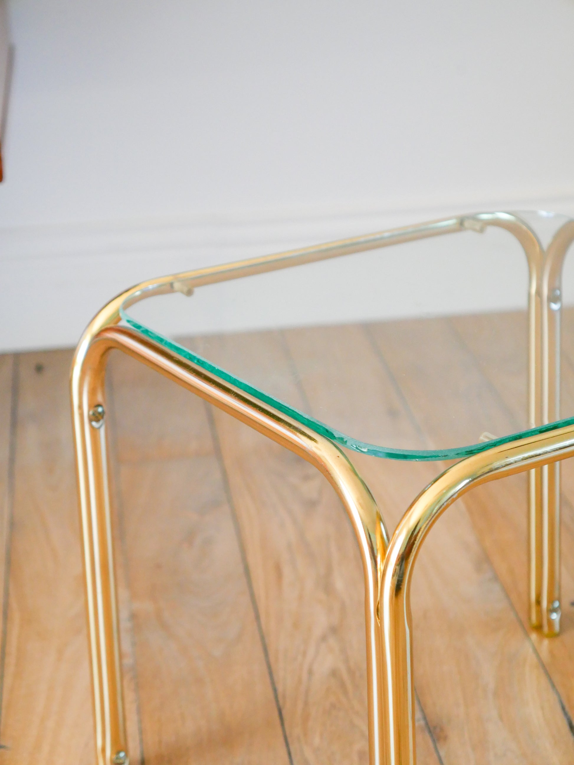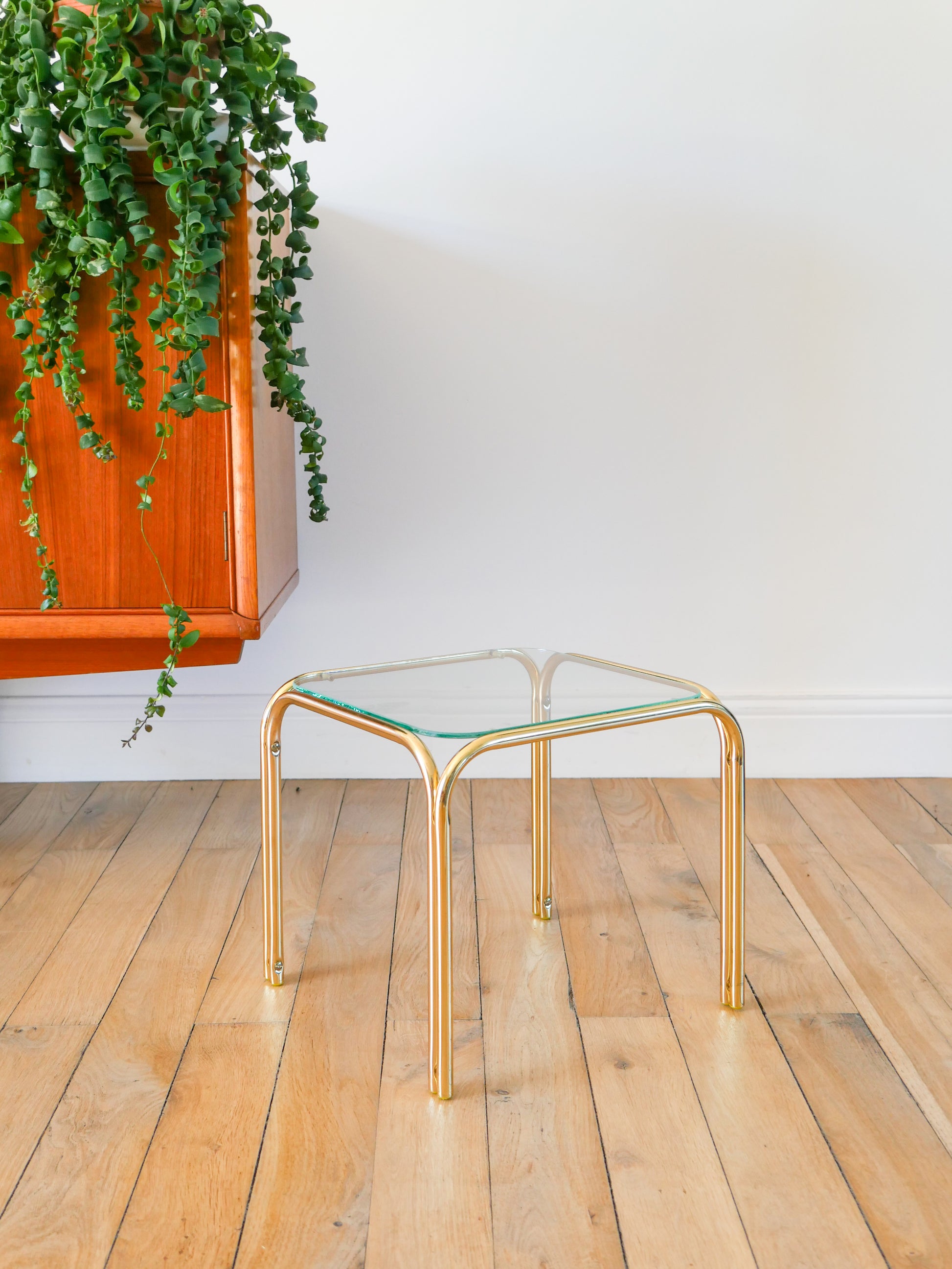 Jolie mini table basse en laiton doré et verre, 1980. En très bon état, de rares traces du temps. Envoi rapide et soigné. Possibilité d'envois groupés - plus économique et plus écologique ! Dimensions : 30 X 30 X 28 cm.