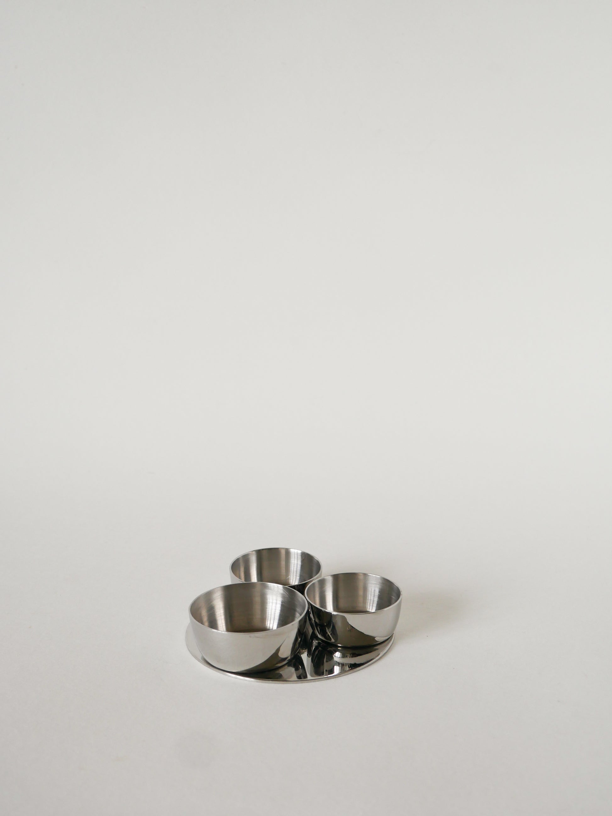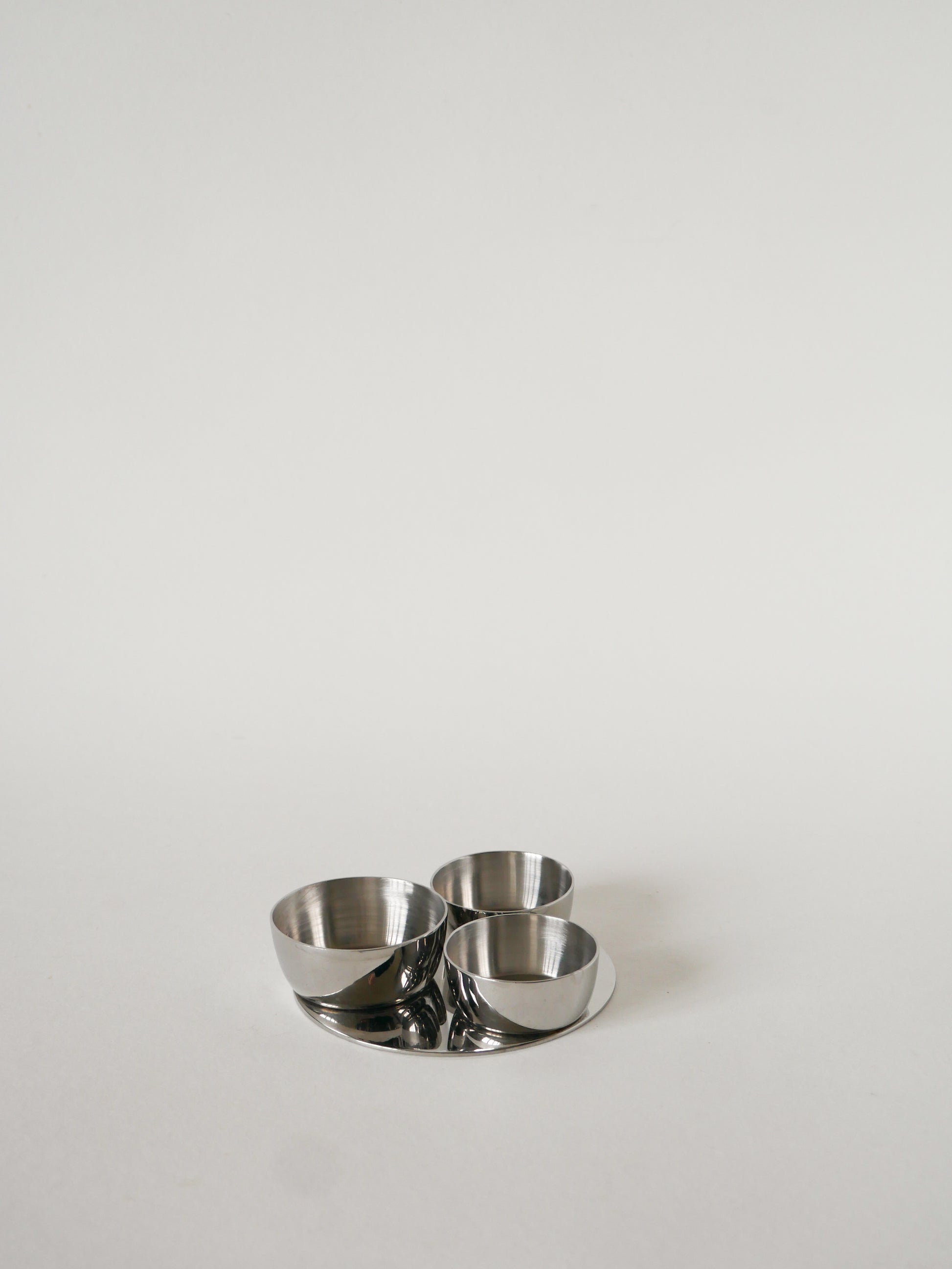 Joli mini triple présentoir en inox, Design, 1970. En très bon état, de rares traces du temps. Envoi rapide et soigné. Possibilité d'envois groupés - plus économique et plus écologique ! Dimensions : 10 X 2 cm.