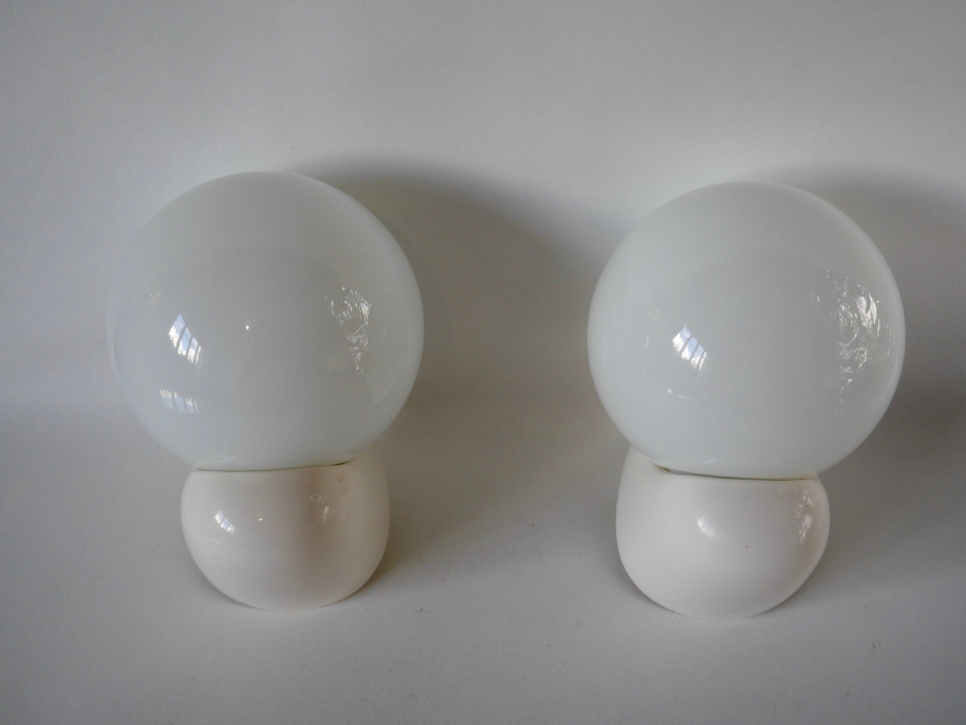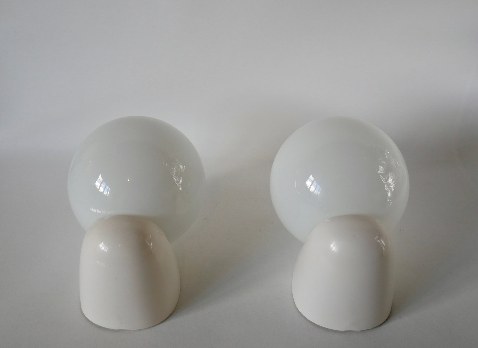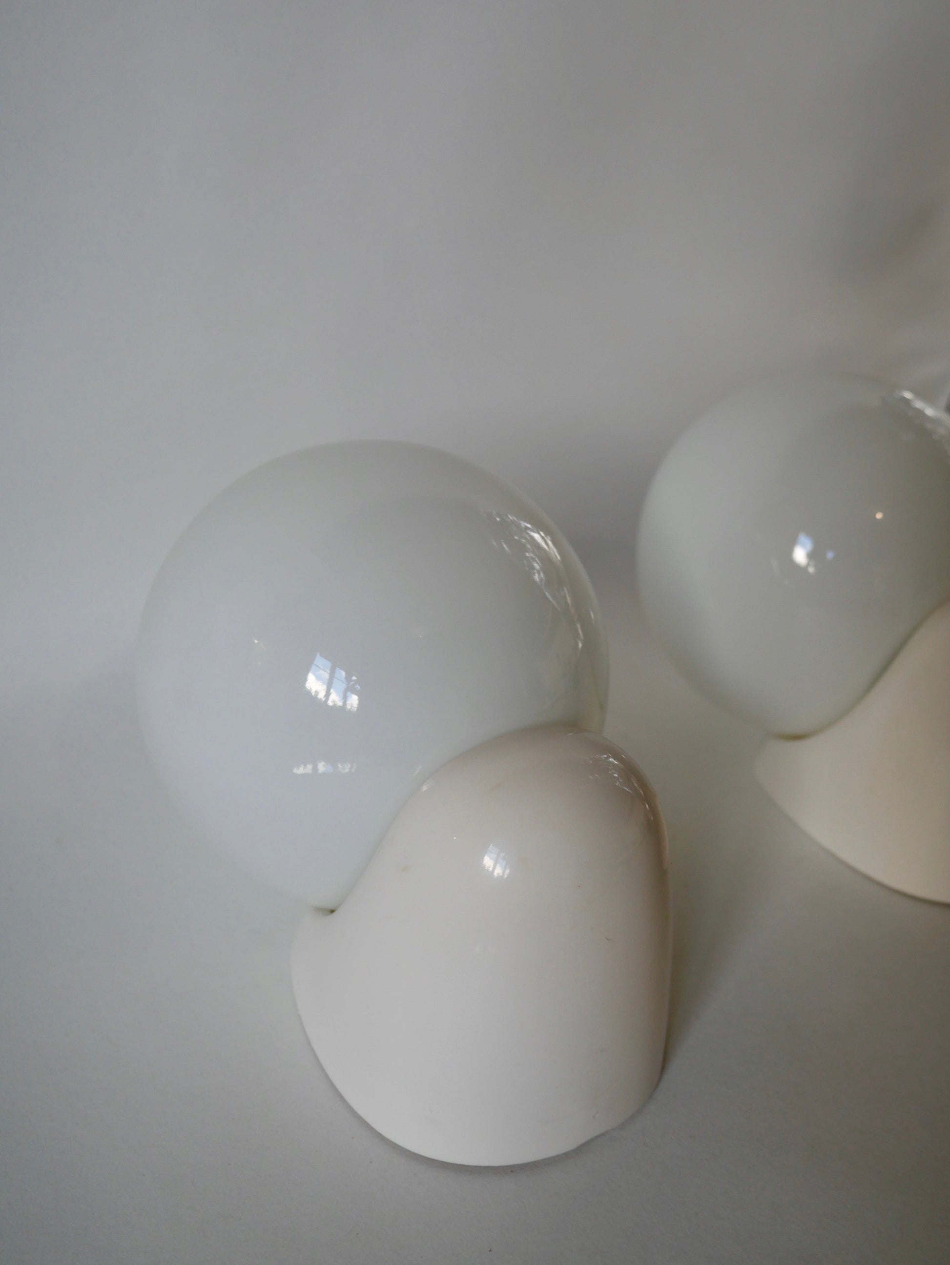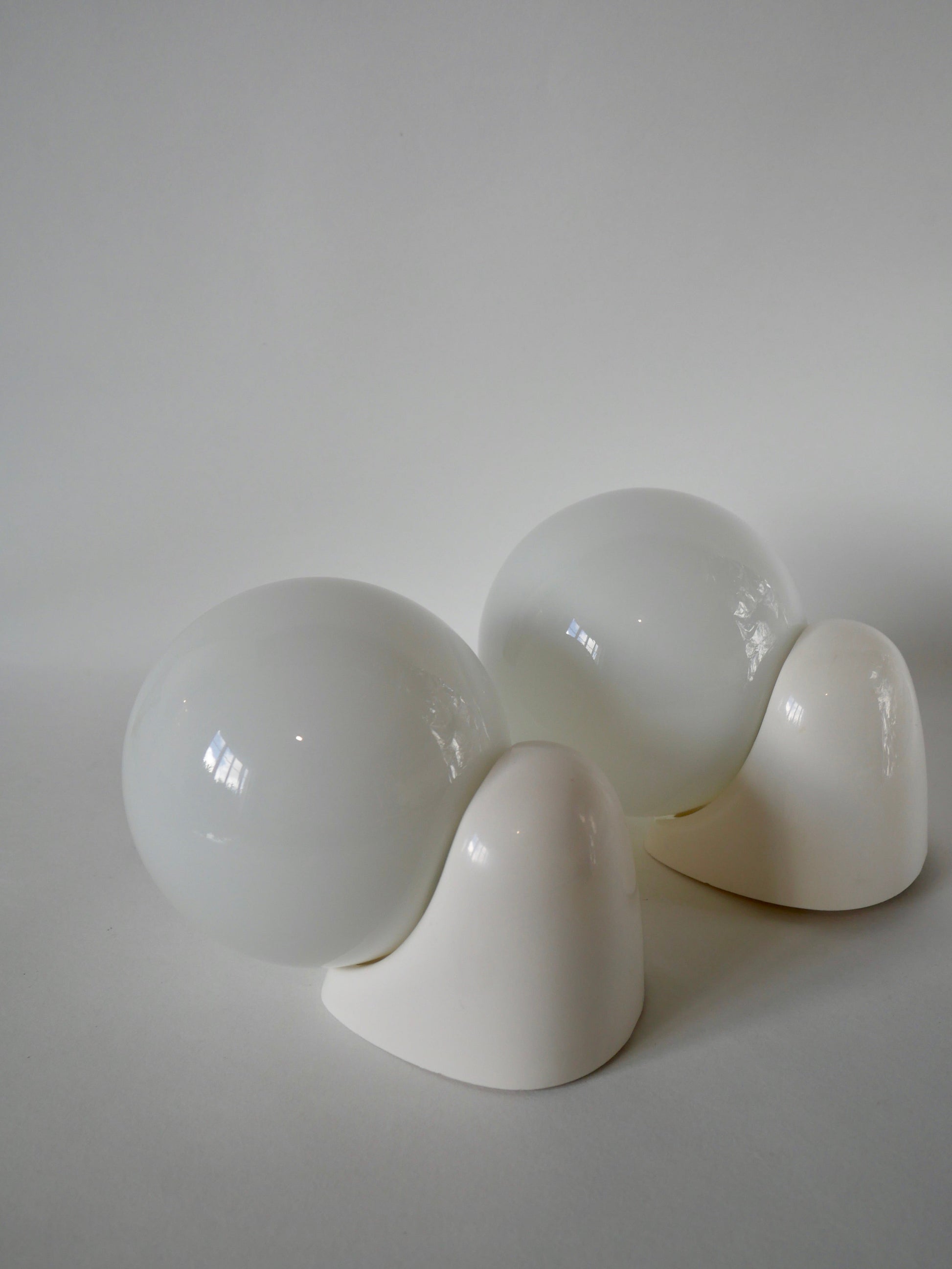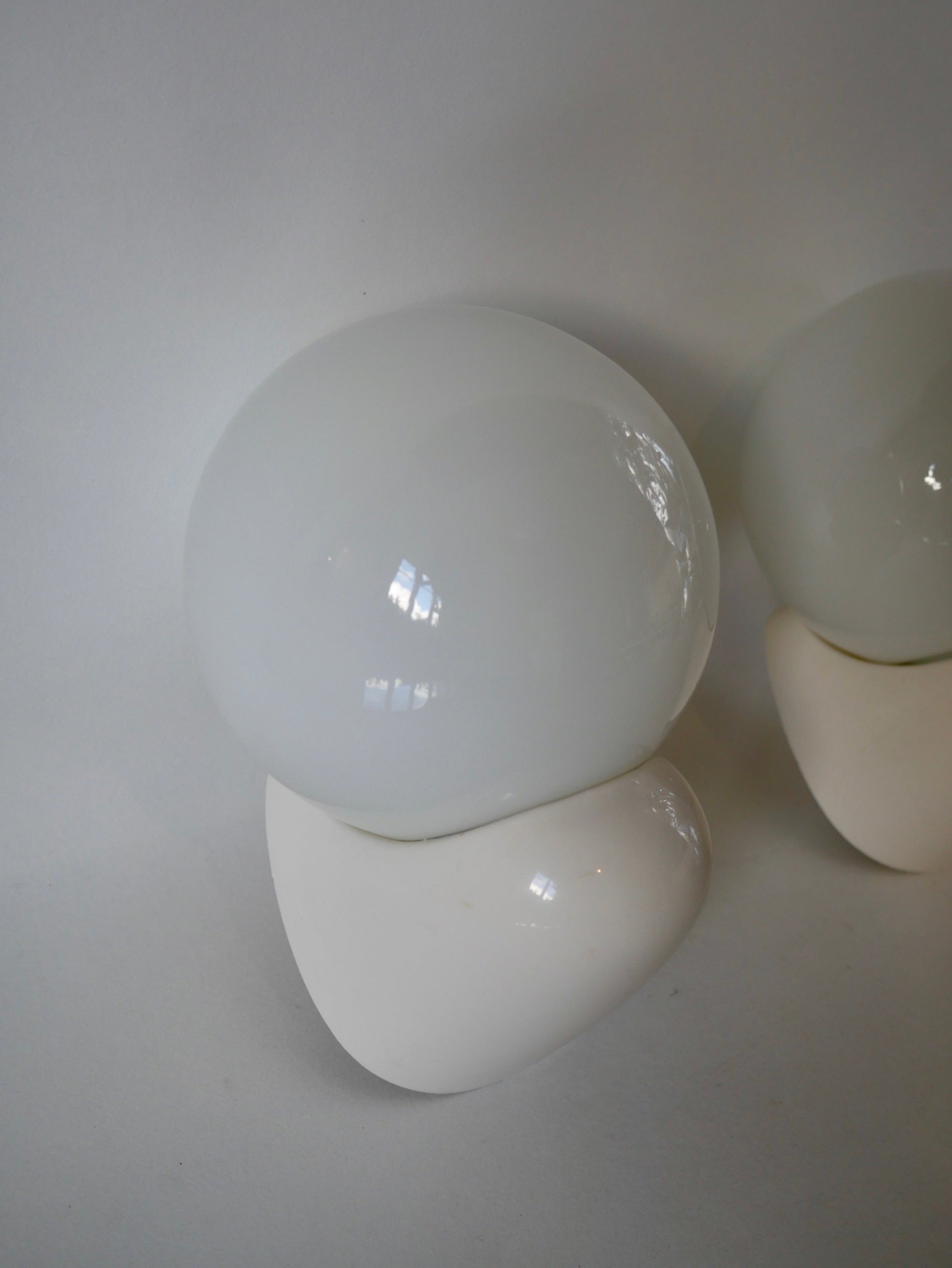 Magnifique paire d'appliques murales design Tissot Space Age opaline et plexi Made in France modèle déposé années 70. En excellent état. Dimensions : 13 X 17 cm et socle 10 X 8 cm..