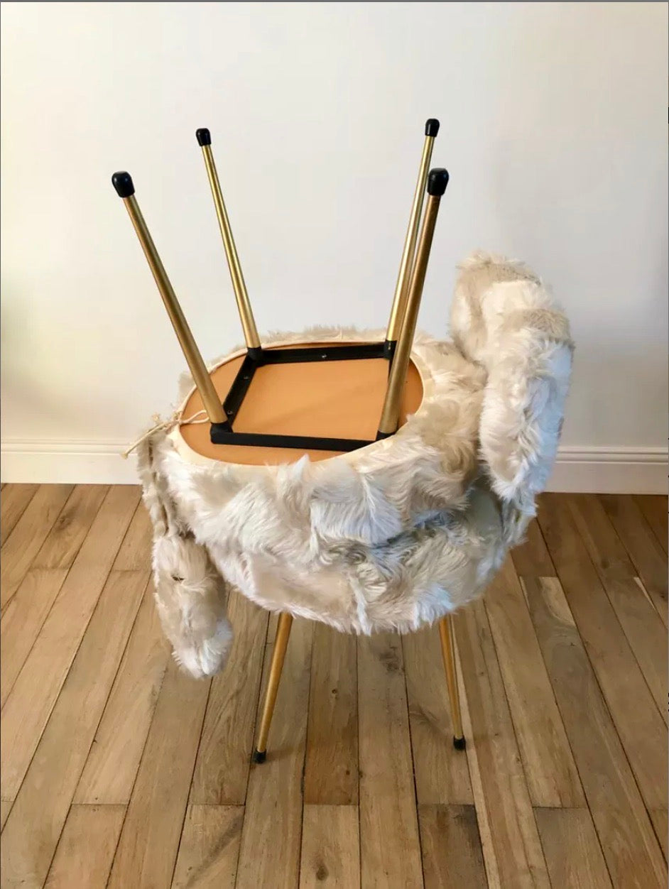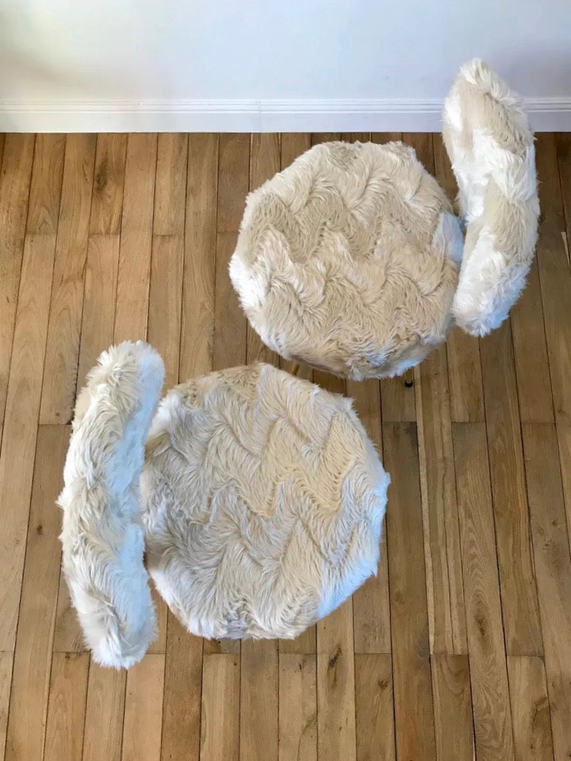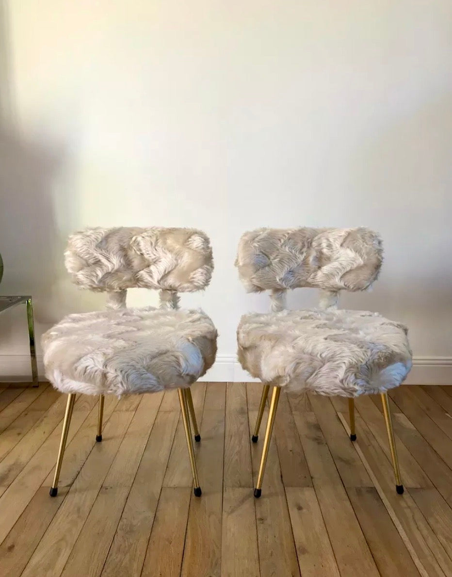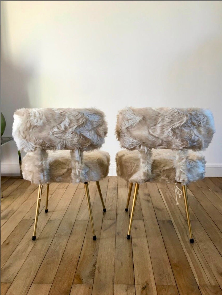 Magnifique paire de chaises moumoute Pelfran beige années 60-70. En excellent état. Dimensions : 68 X 44 X 41 cm.