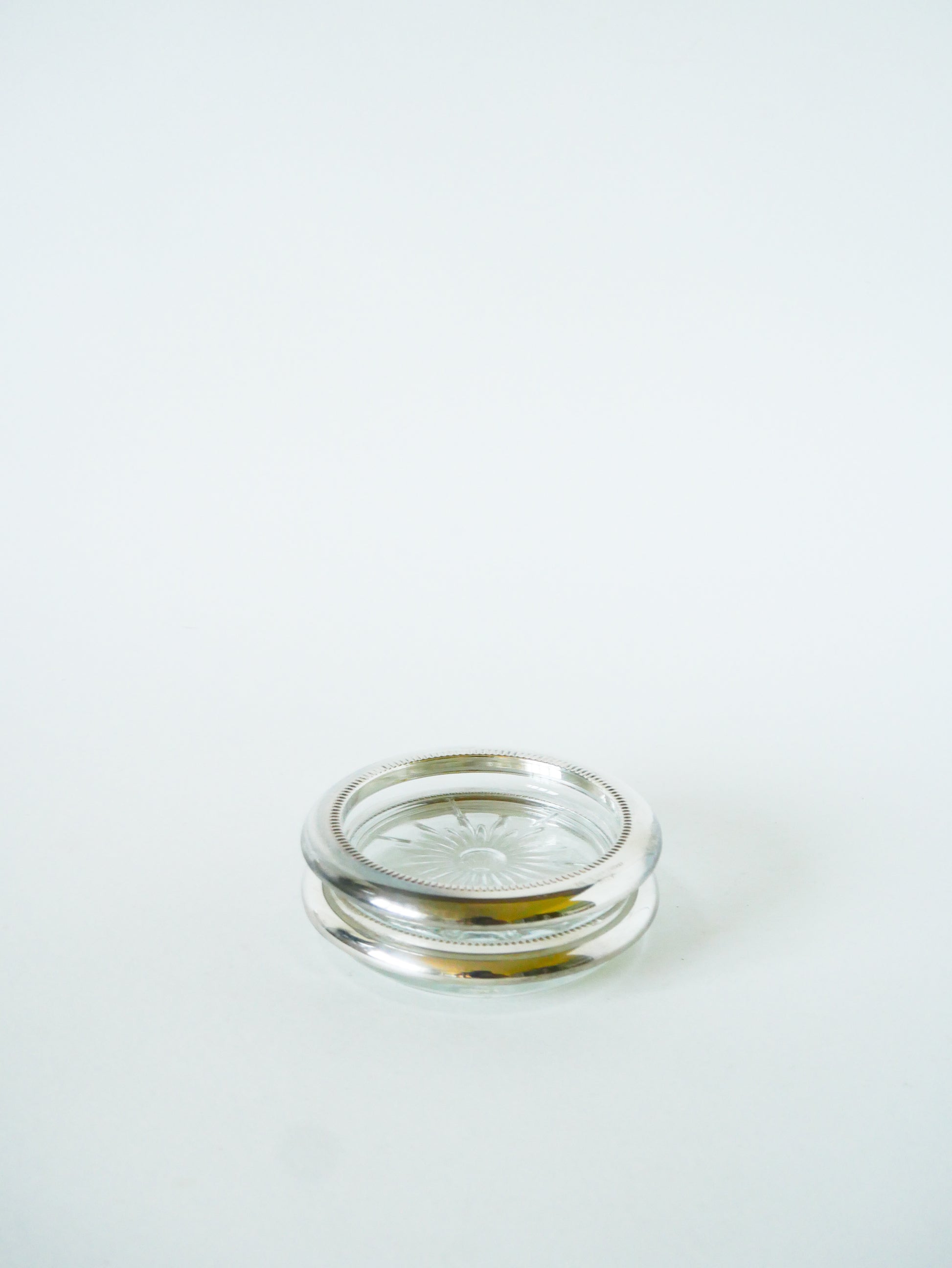 Joli paire de dessous de bouteille, en verre & chrome, 1950 . En très bon état, de rares traces du temps. Envoi rapide et soigné. Possibilité d'envois groupés - plus économique et plus écologique ! Dimensions : 10 cm.