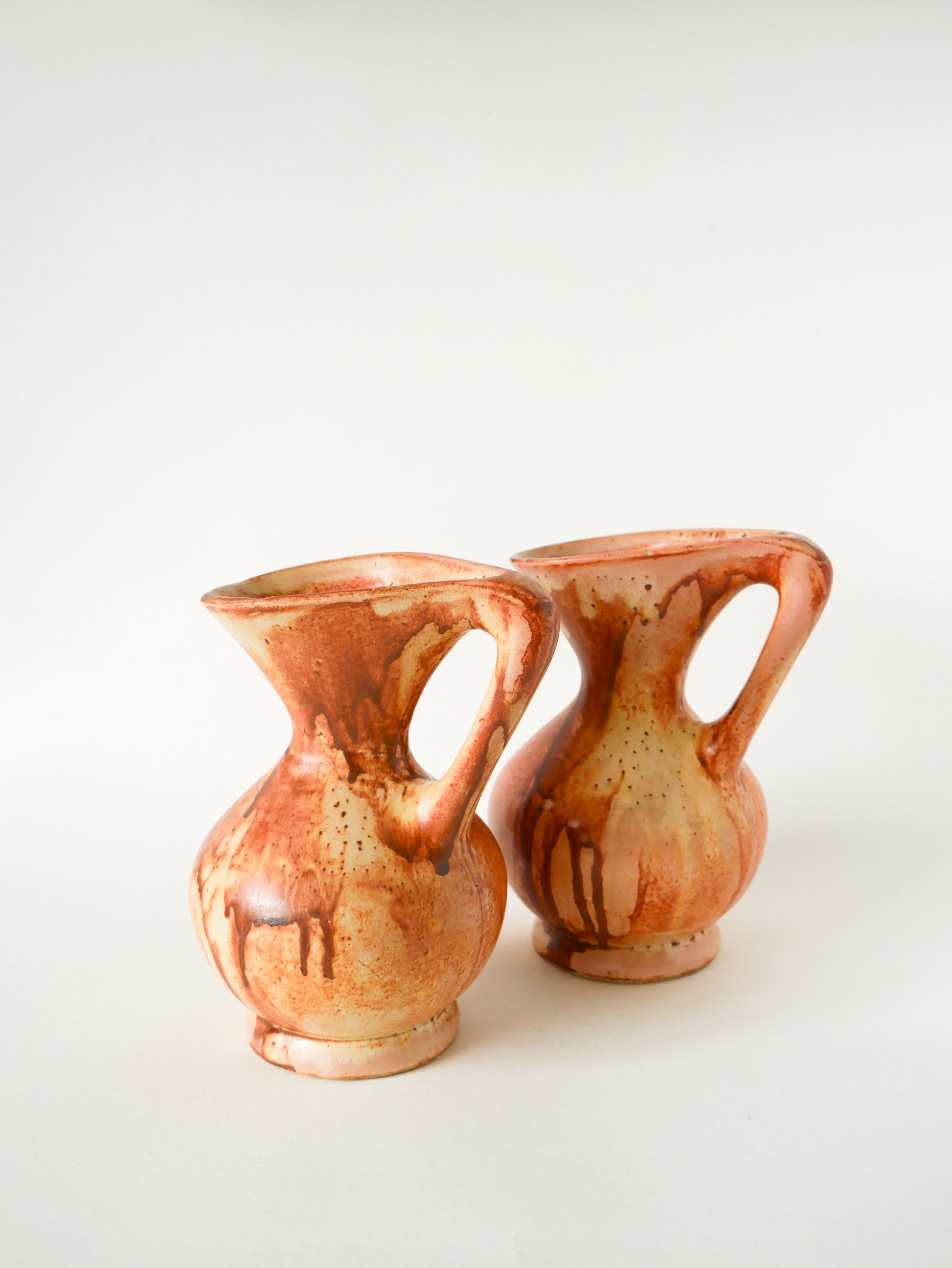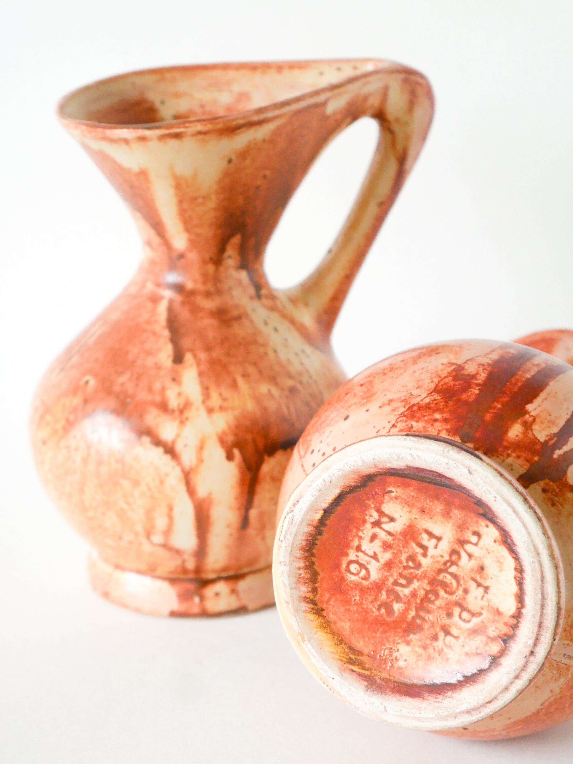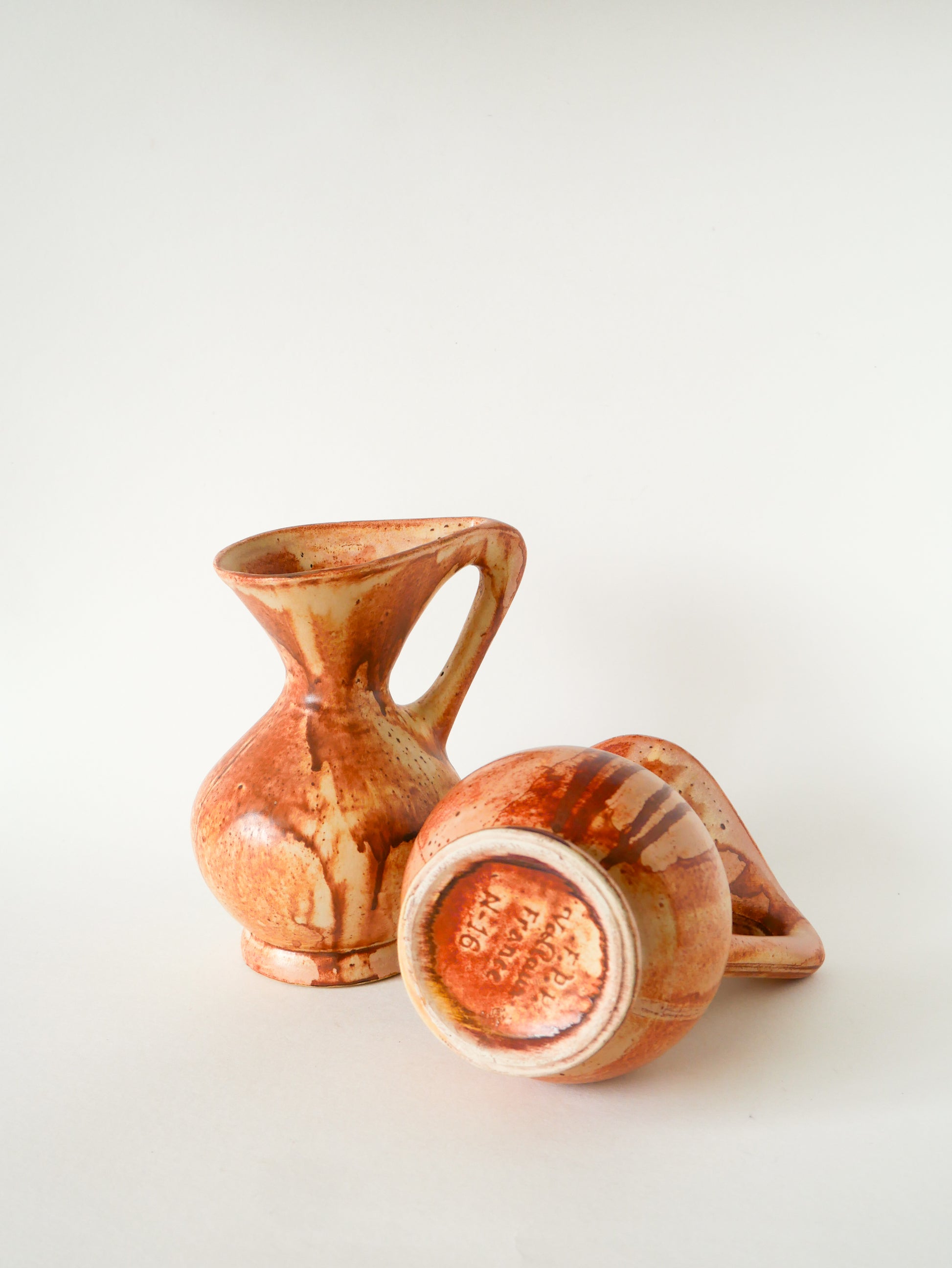 Jolie paire de pichets en grès signés Vallauris, Graphiques, 1970. En excellent état. Envoi rapide et soigné. Possibilité d'envois groupés - plus économique et plus écologique ! Dimensions : 21 X 16.5 cm.